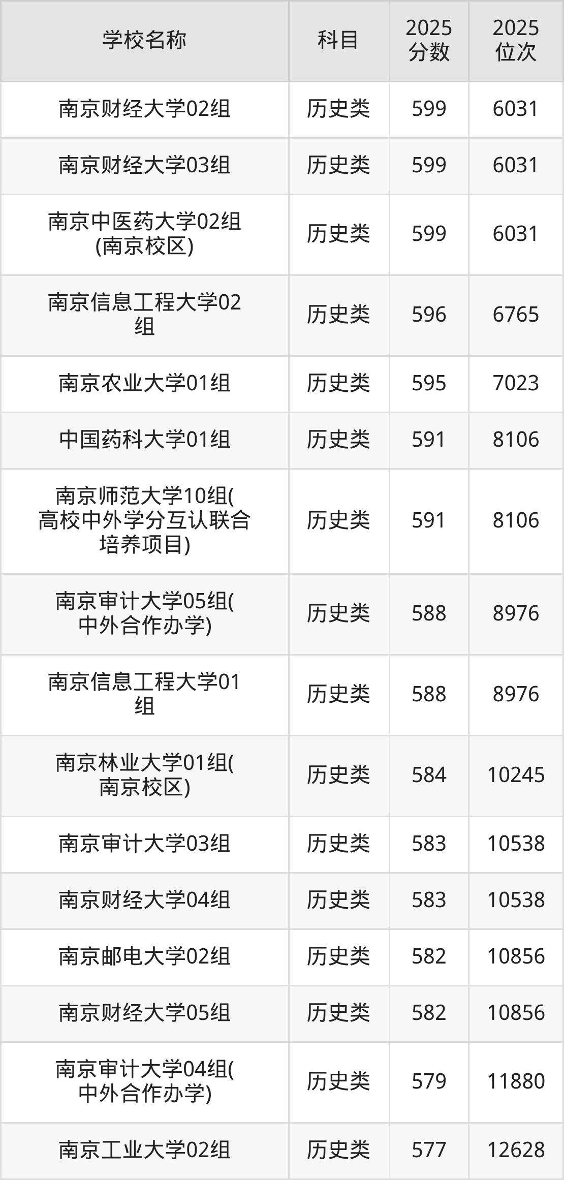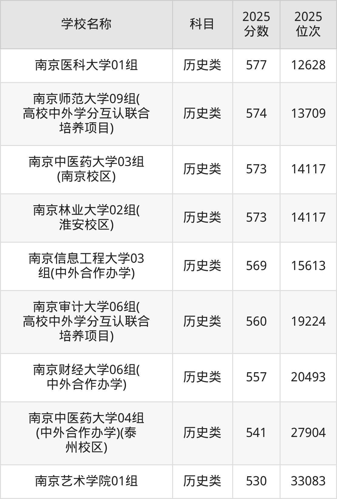 下文为2025年南京市一本大学在江苏历史类录取分数线和位次排名表,供大家参考: