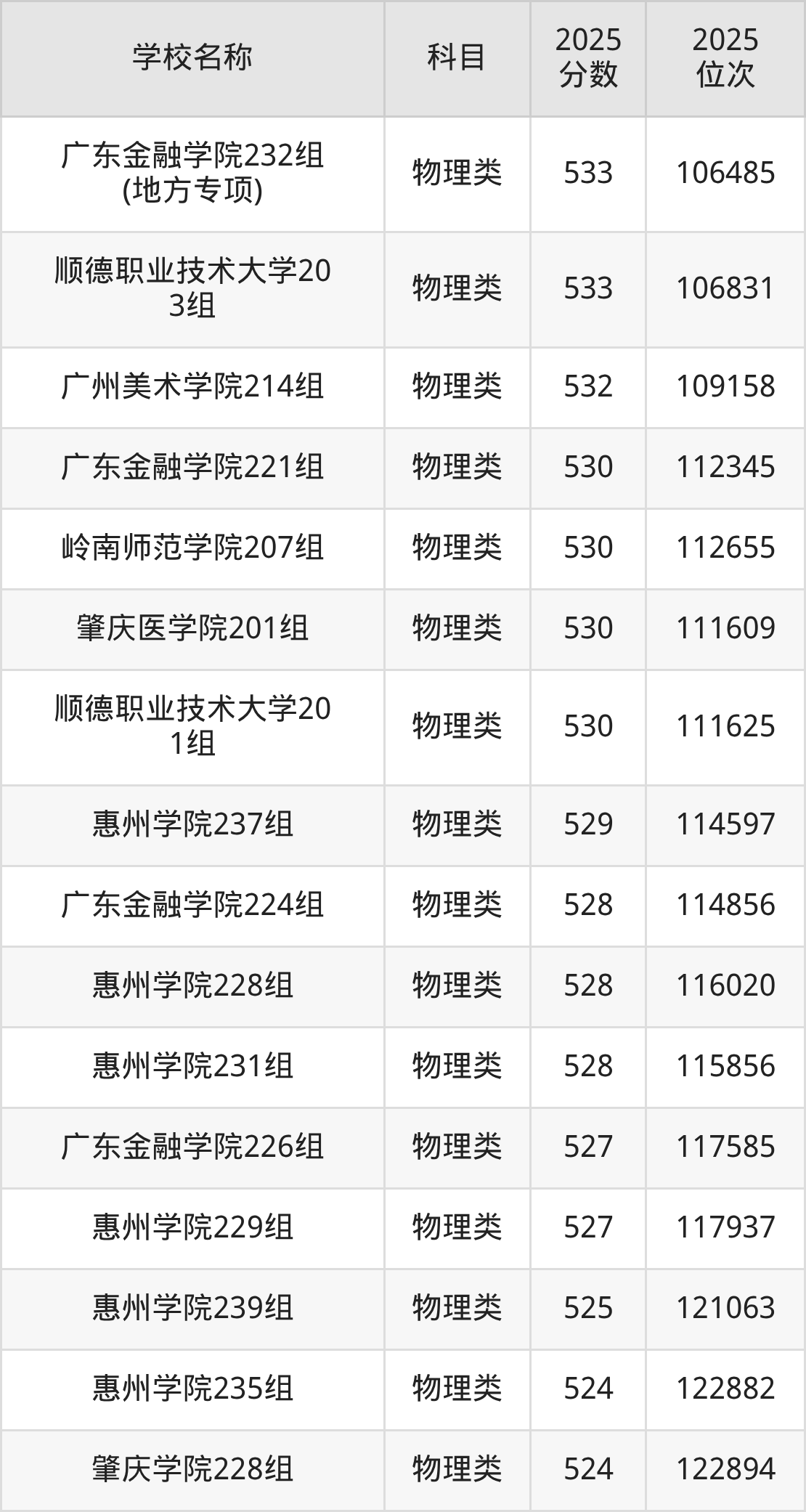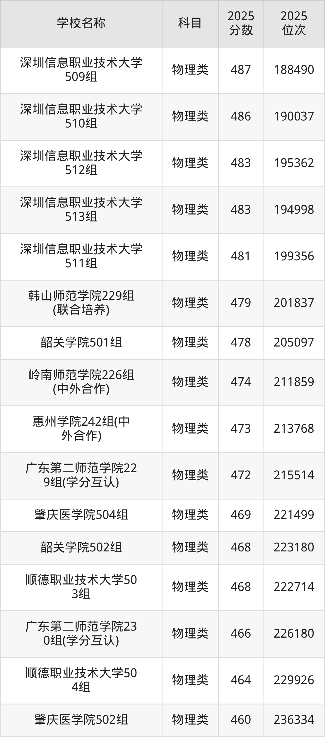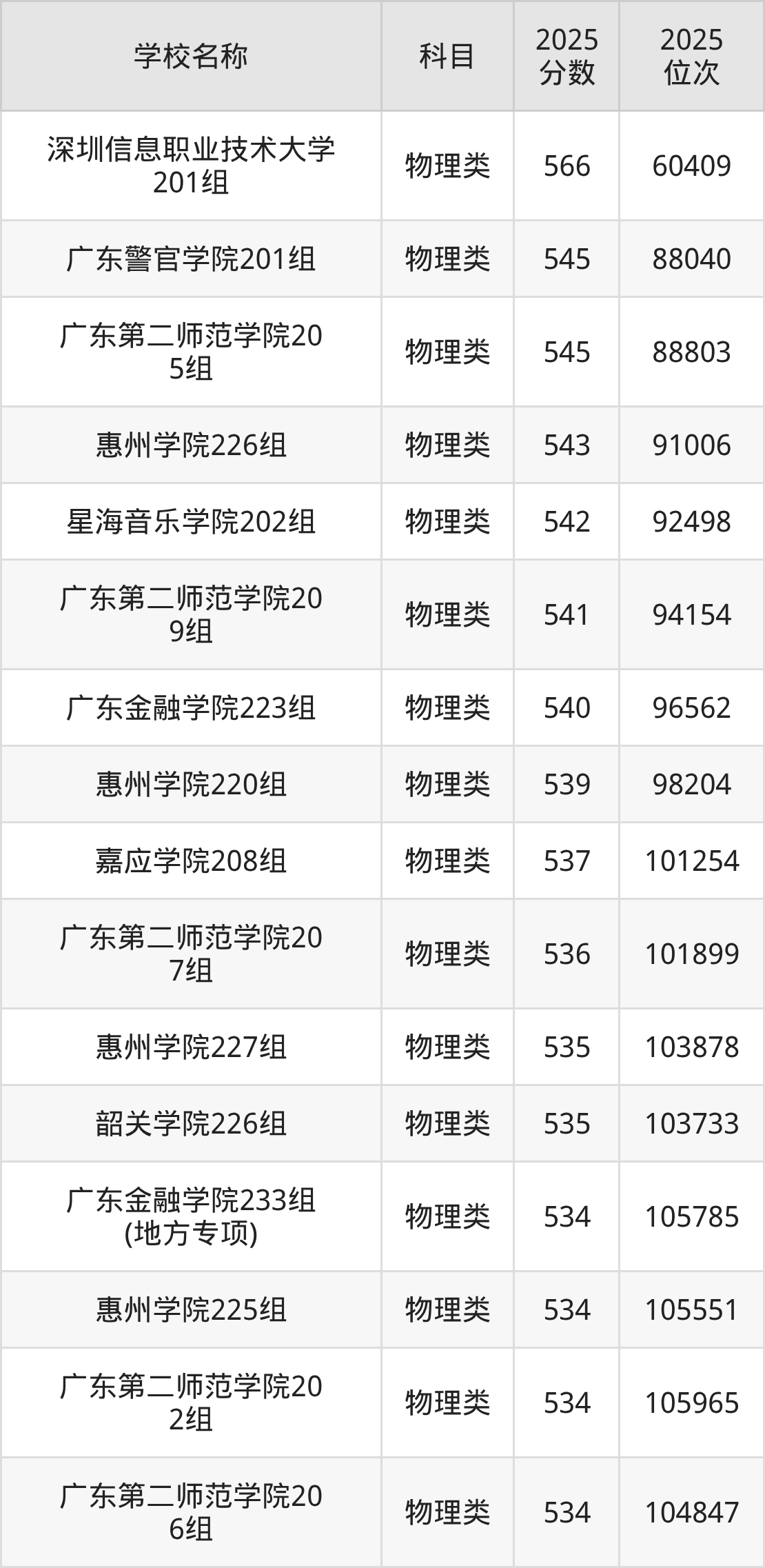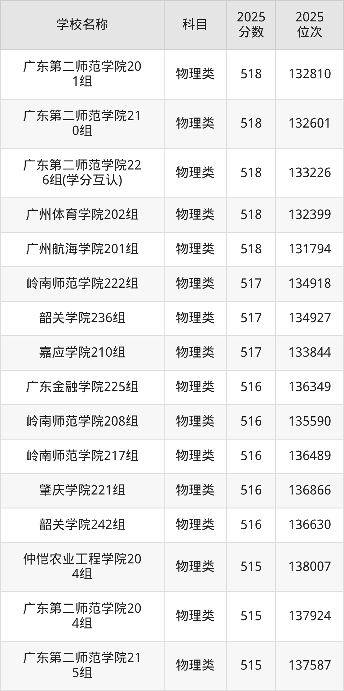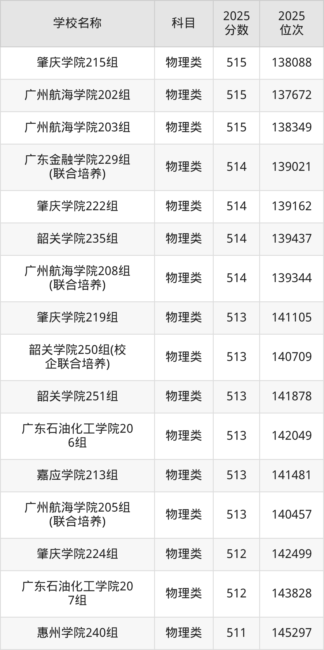 下文为2025年广东省公办二本大学在广东物理类录取分数线和位次排名表,供大家参考: