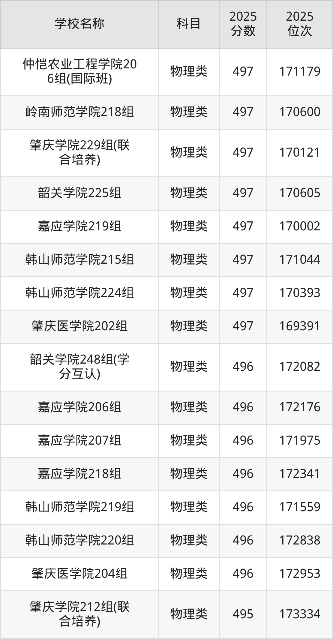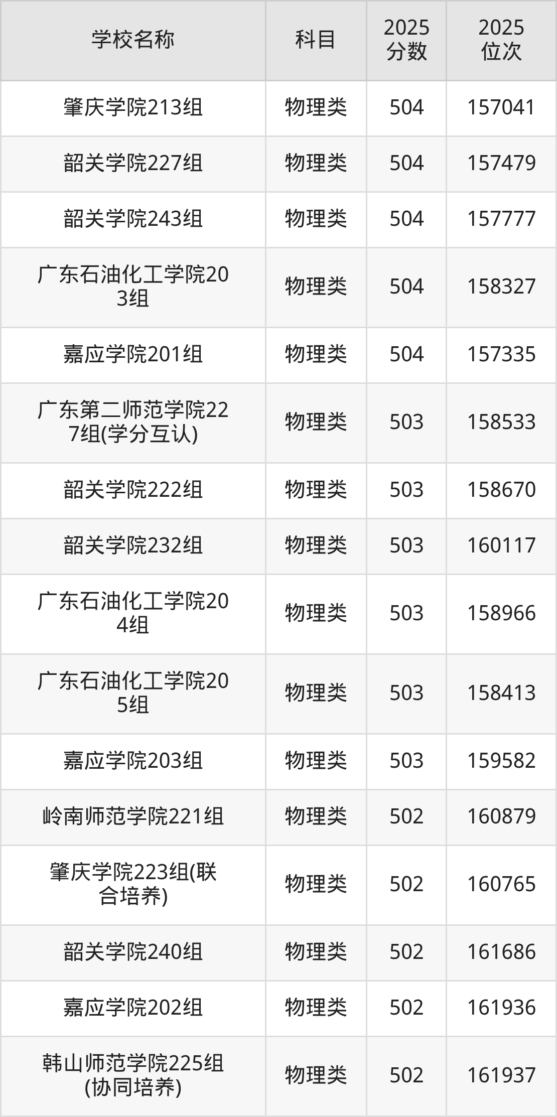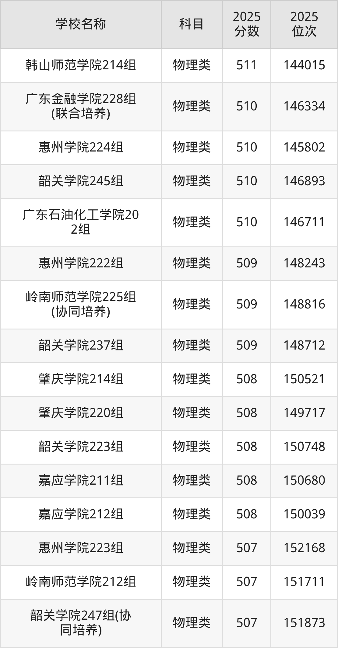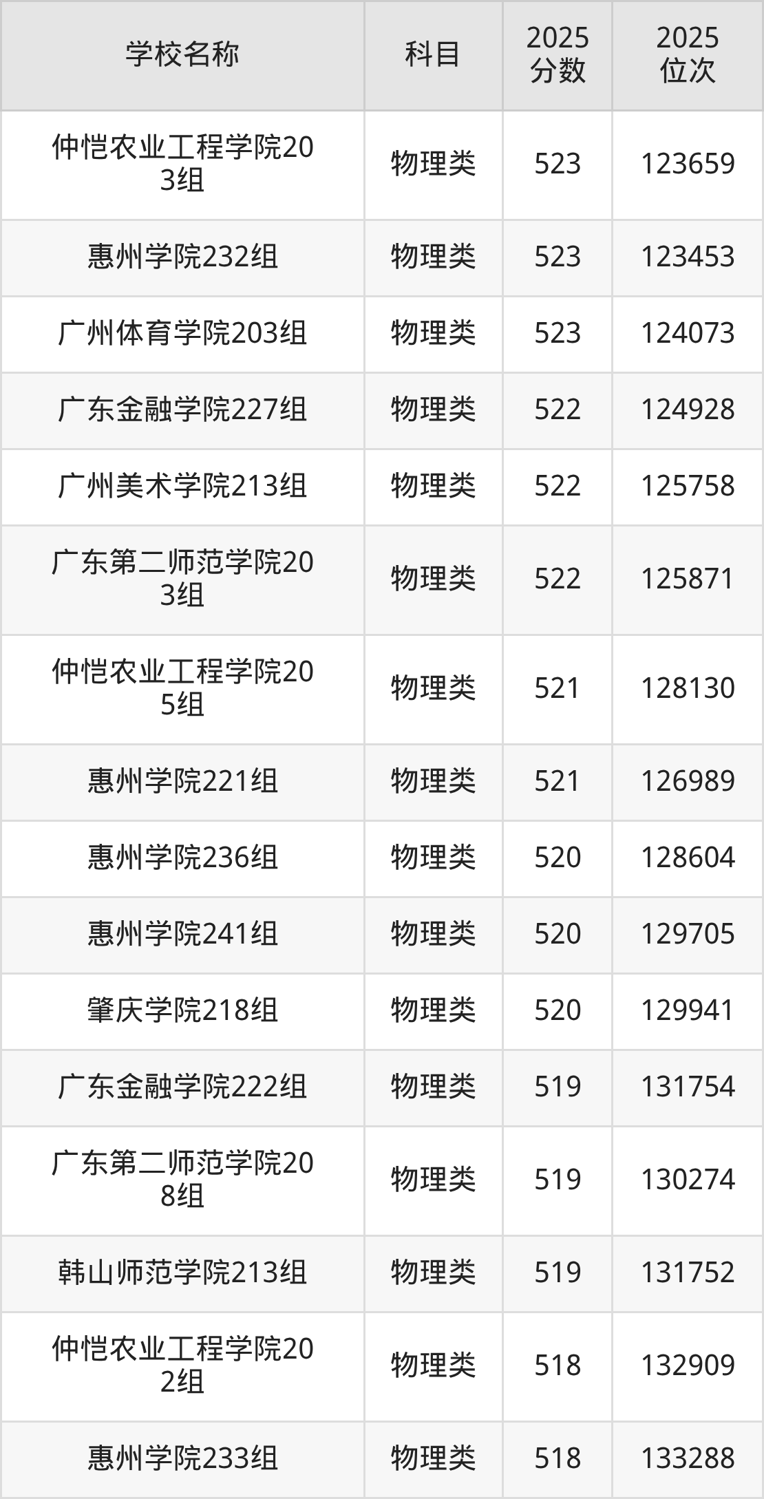 下文为2025年广东省公办二本大学在广东物理类录取分数线和位次排名表,供大家参考: