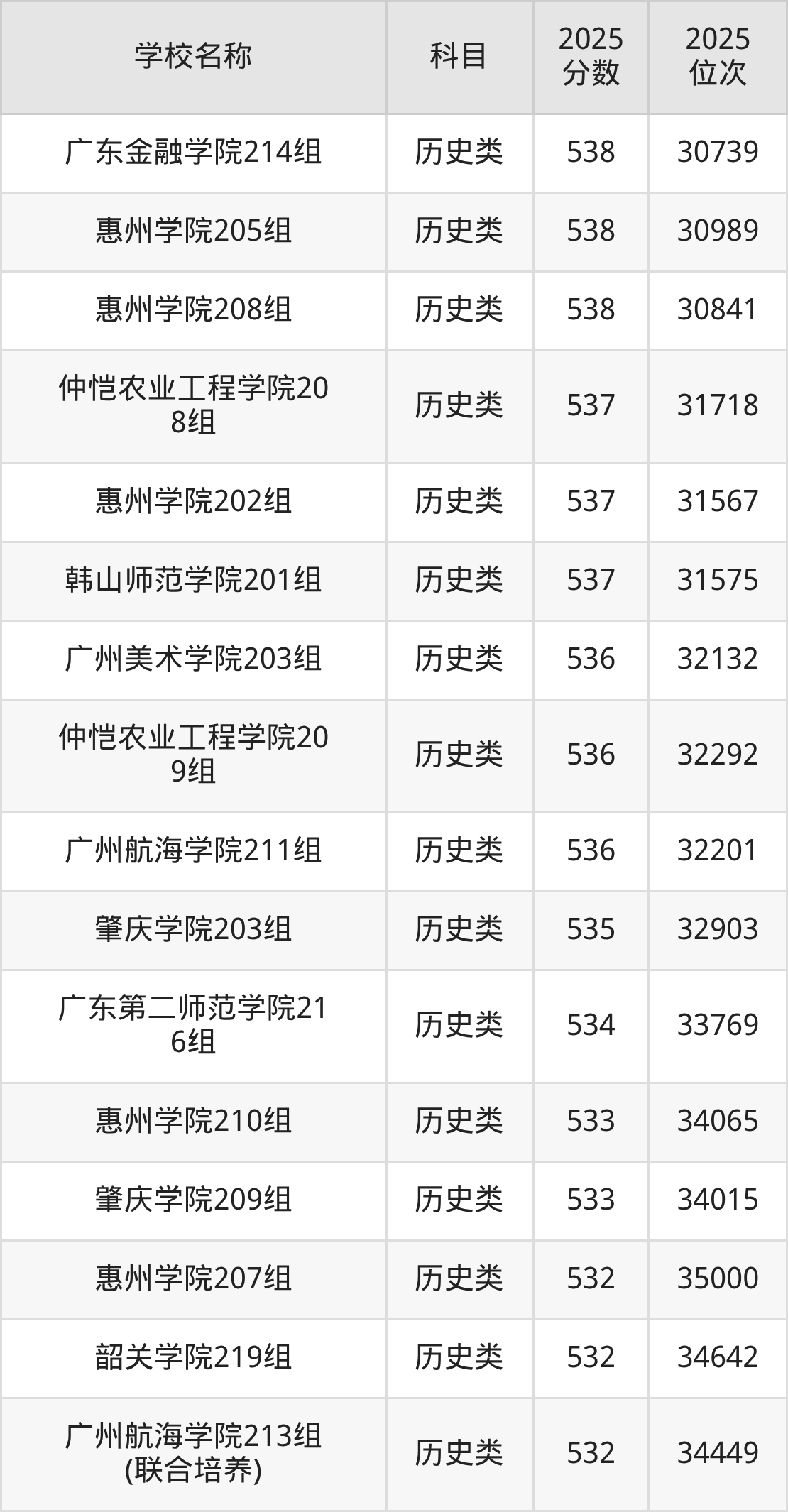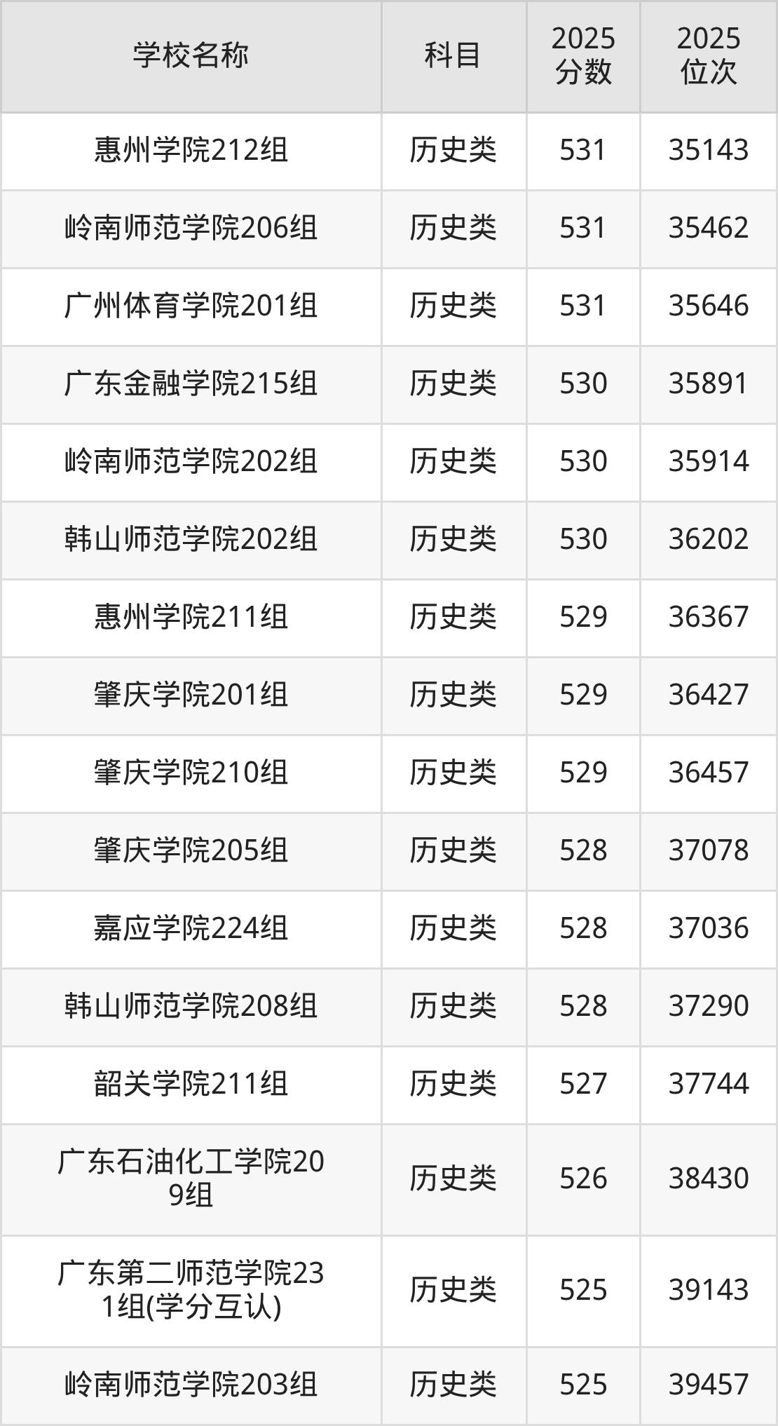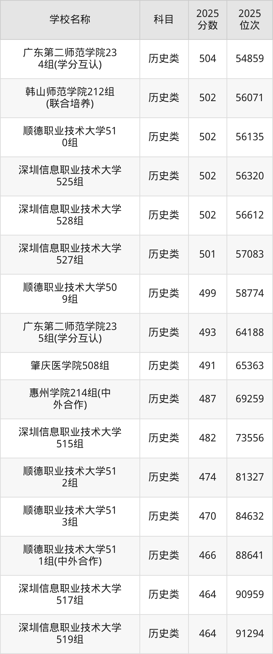 下文为2025年广东省公办二本大学在广东历史类录取分数线和位次排名表,供大家参考: