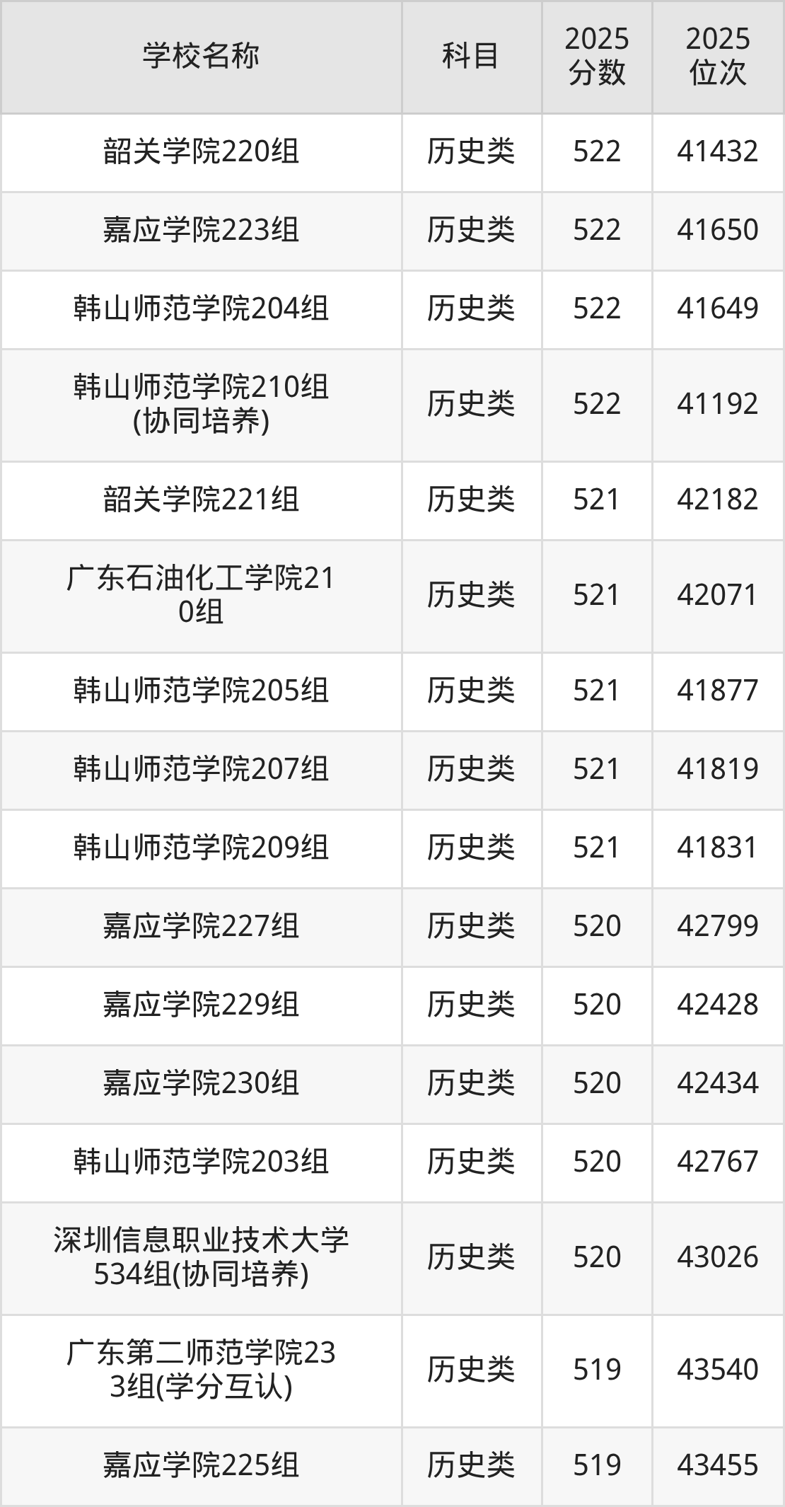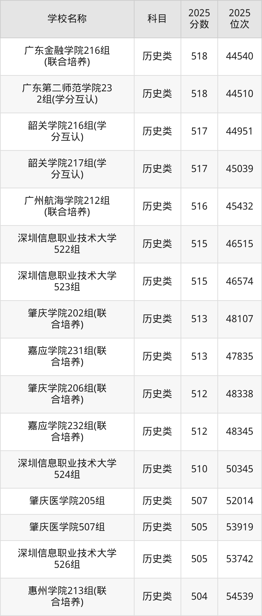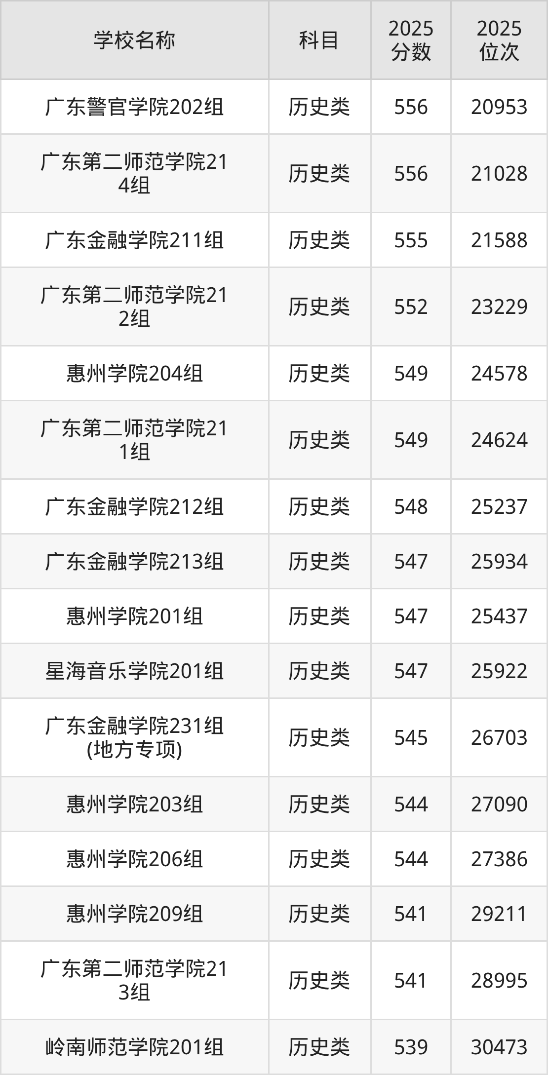下文为2025年广东省公办二本大学在广东历史类录取分数线和位次排名表,供大家参考: