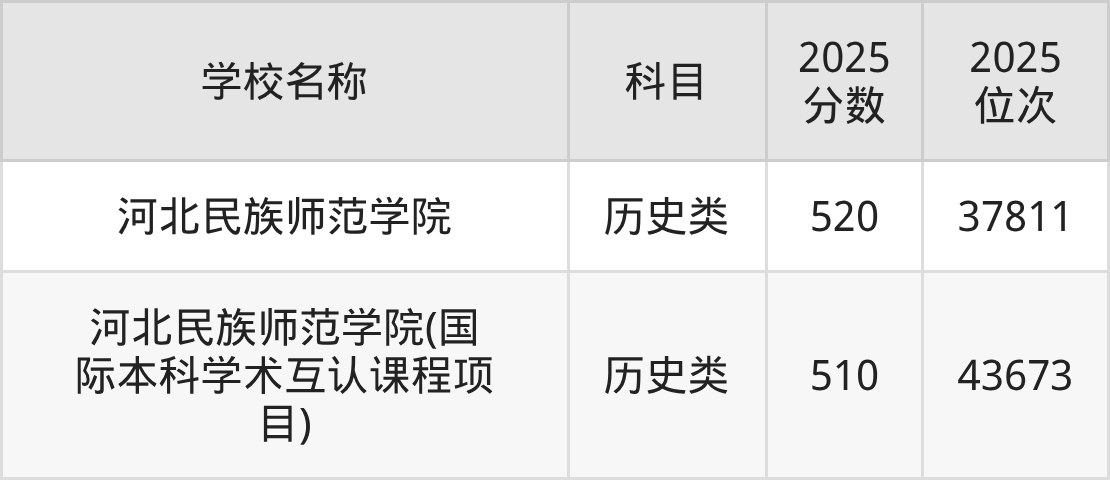 下文为2025年承德市二本师范大学在河北历史类录取分数线和位次排名表,供大家参考: