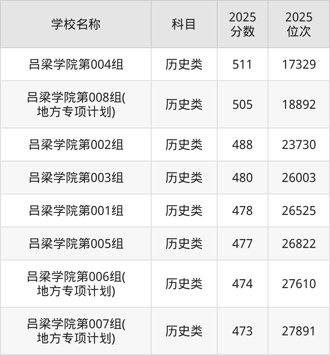 下文为2025年吕梁市本科大学在山西历史类录取分数线和位次排名表,供大家参考: