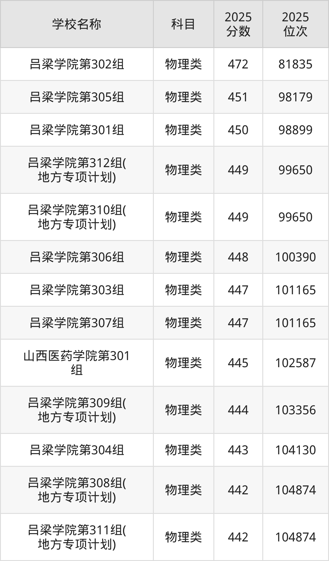 下文为2025年吕梁市本科大学在山西物理类录取分数线和位次排名表,供大家参考: