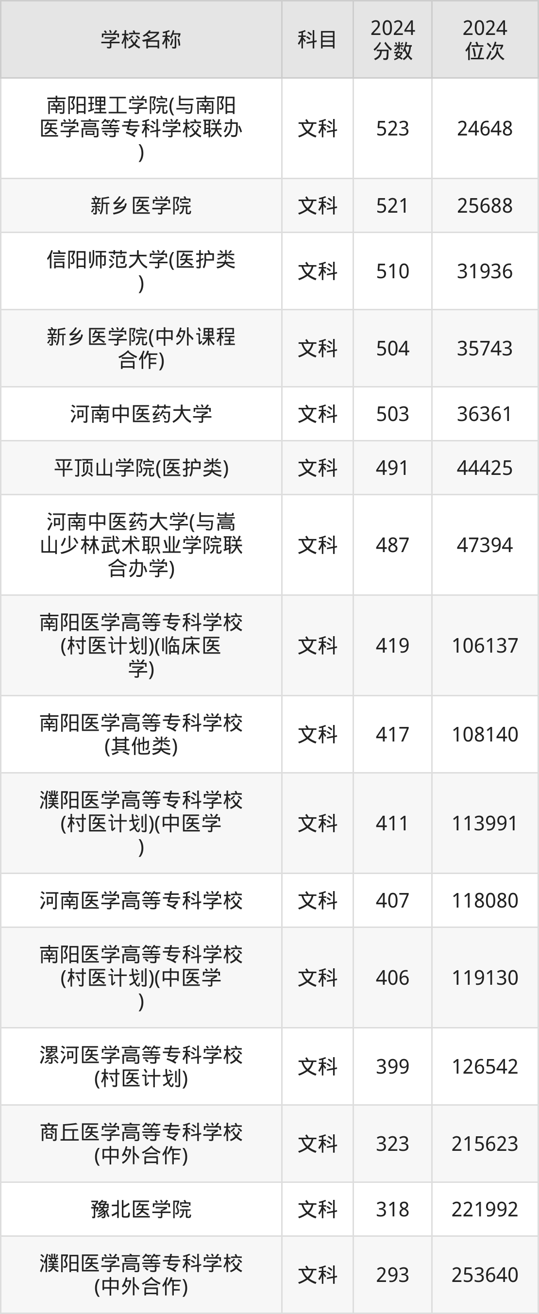 下文为2024年河南省医科大学在河南文科录取分数线和位次排名表,供大家参考: