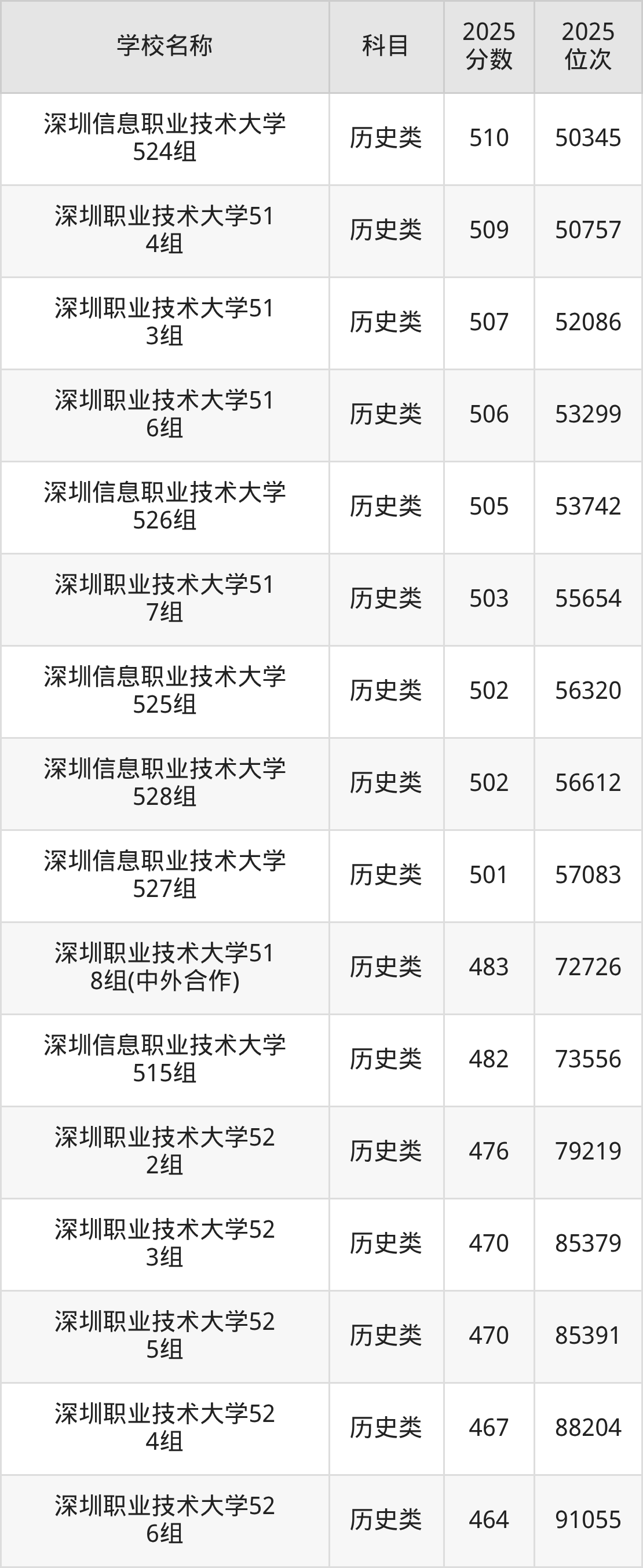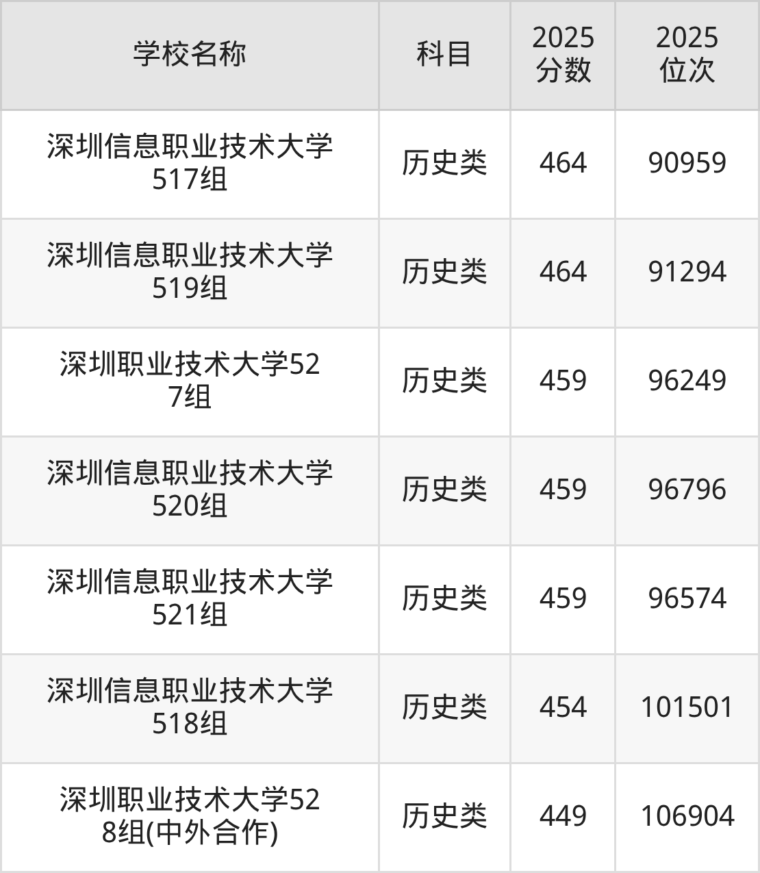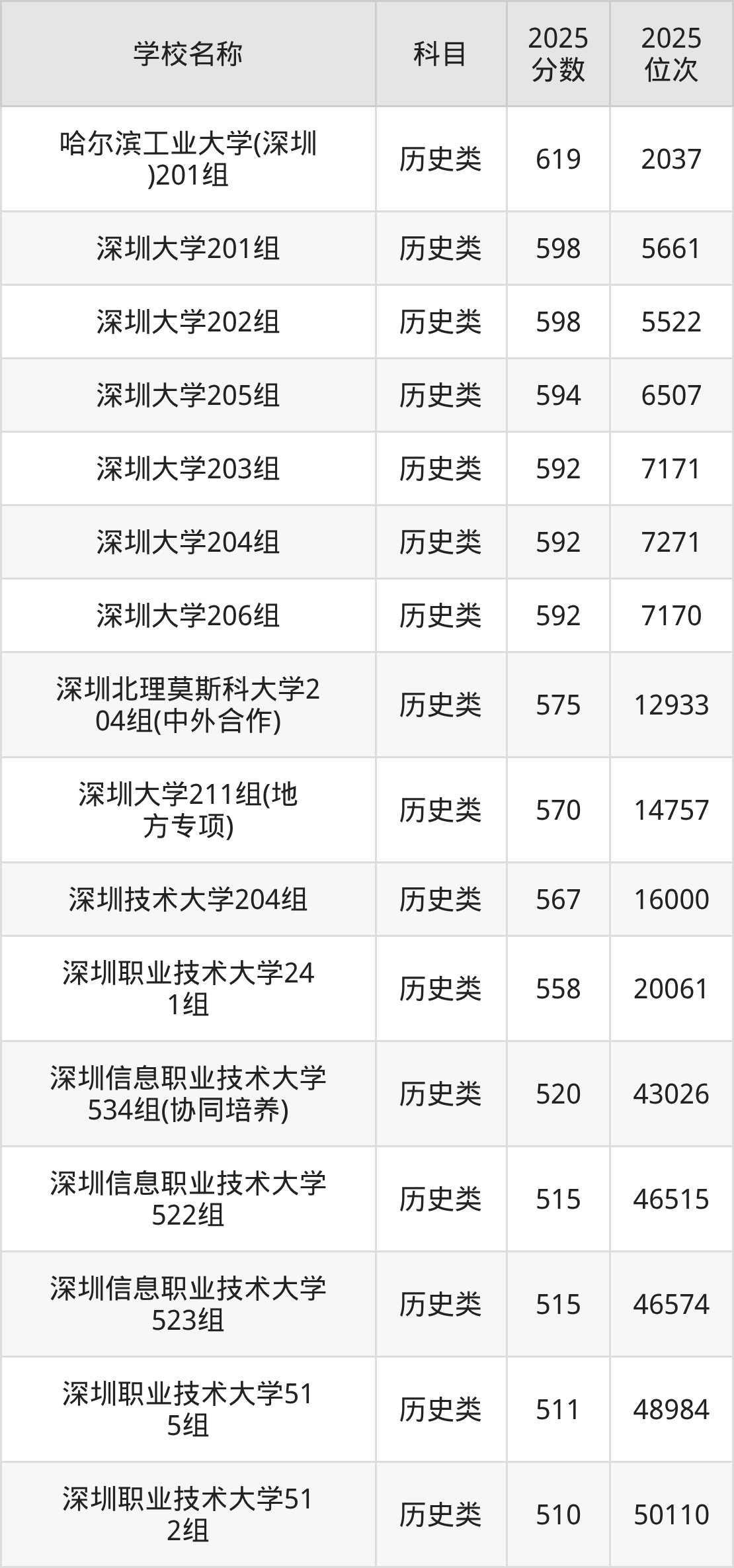 下文为2025年深圳市本科大学在广东历史类录取分数线和位次排名表,供大家参考: