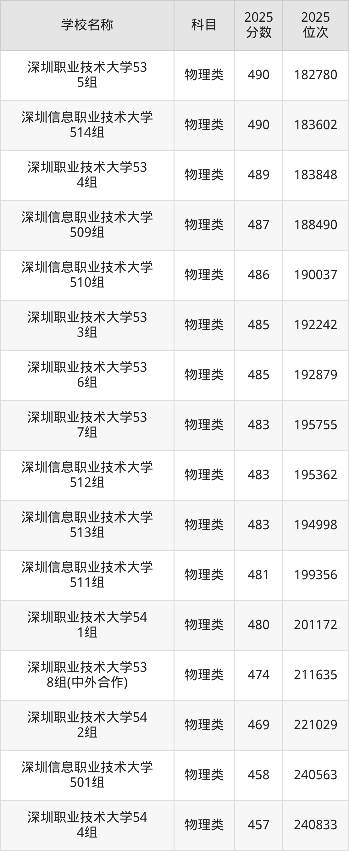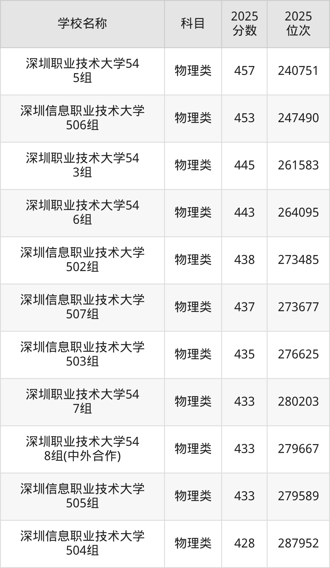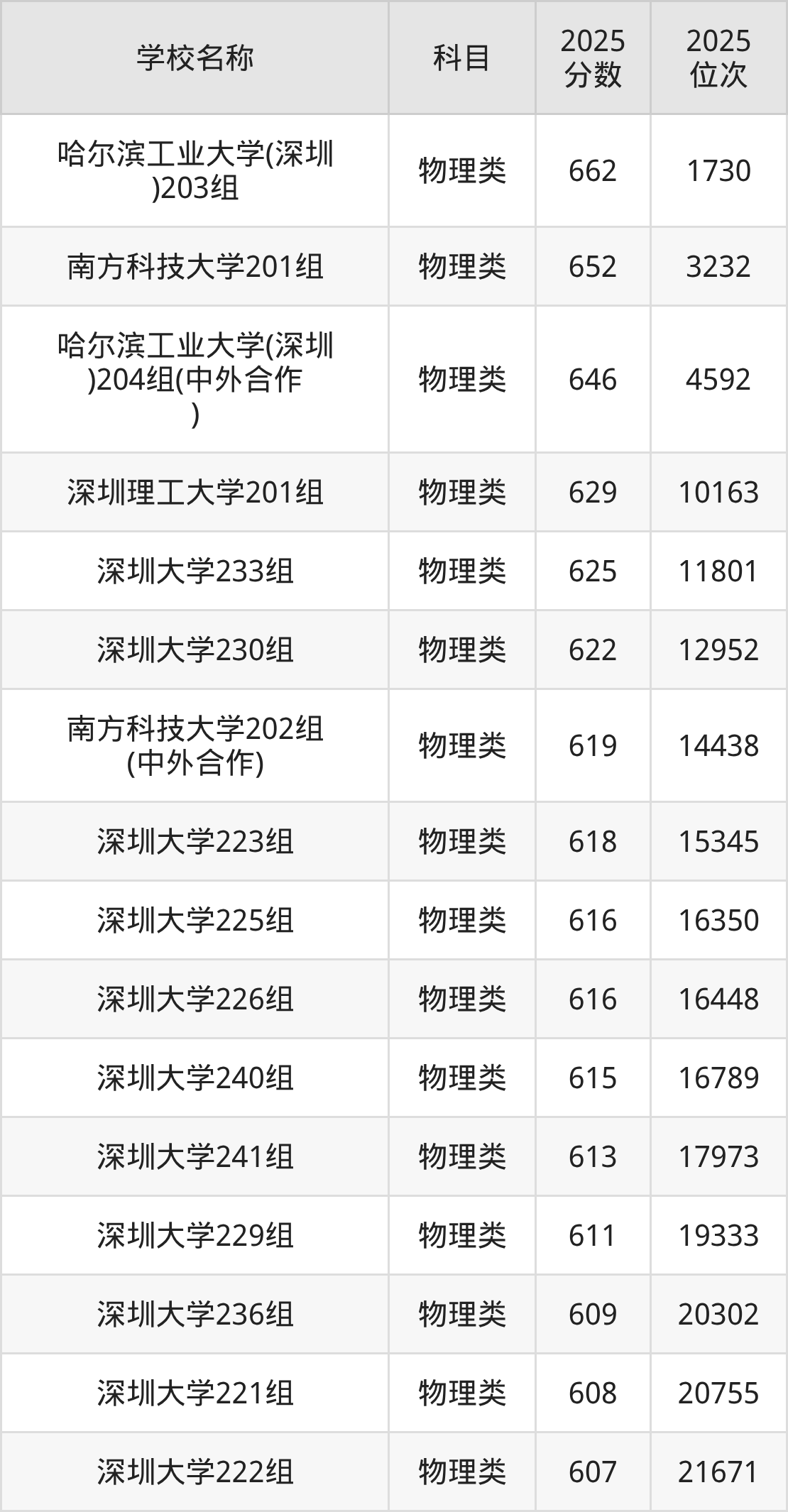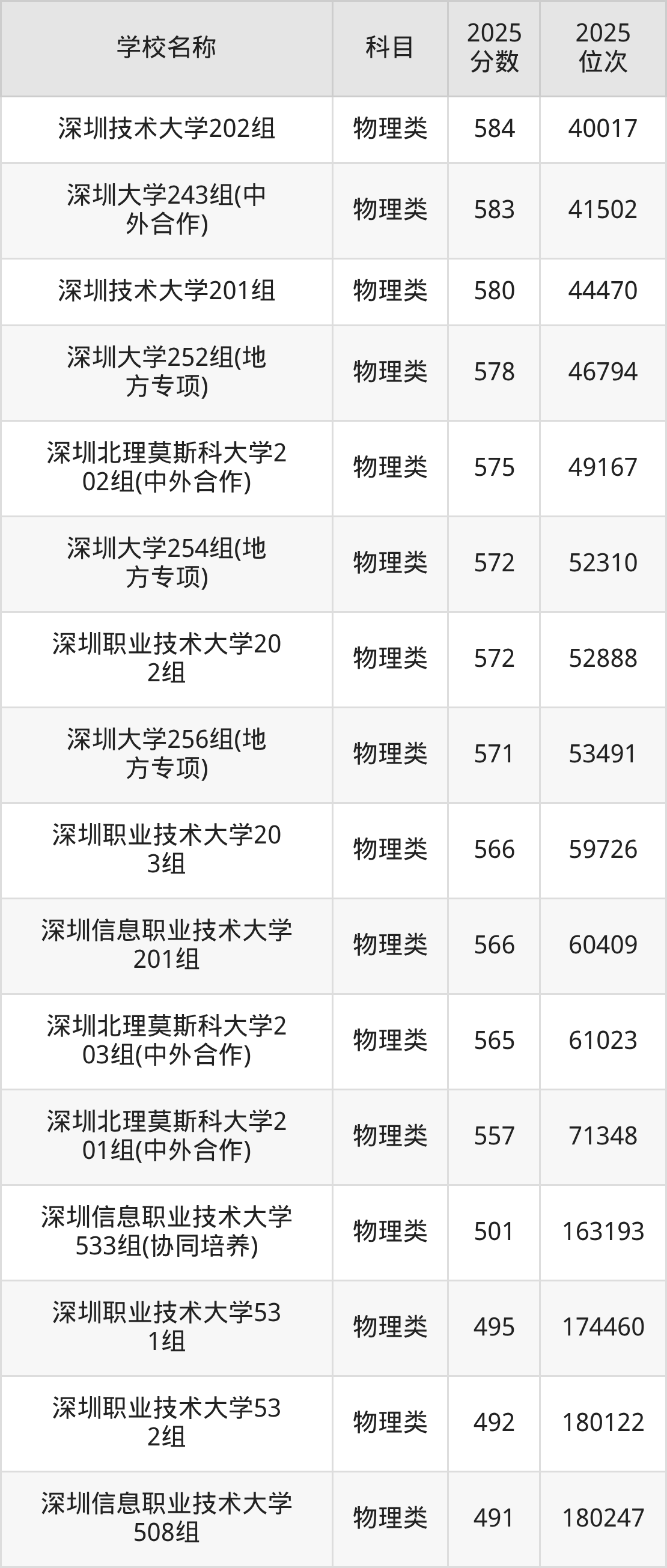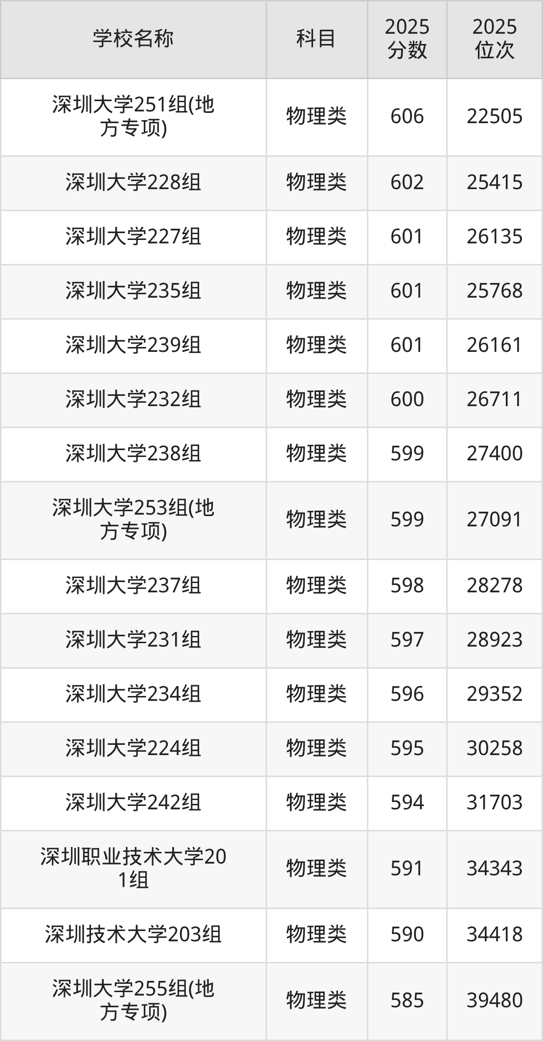 下文为2025年深圳市本科大学在广东物理类录取分数线和位次排名表,供大家参考: