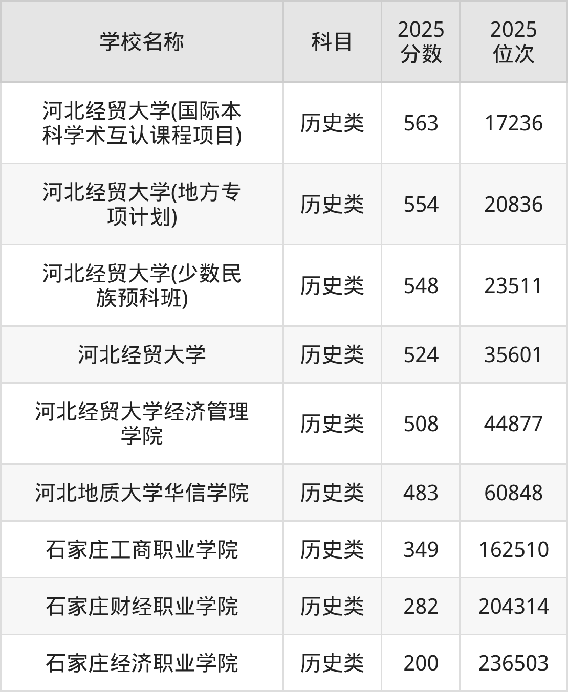 下文为2025年石家庄市财经类大学在河北历史类录取分数线和位次排名表,供大家参考: