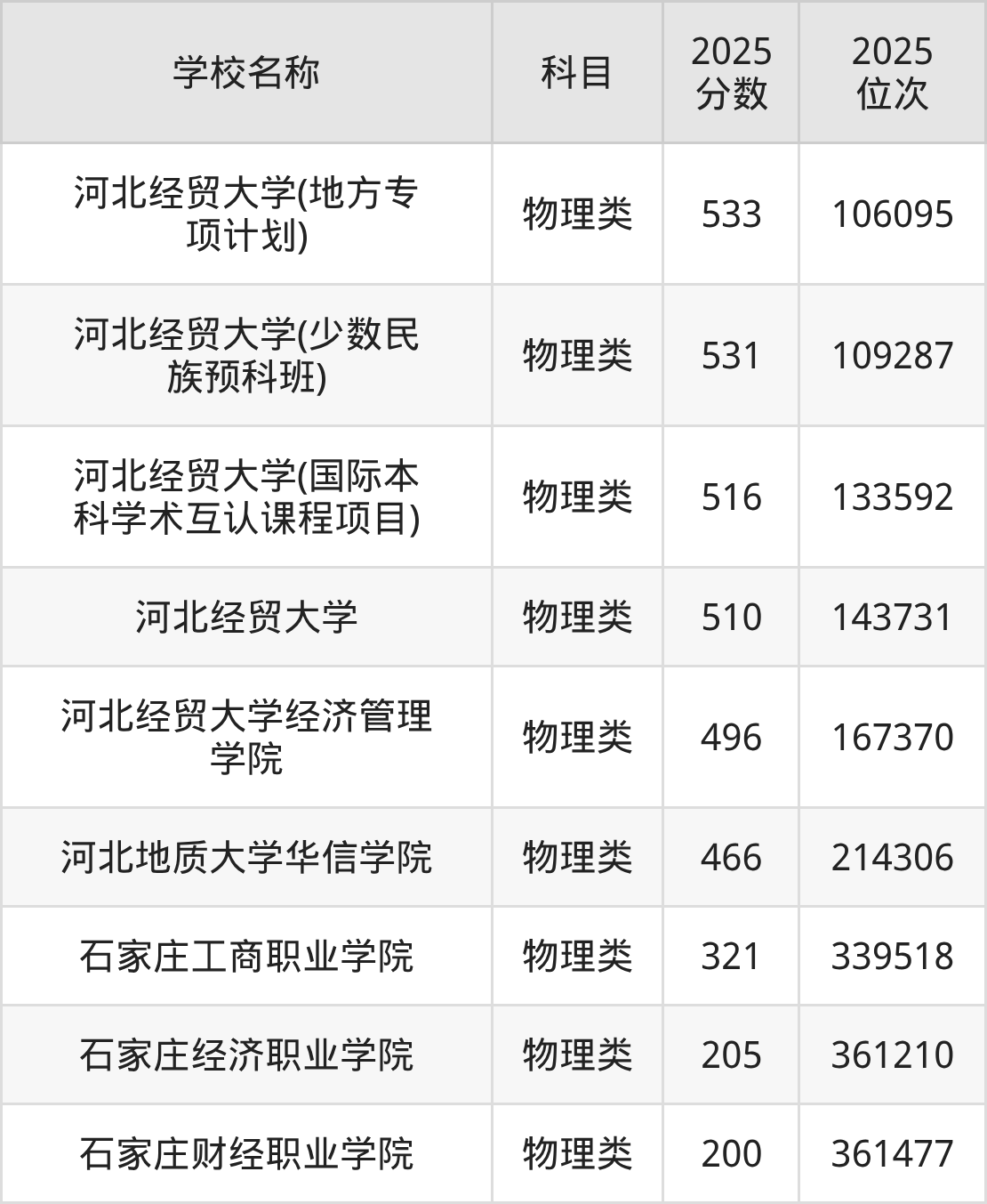 下文为2025年石家庄市财经类大学在河北物理类录取分数线和位次排名表,供大家参考: