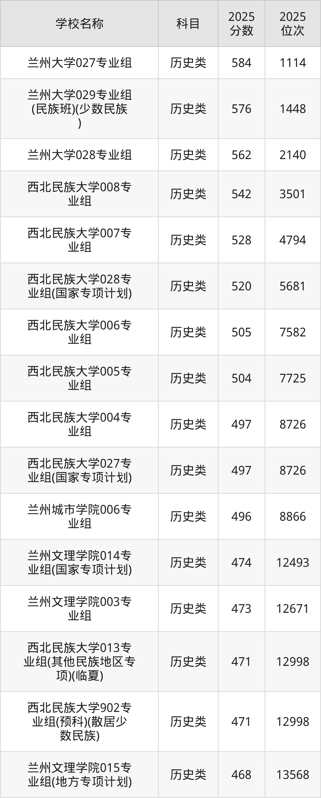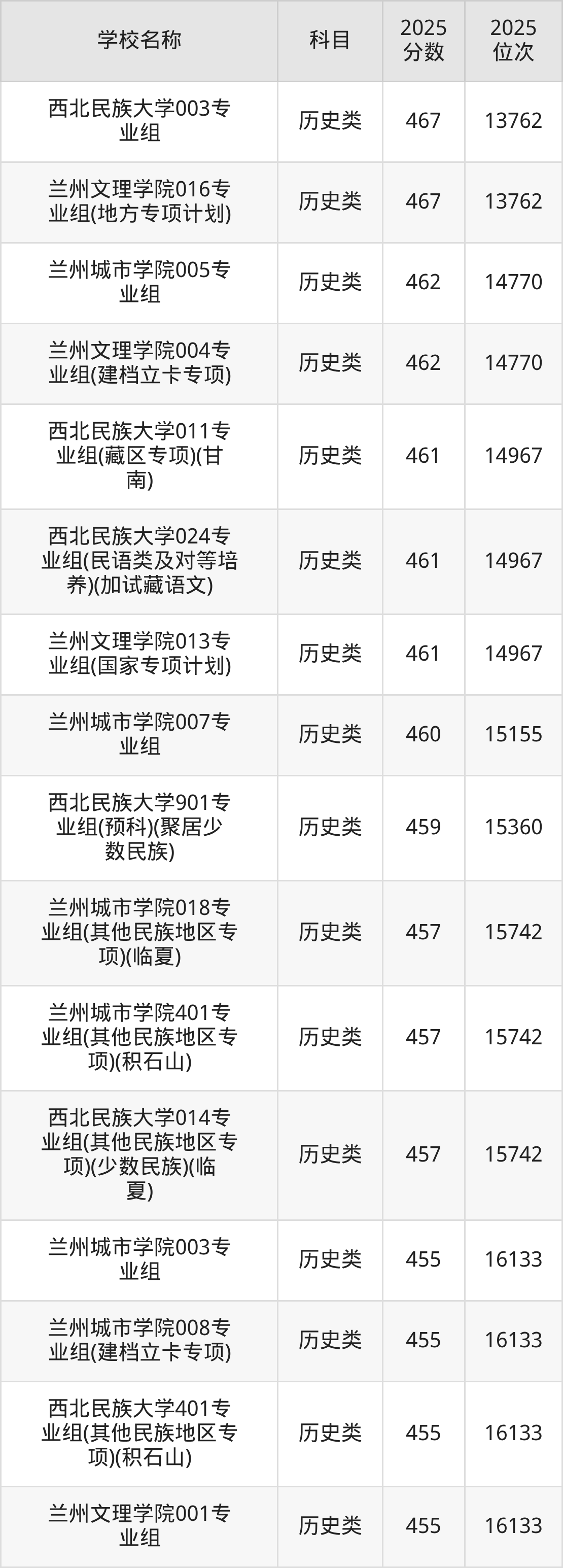 下文为2025年兰州市综合类大学在甘肃历史类录取分数线和位次排名表,供大家参考: