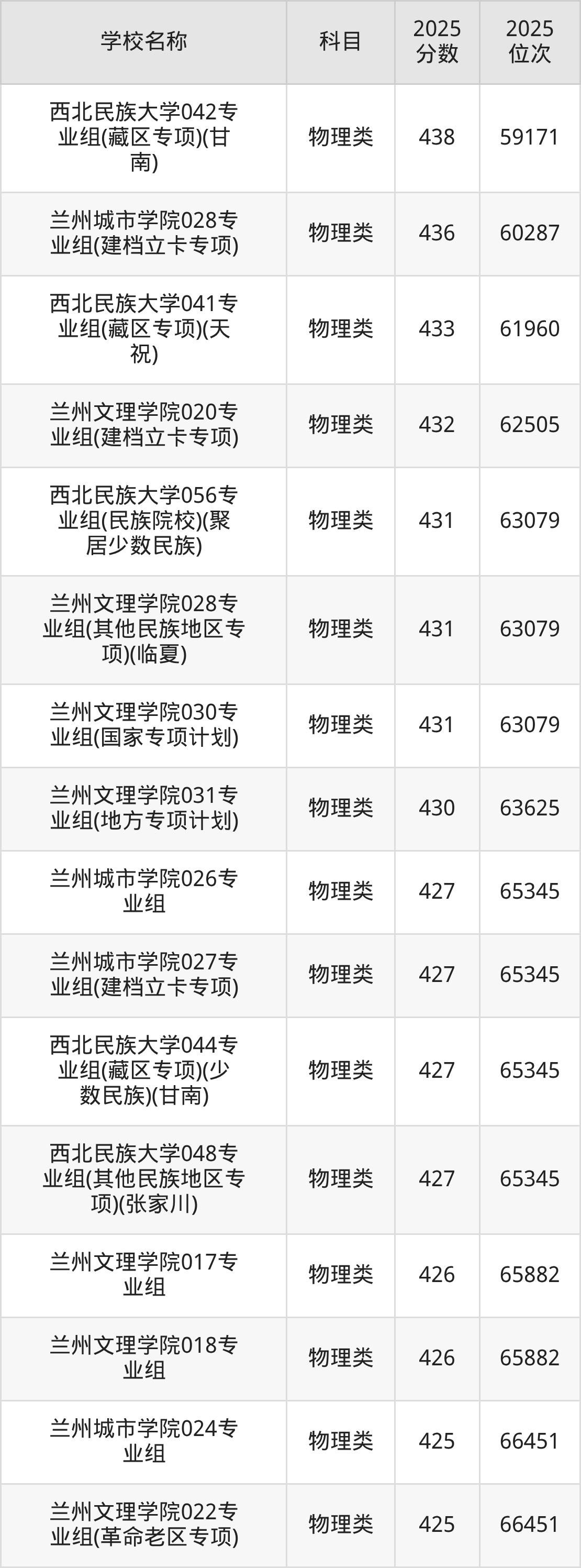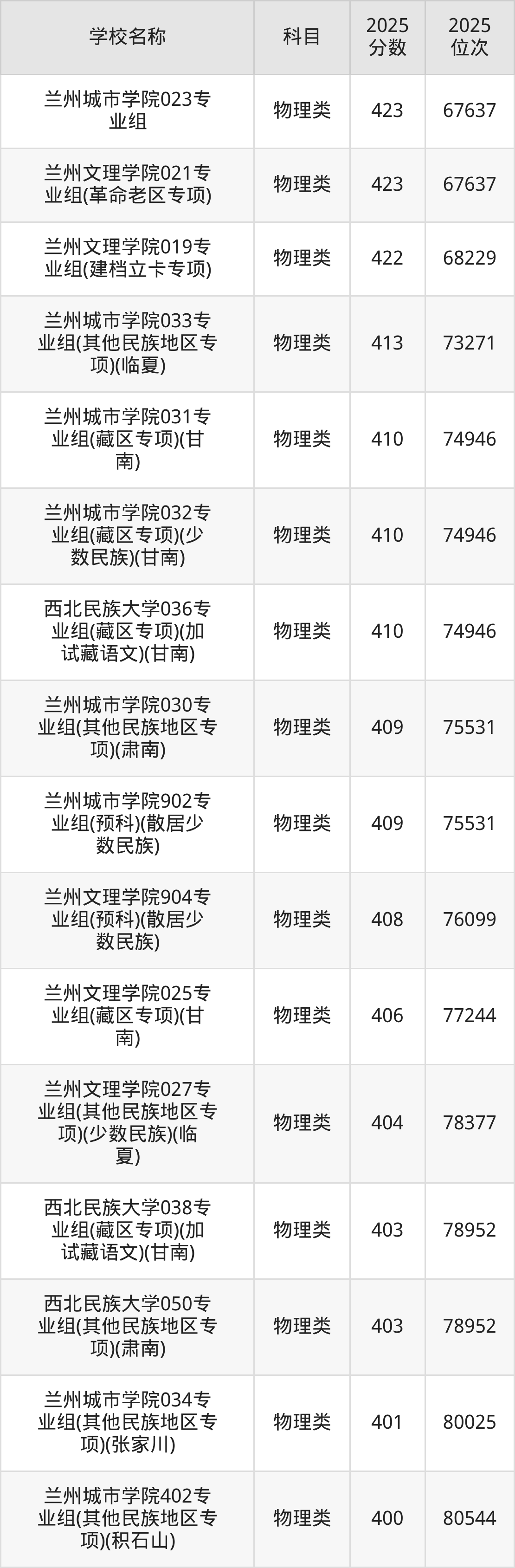 下文为2025年兰州市综合类大学在甘肃物理类录取分数线和位次排名表,供大家参考: