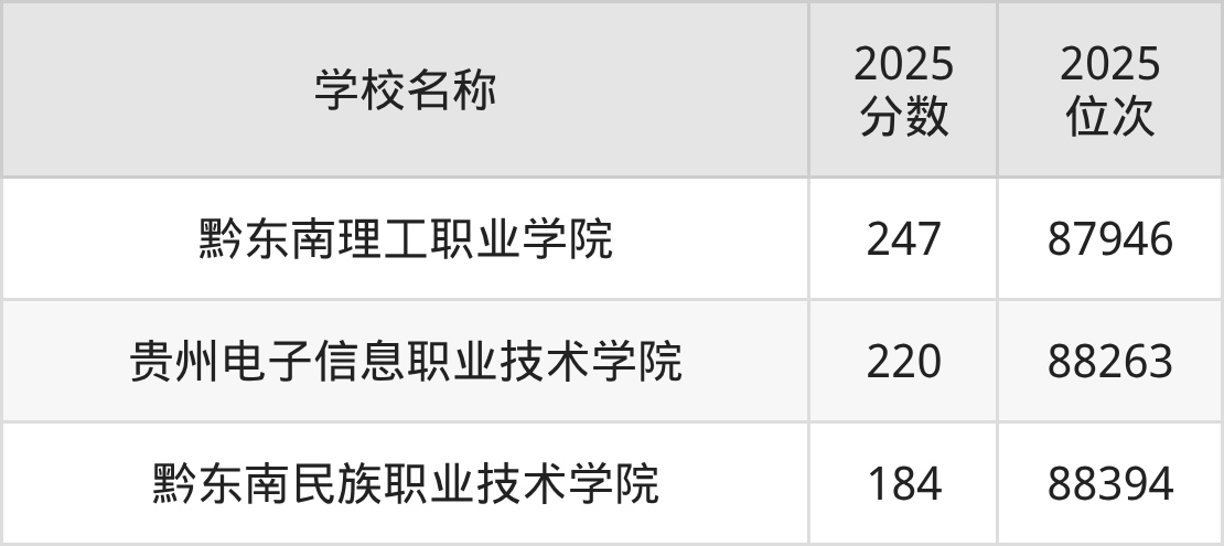 下文为2025年黔东南苗族侗族自治州公办专科大学在贵州历史类录取分数线和位次排名表,供大家参考: