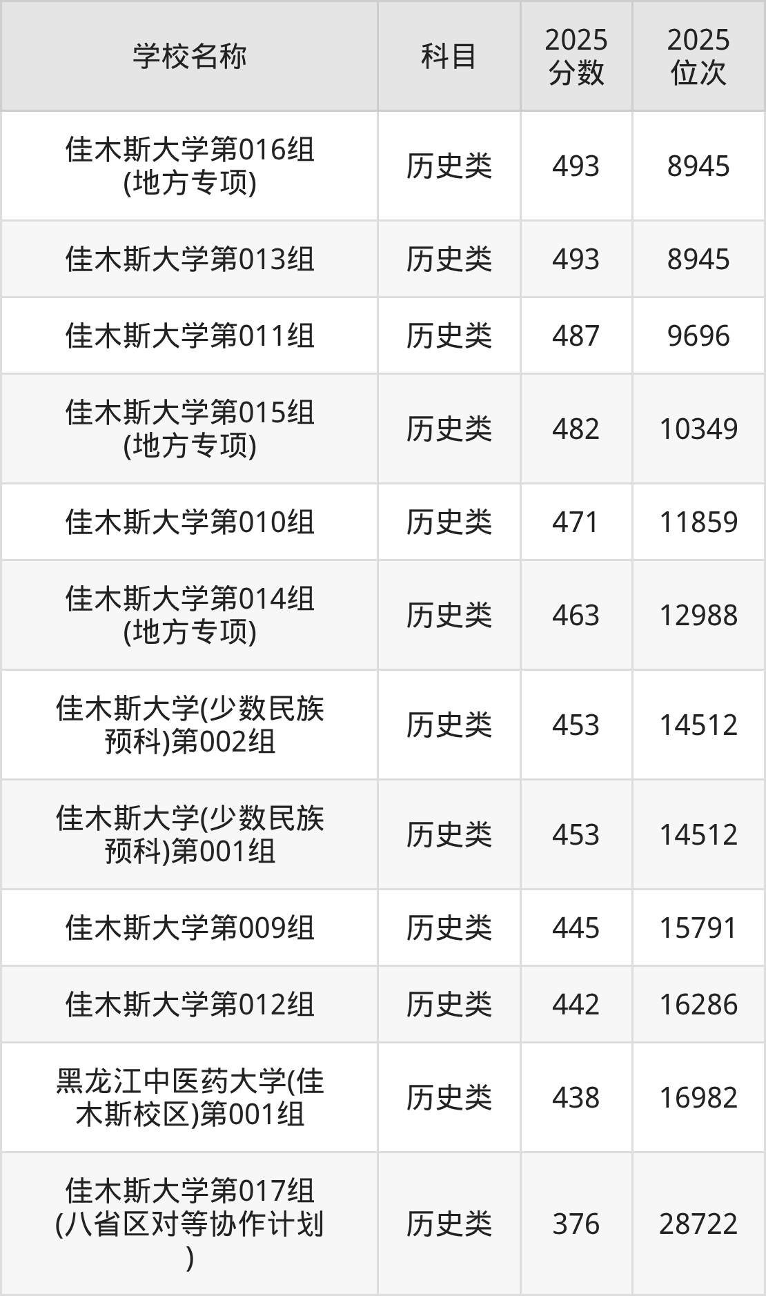 下文为2025年佳木斯市含保研资格的大学在黑龙江历史类录取分数线和位次排名表,供大家参考:
