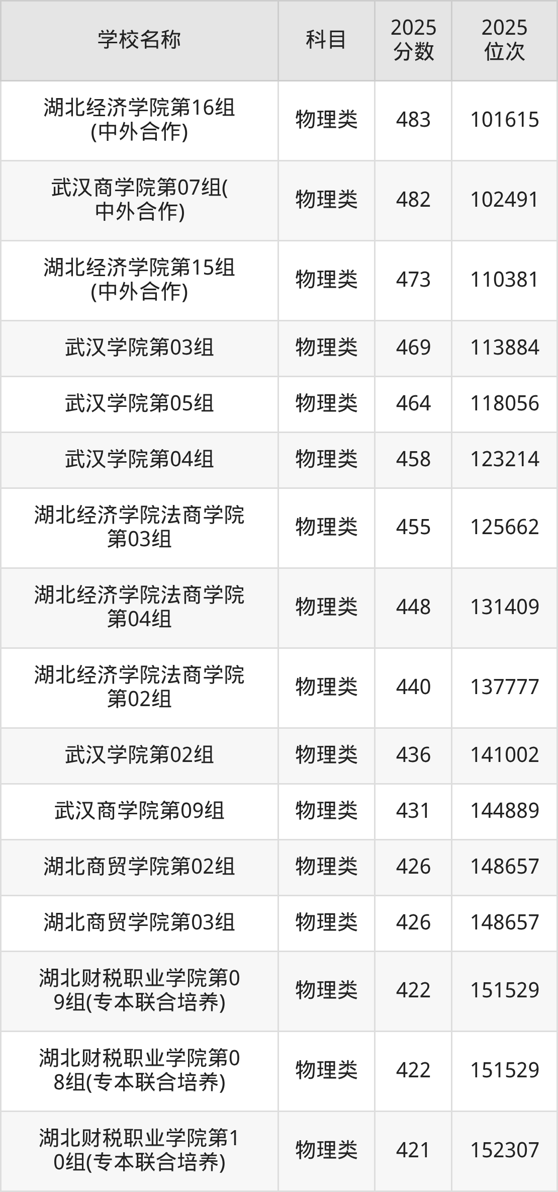 下文为2025年武汉市财经类大学在湖北物理类录取分数线和位次排名表,供大家参考: