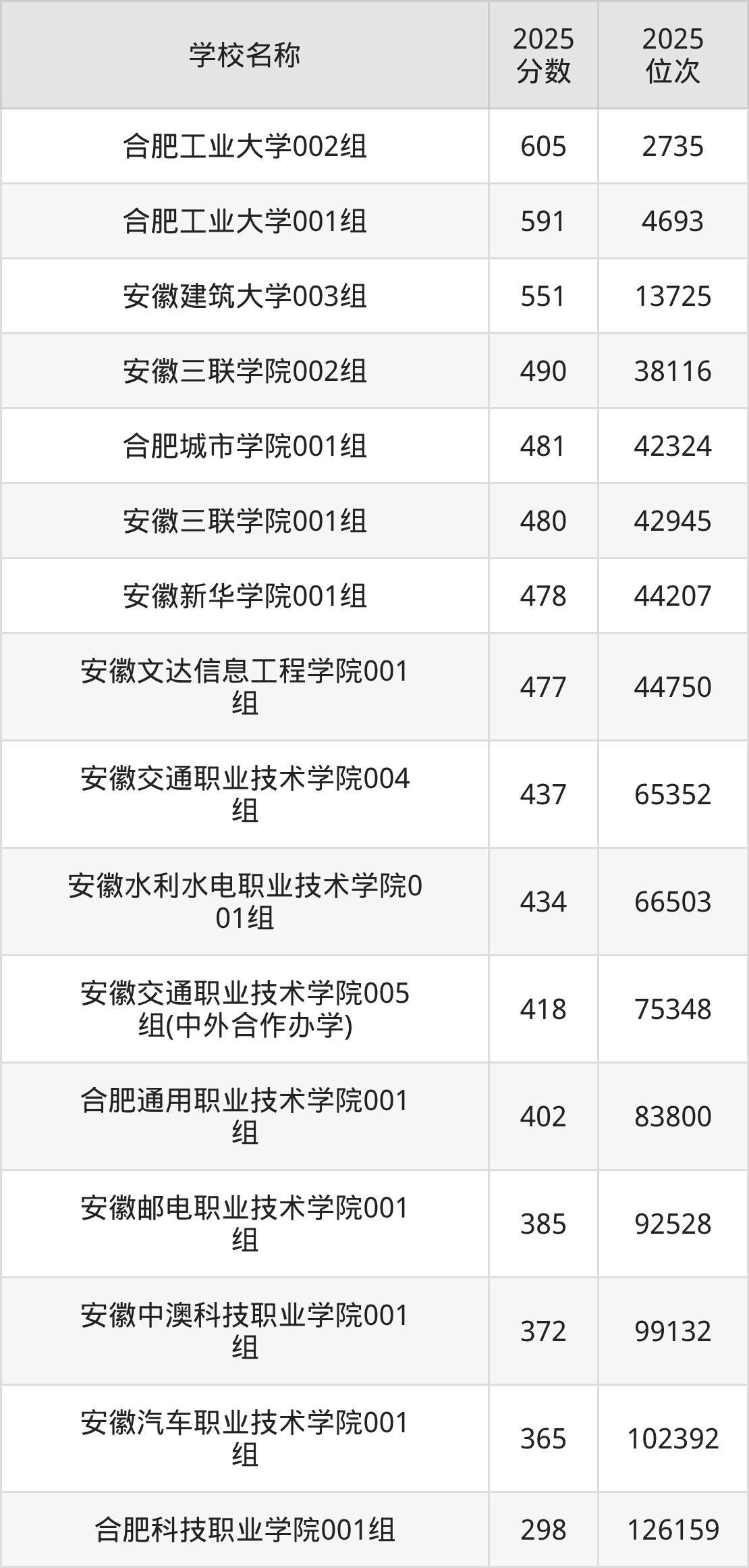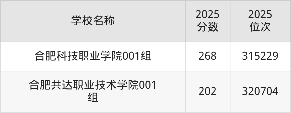 下文为2025年合肥市理工类大学在安徽历史类录取分数线和位次排名表,供大家参考: