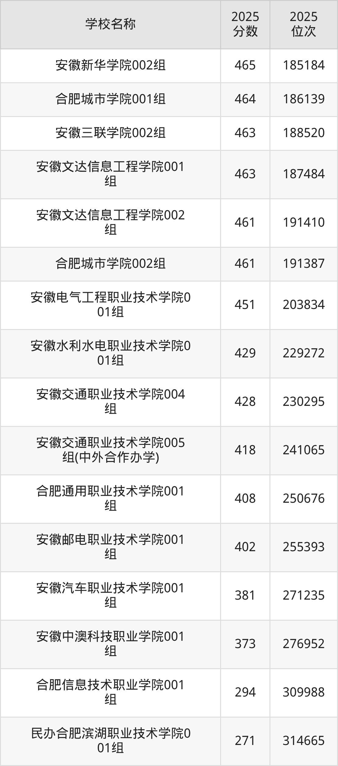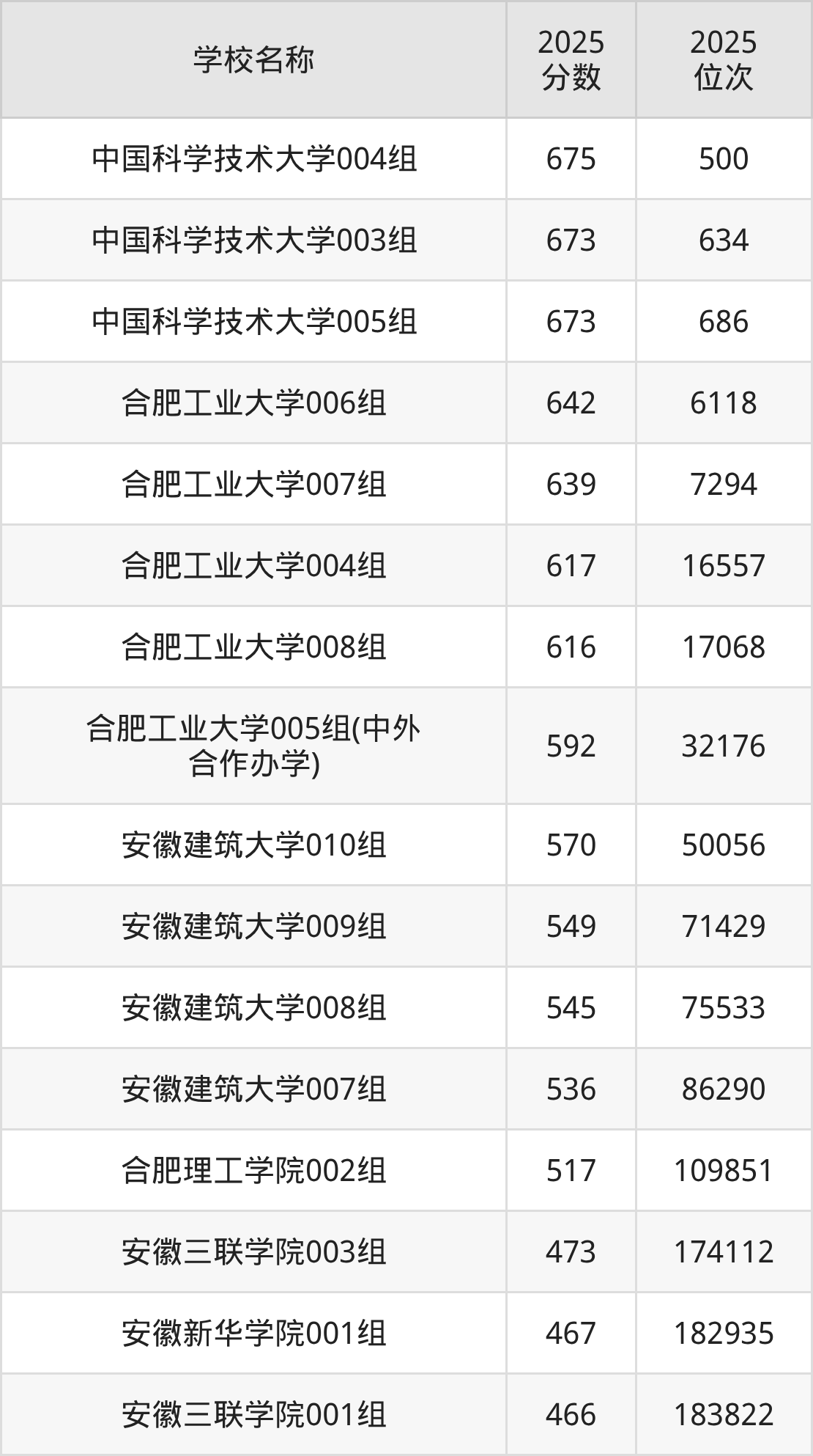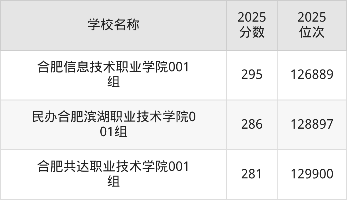 下文为2025年合肥市理工类大学在安徽物理类录取分数线和位次排名表,供大家参考: