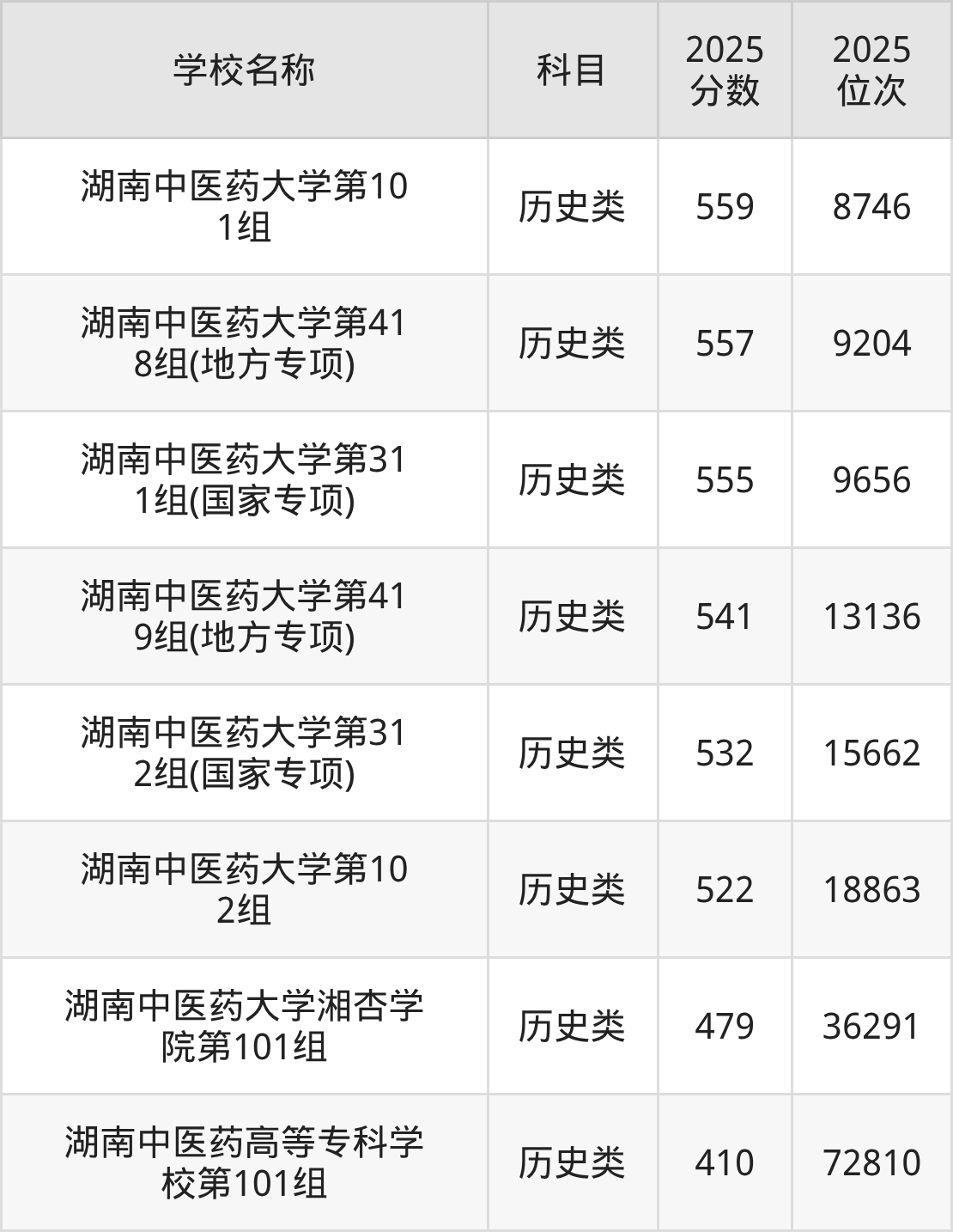 下文为2025年湖南省中医药大学在湖南历史类录取分数线和位次排名表,供大家参考: