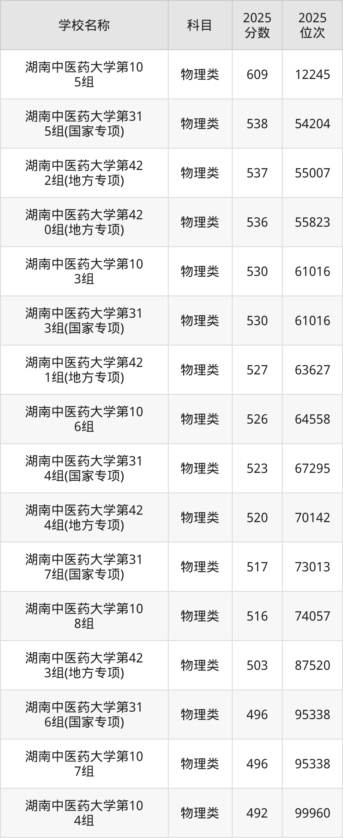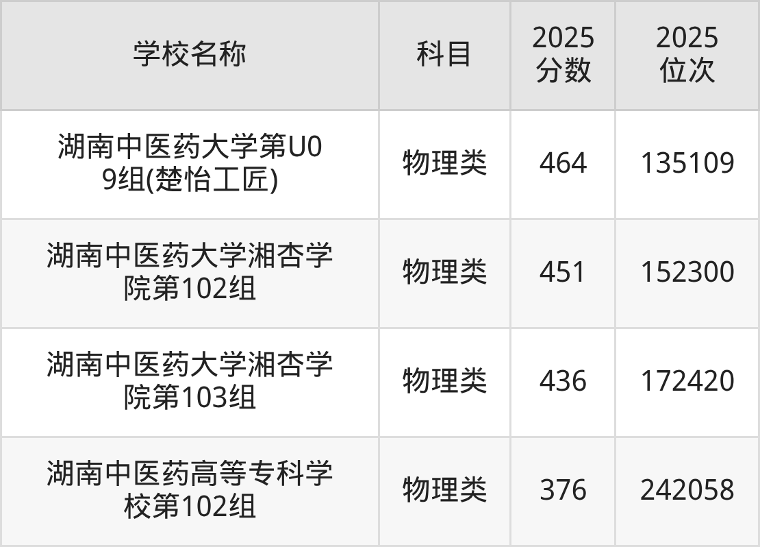 下文为2025年湖南省中医药大学在湖南物理类录取分数线和位次排名表,供大家参考: