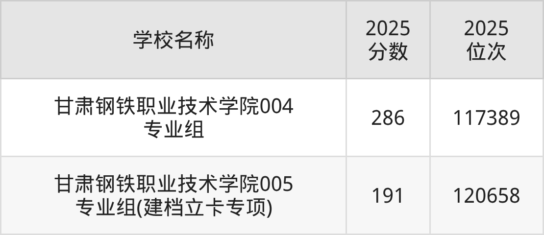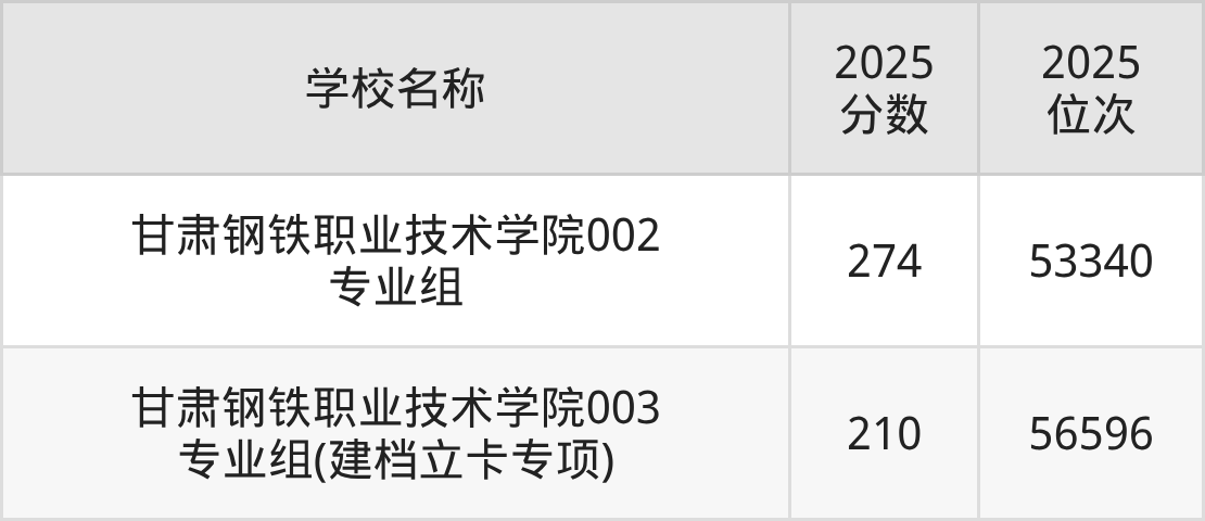 下文为2025年嘉峪关市公办专科大学在甘肃物理类录取分数线和位次排名表,供大家参考: