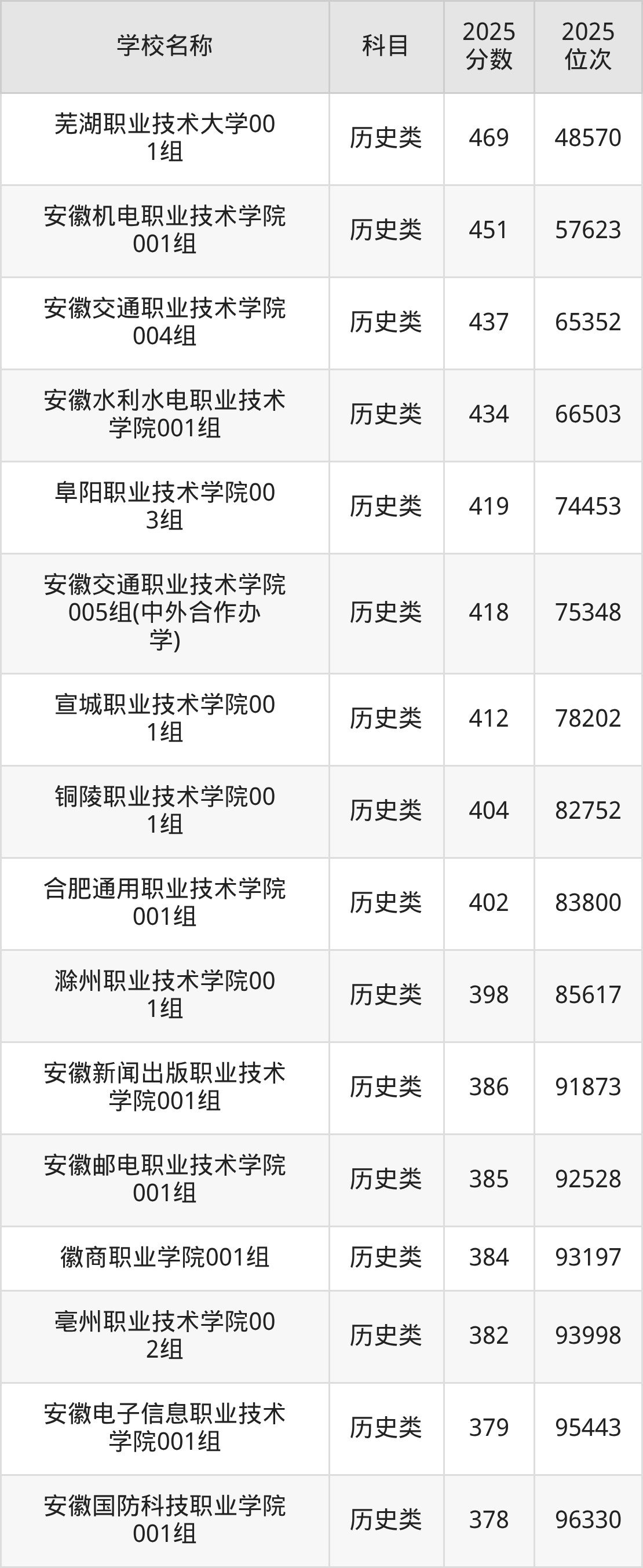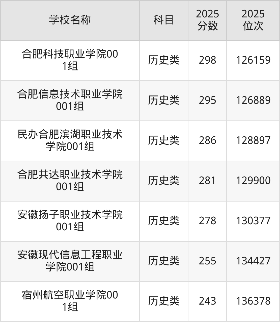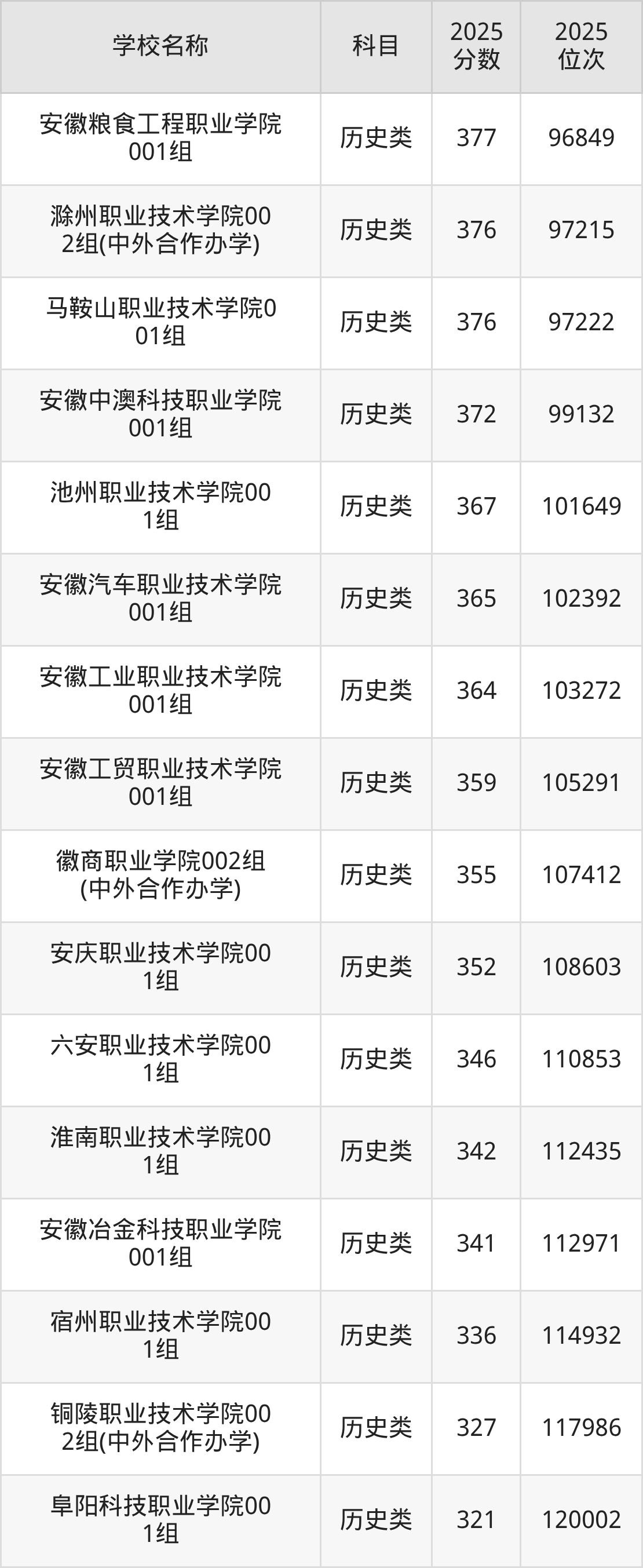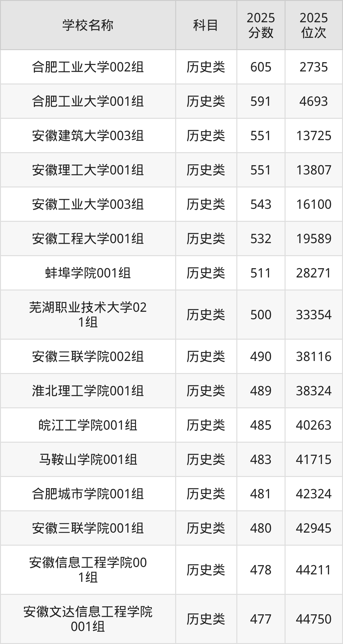 下文为2025年安徽省理工类大学在安徽历史类录取分数线和位次排名表,供大家参考:
