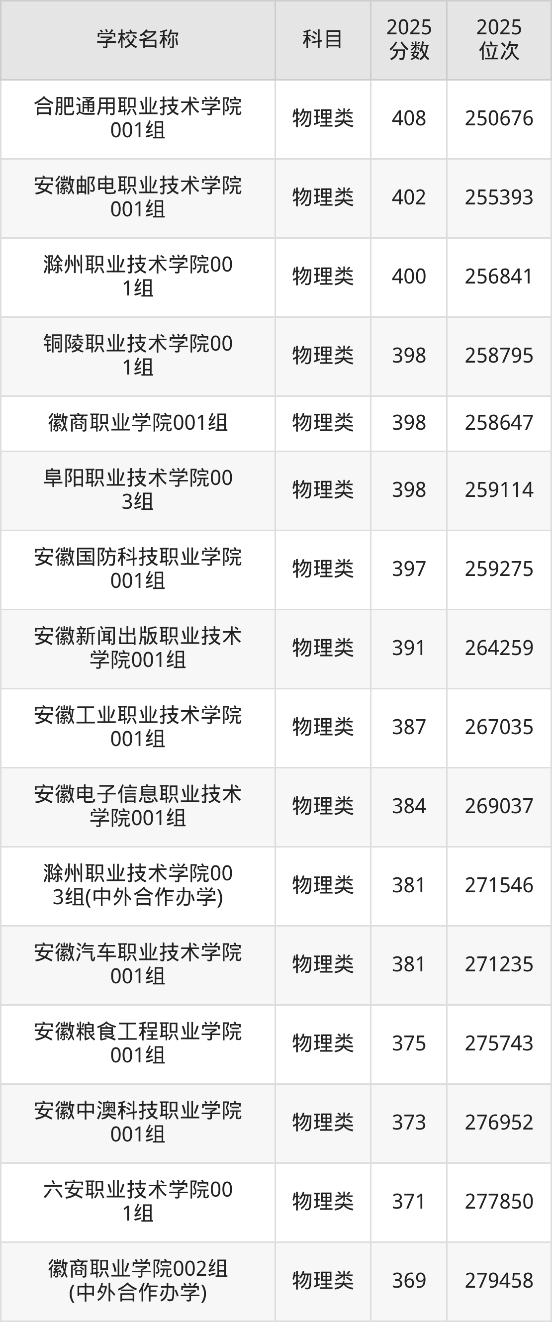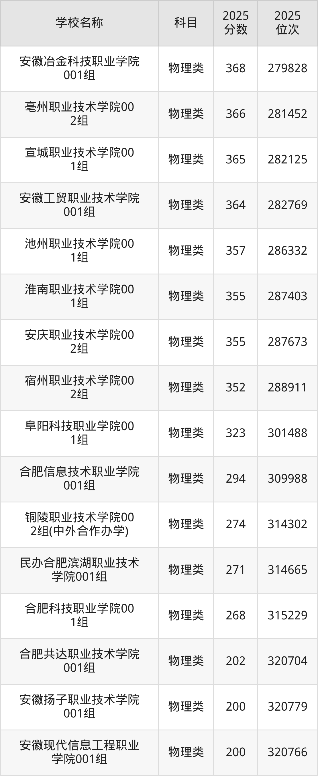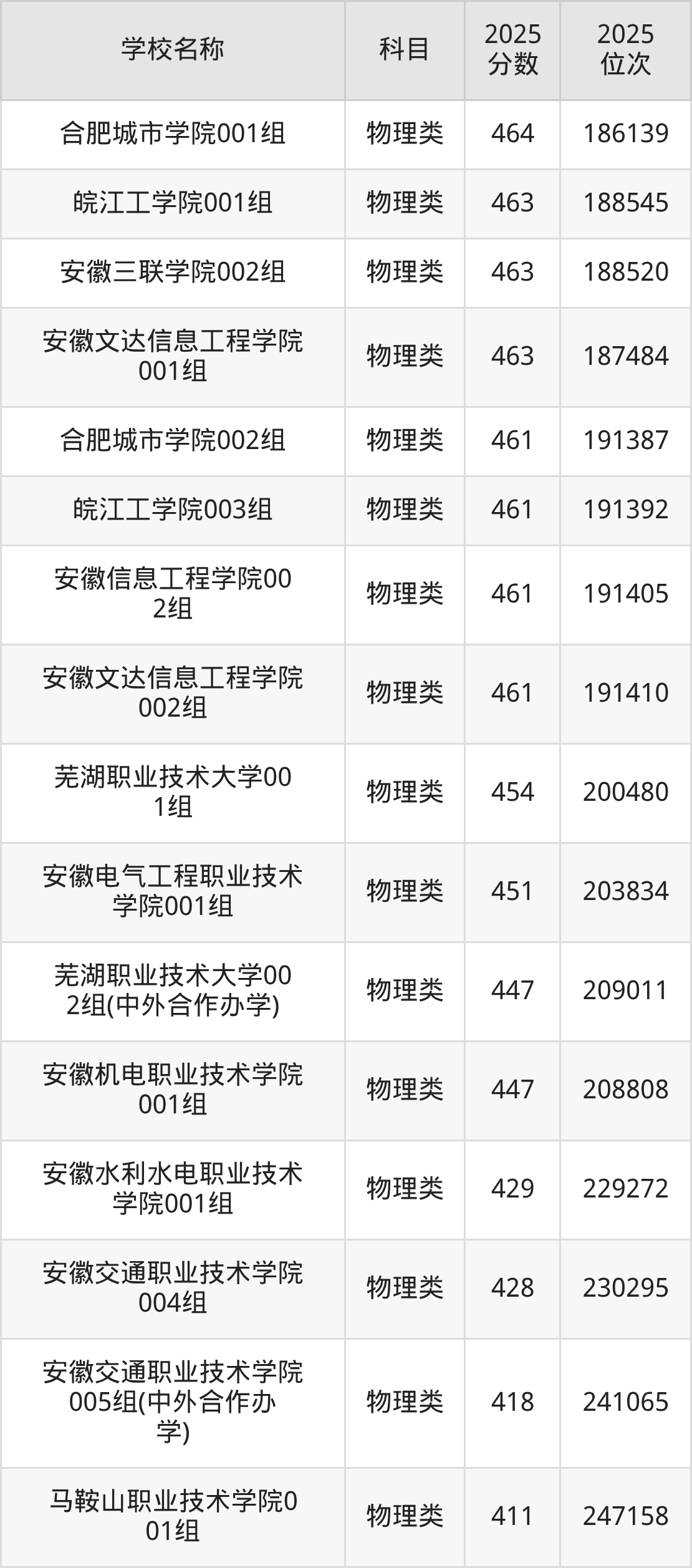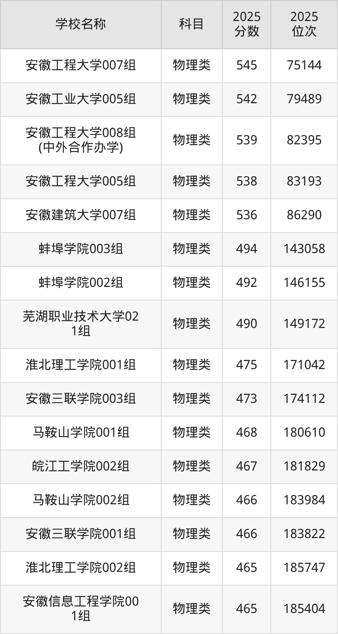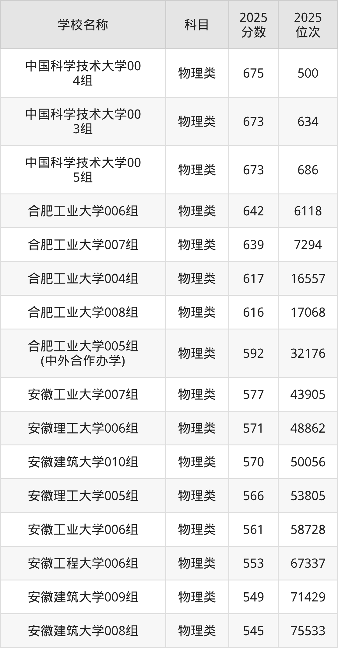 下文为2025年安徽省理工类大学在安徽物理类录取分数线和位次排名表,供大家参考: