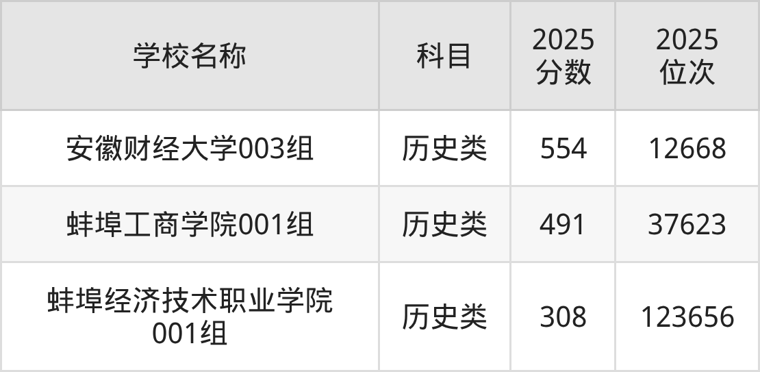 下文为2025年蚌埠市财经类大学在安徽历史类录取分数线和位次排名表,供大家参考: