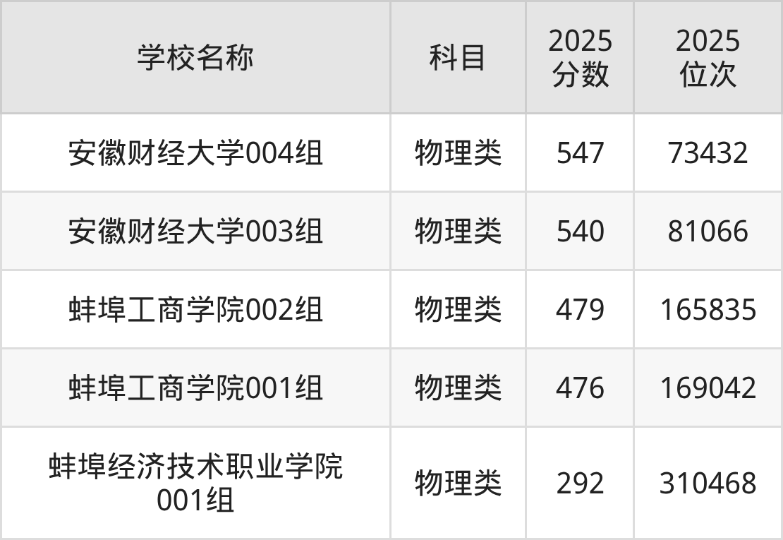 下文为2025年蚌埠市财经类大学在安徽物理类录取分数线和位次排名表,供大家参考: