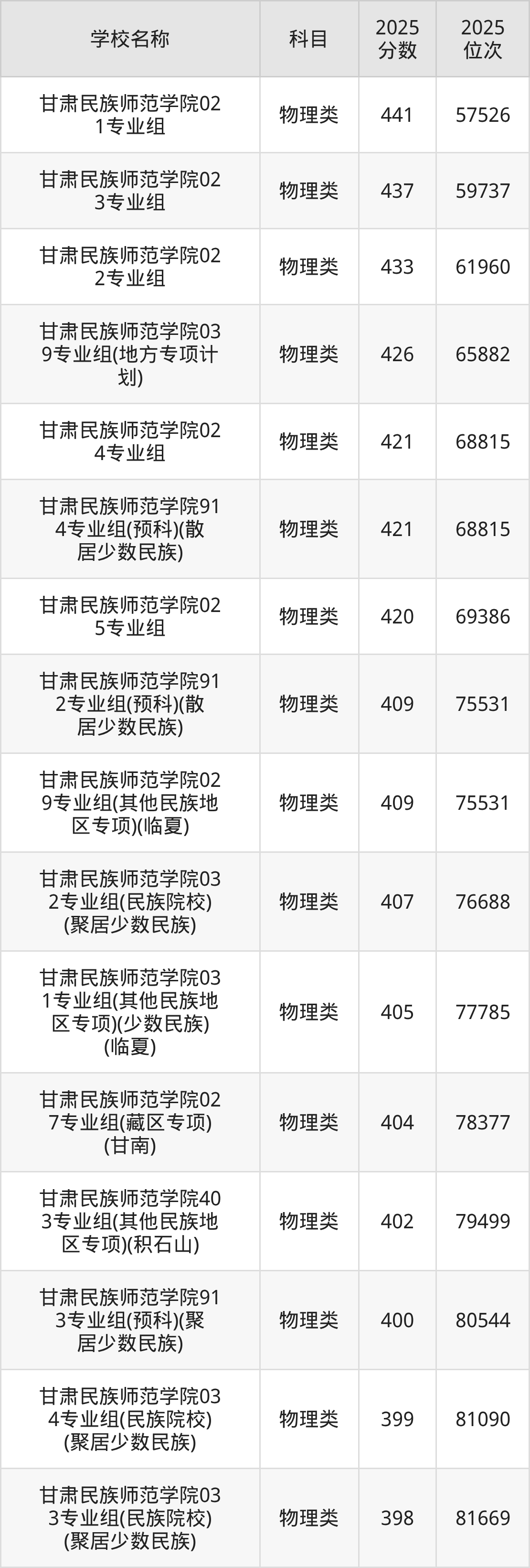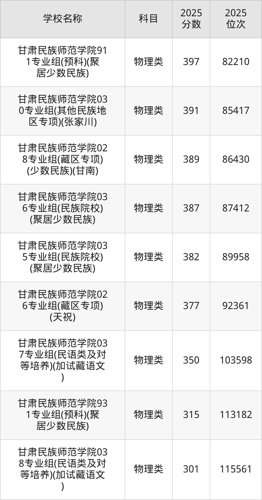 根据2025年甘南藏族自治州本科大学在甘肃省物理类招生录取分数线来看,甘南藏族自治州物理类收分最低的本科大学为甘肃民族师范学院,录取分数线为301分。