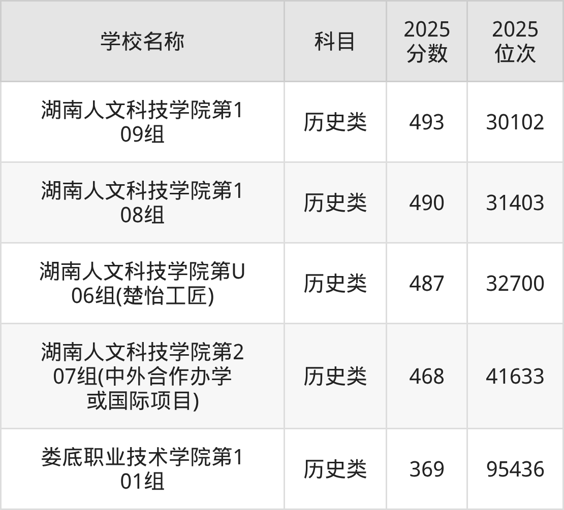 下文为2025年娄底市综合类大学在湖南历史类录取分数线和位次排名表,供大家参考: