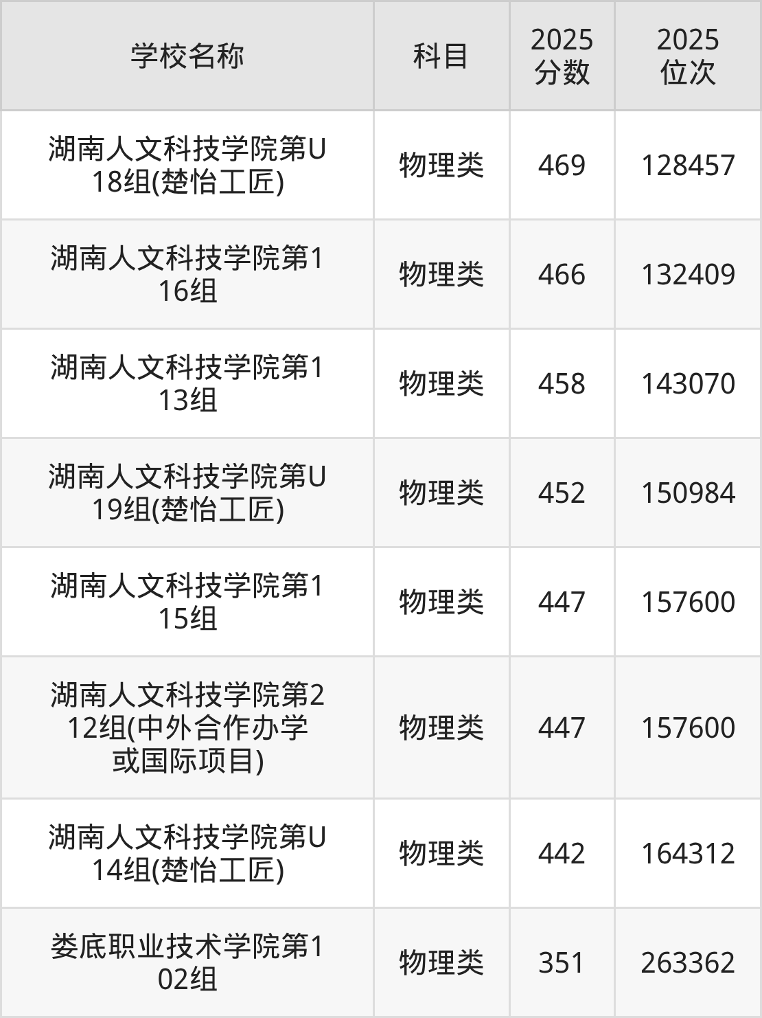 下文为2025年娄底市综合类大学在湖南物理类录取分数线和位次排名表,供大家参考:
