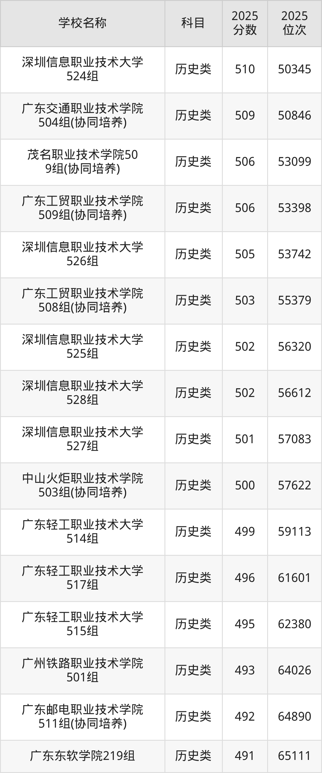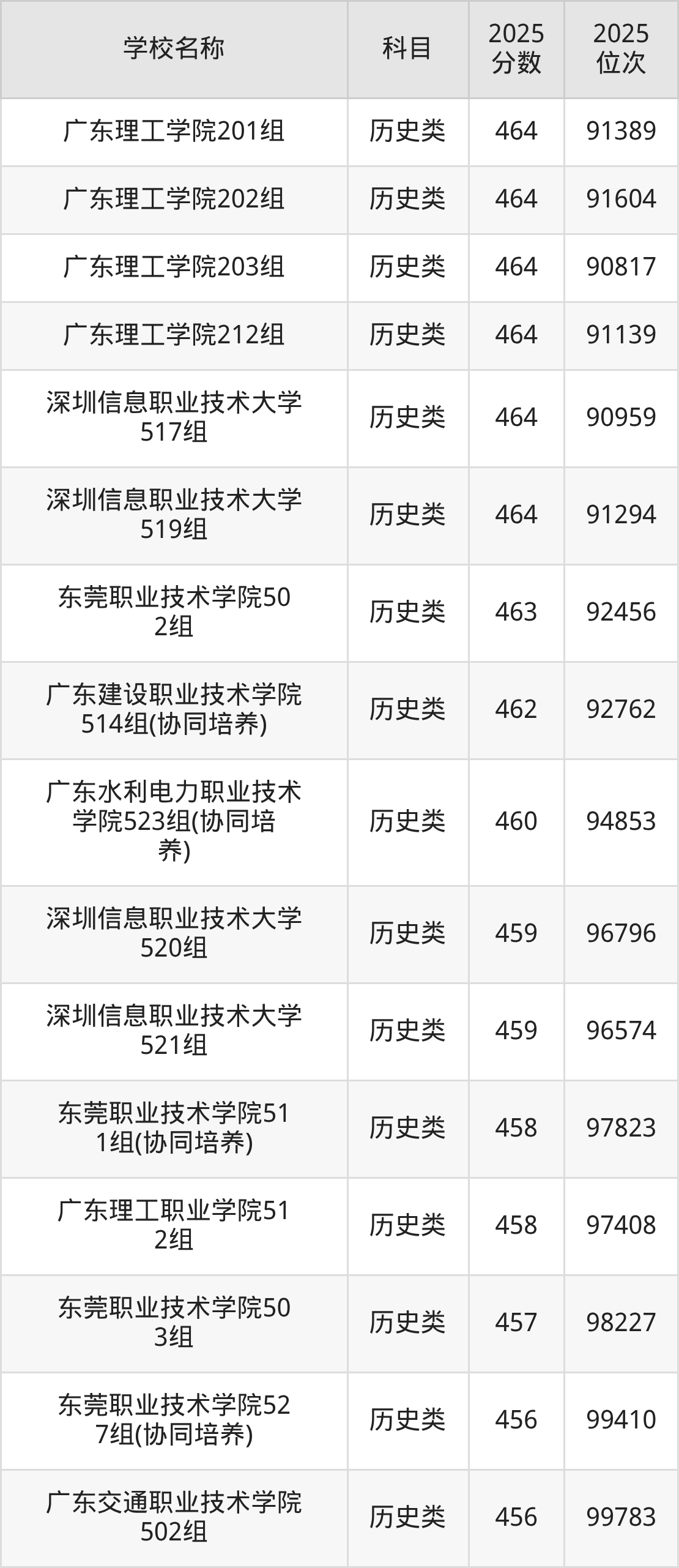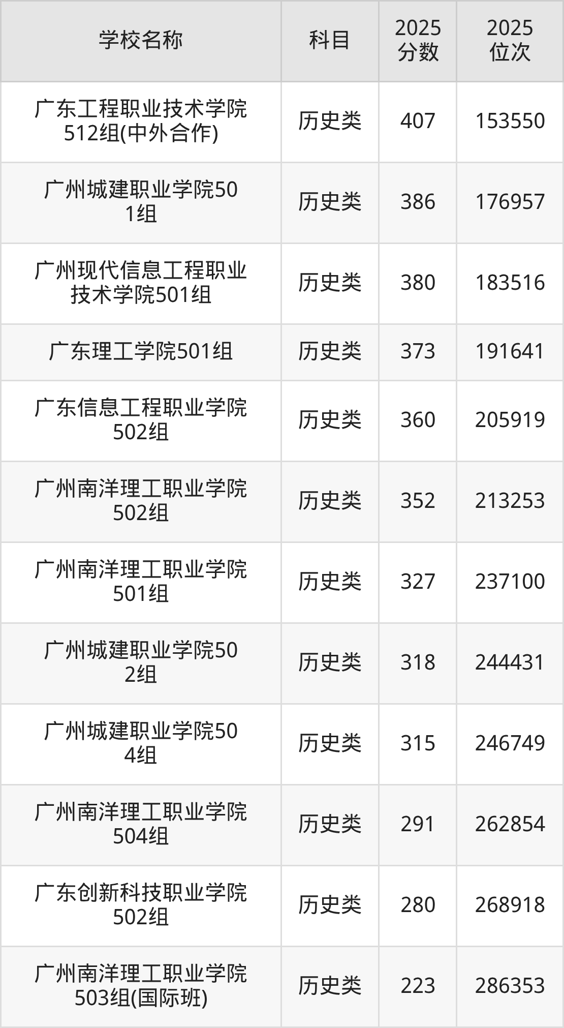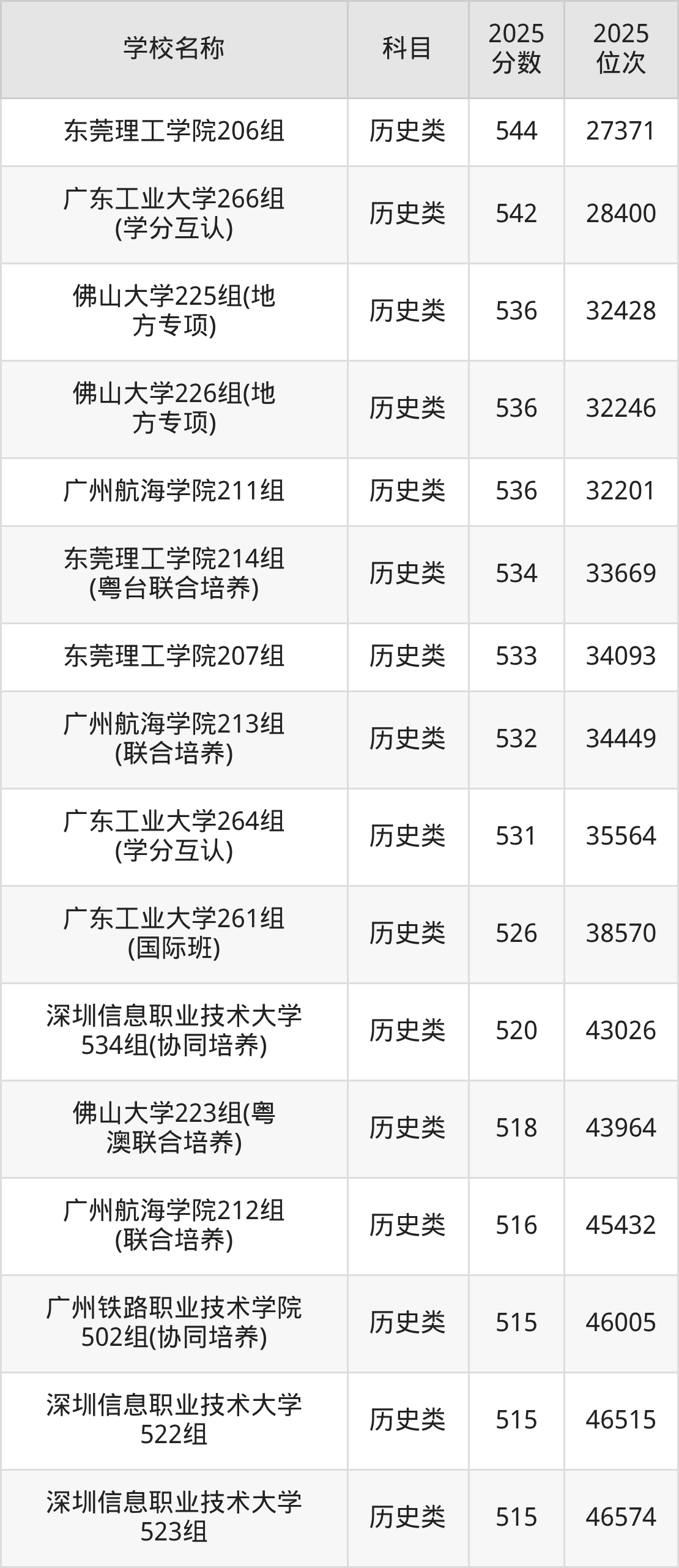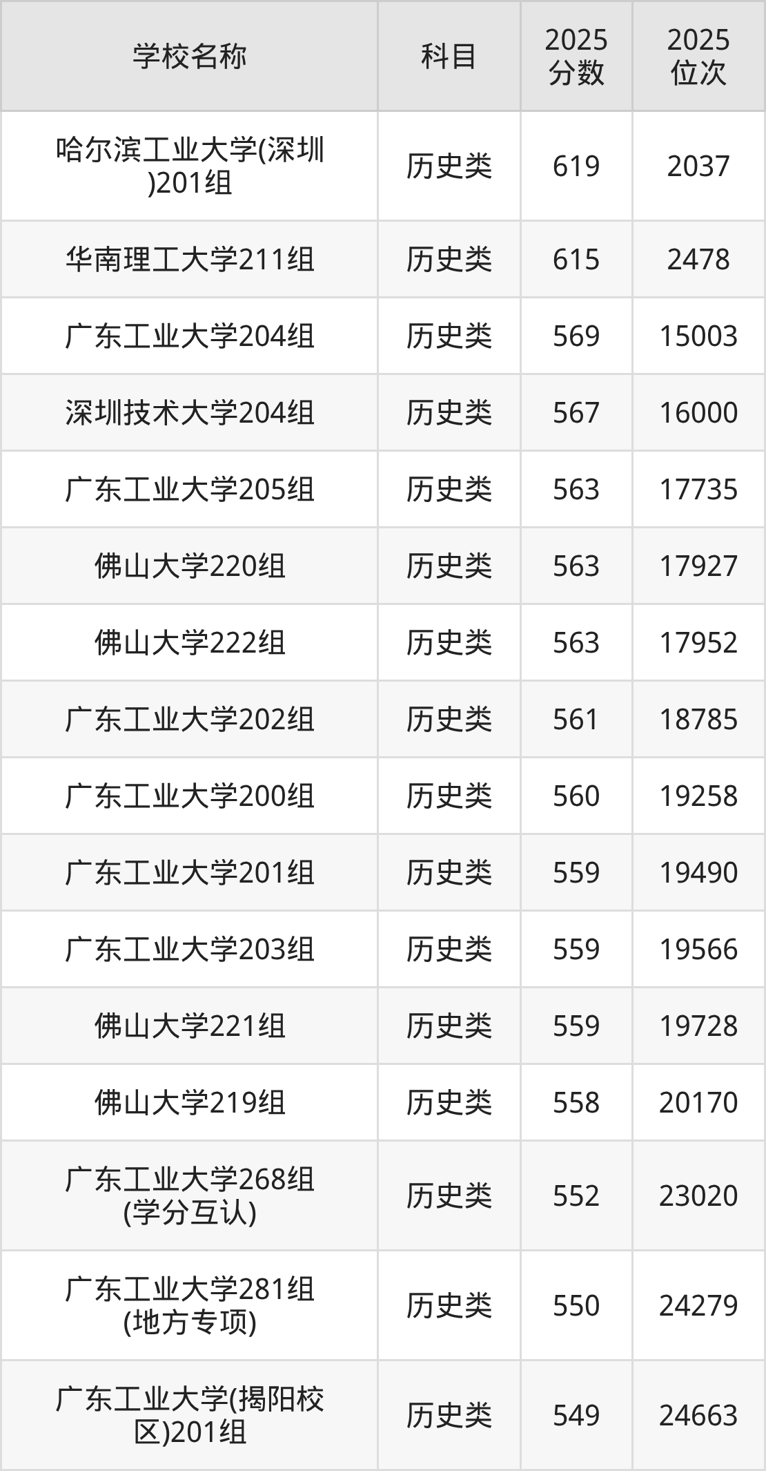下文为2025年广东省理工类大学在广东历史类录取分数线和位次排名表,供大家参考: