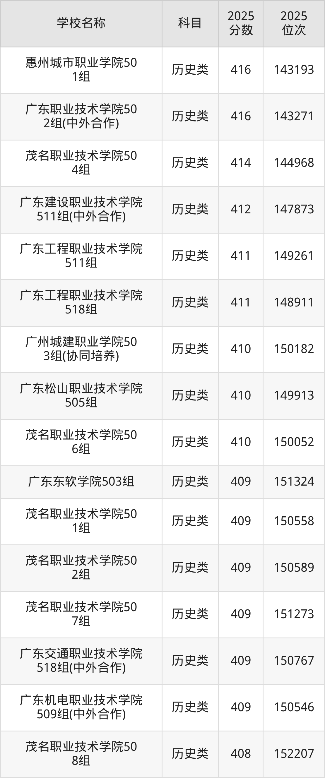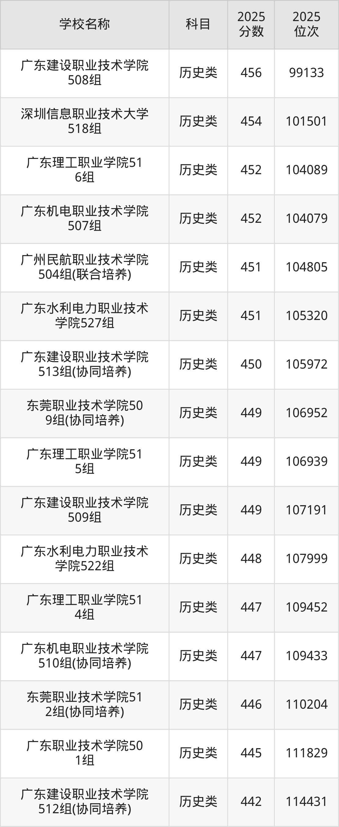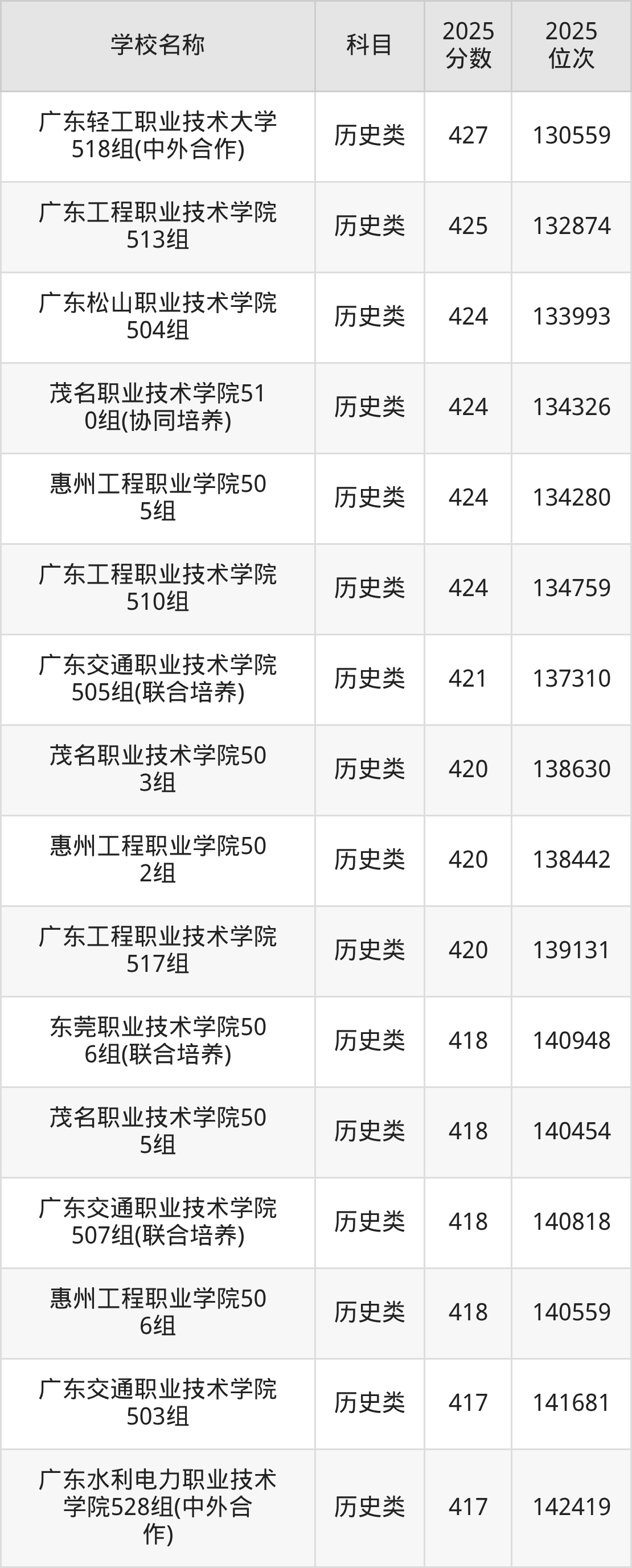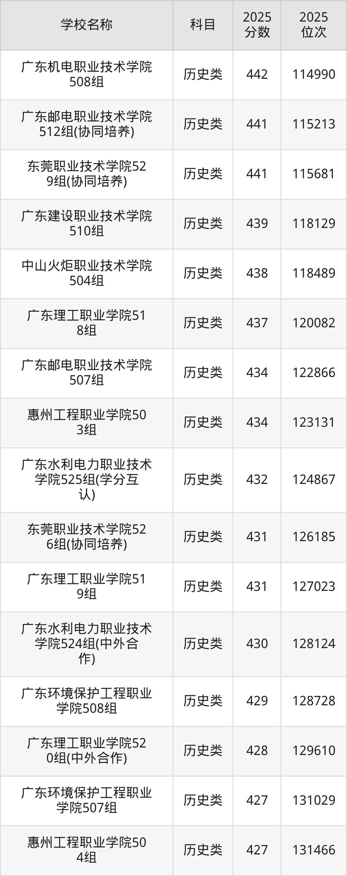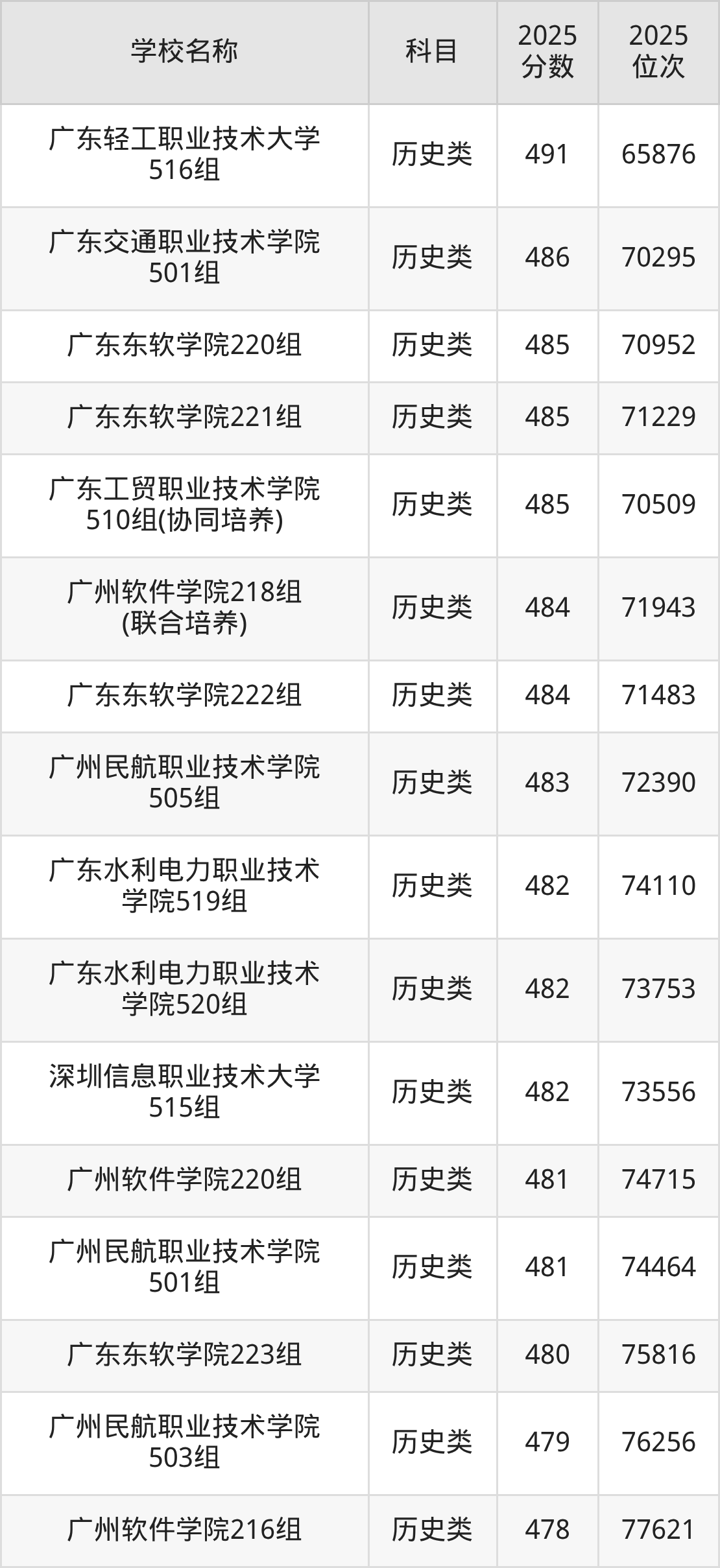 下文为2025年广东省理工类大学在广东历史类录取分数线和位次排名表,供大家参考: