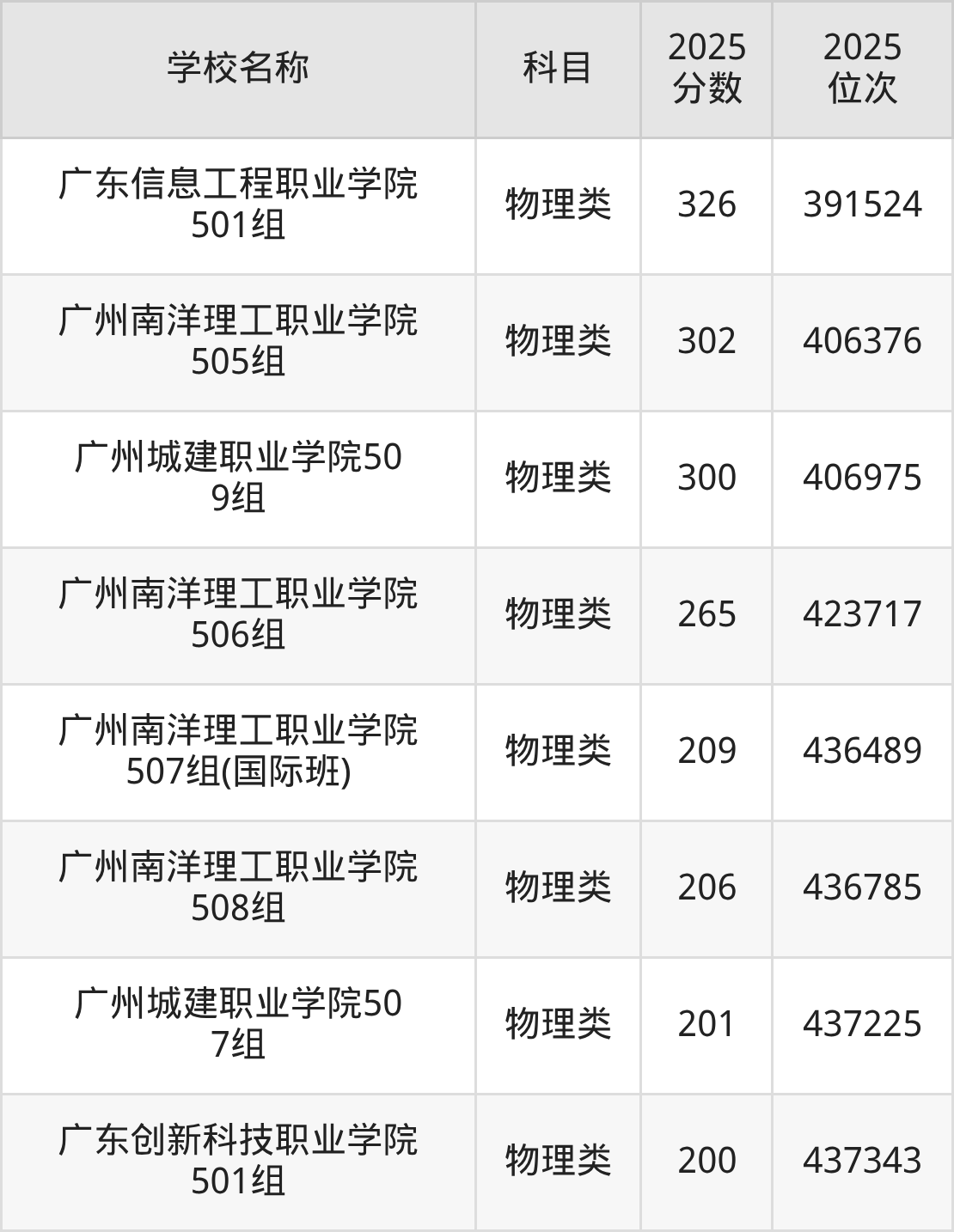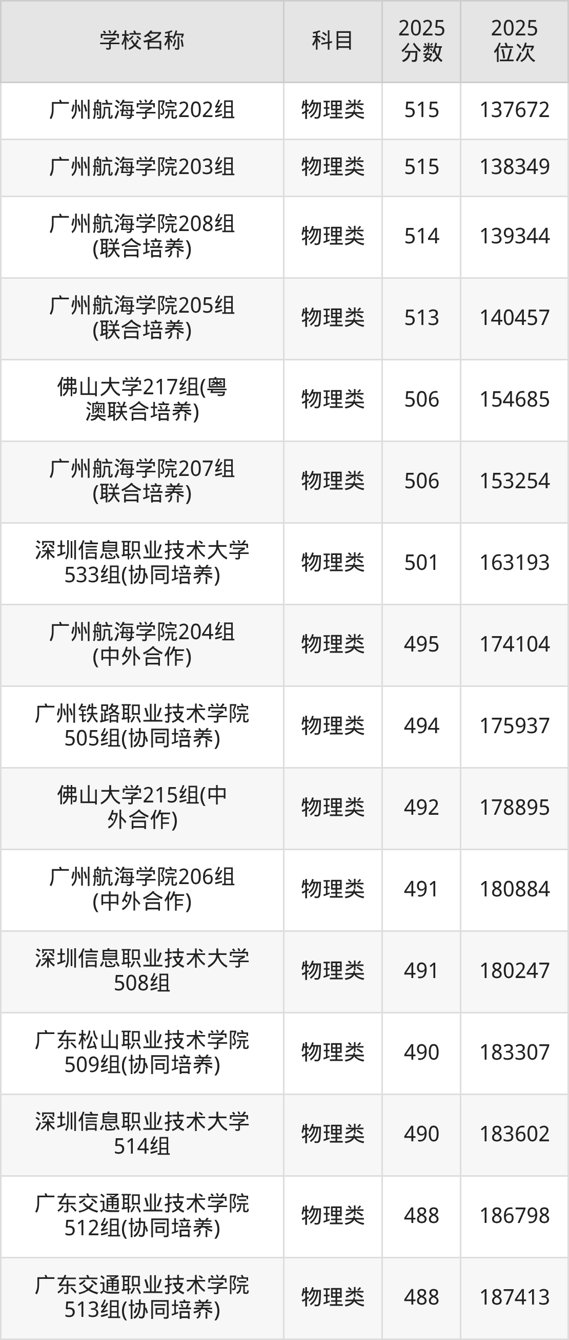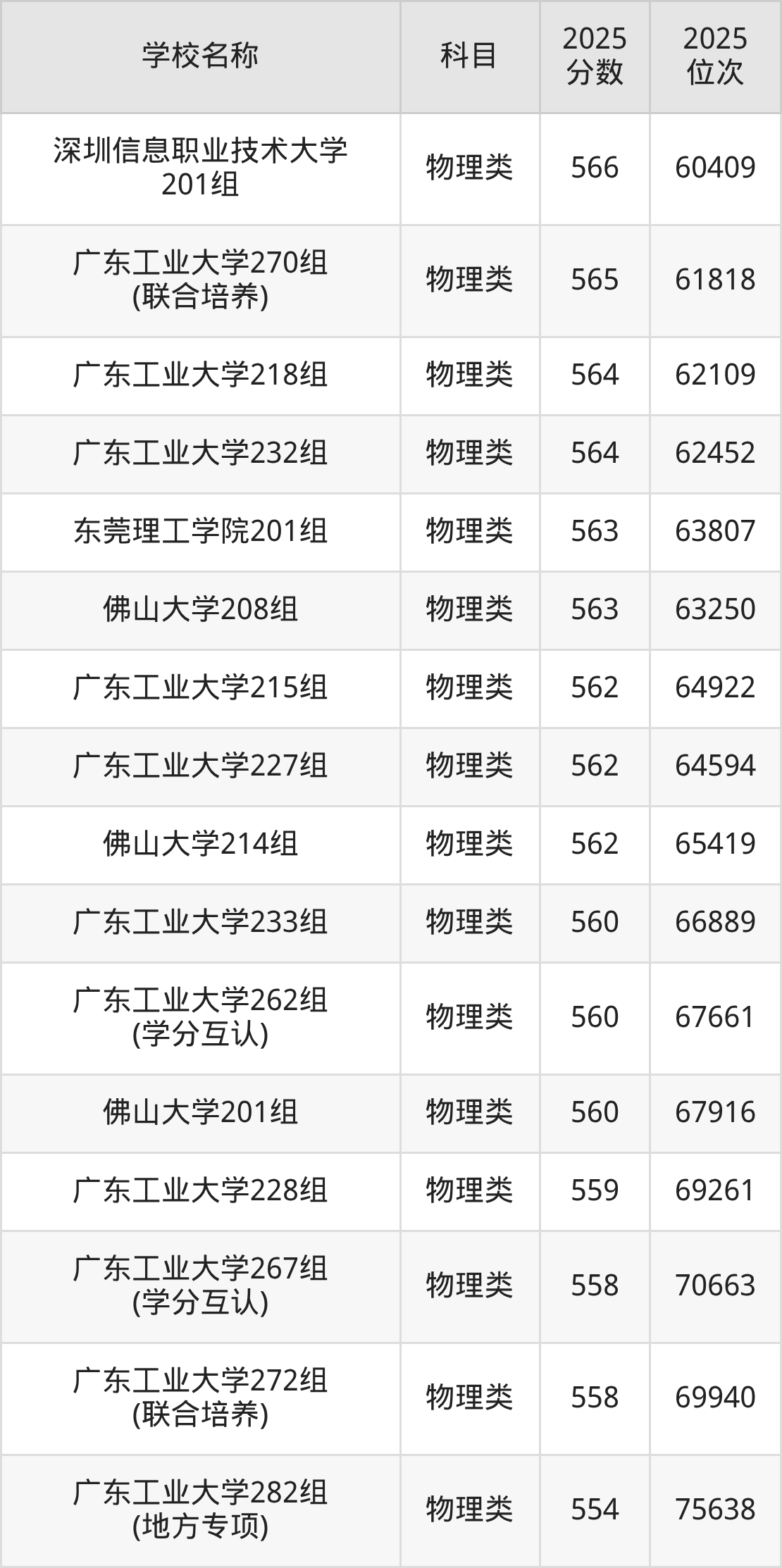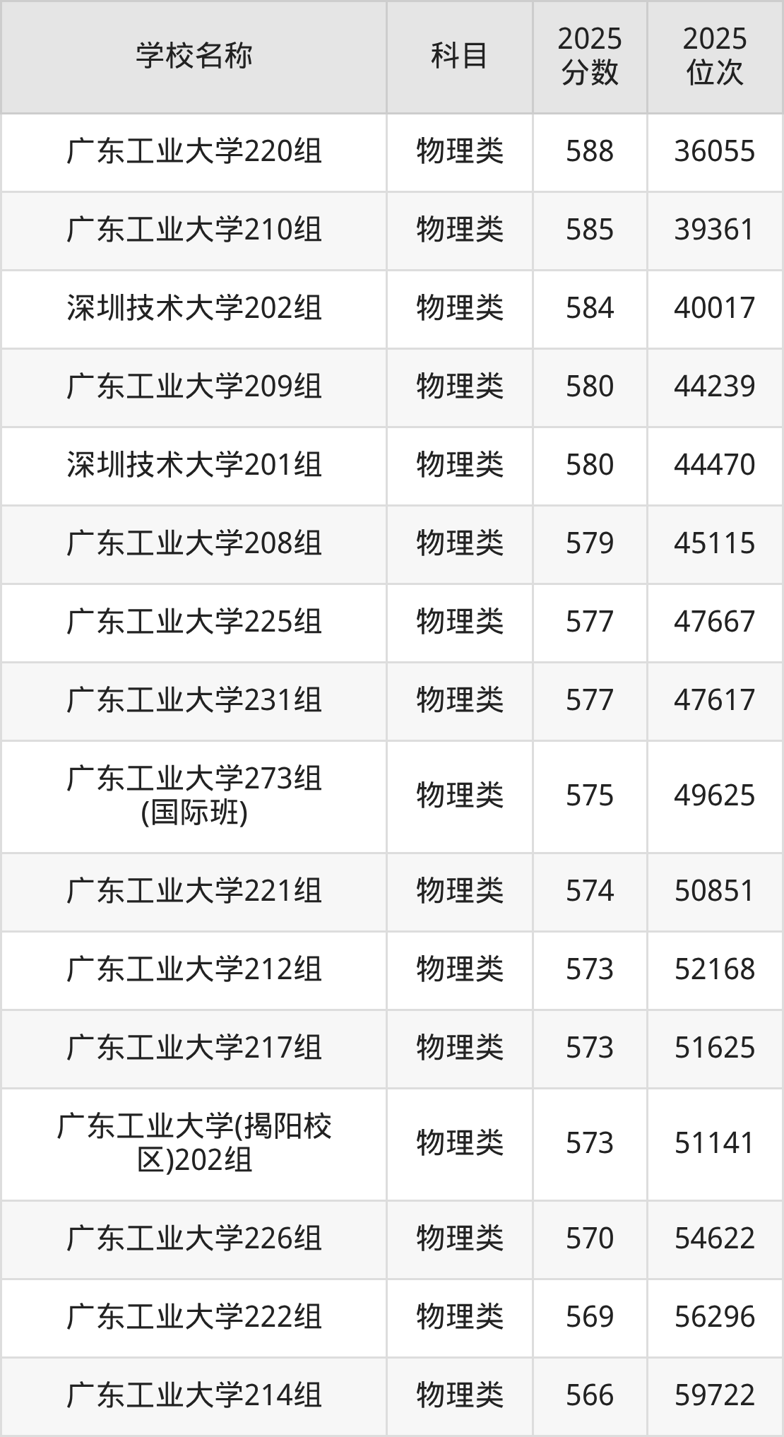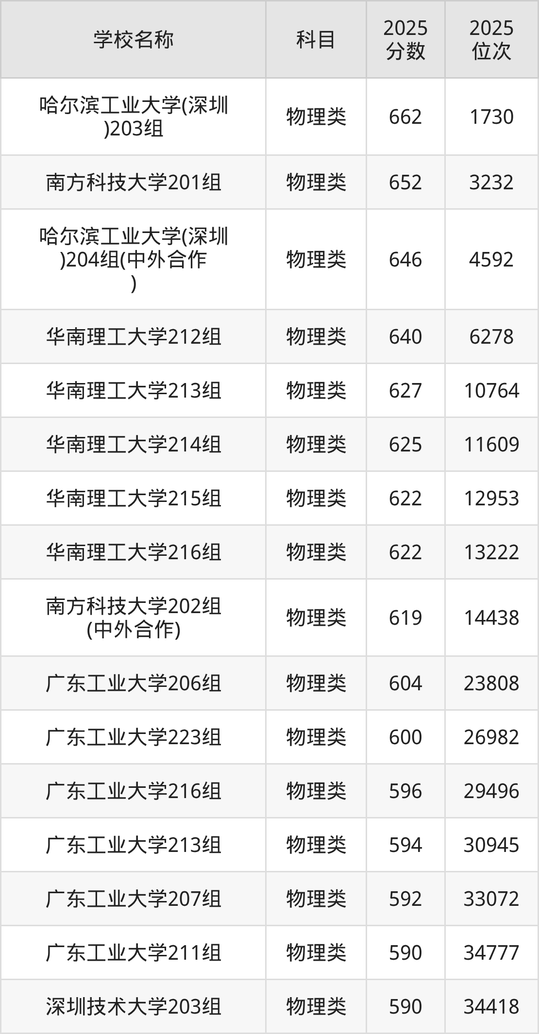 下文为2025年广东省理工类大学在广东物理类录取分数线和位次排名表,供大家参考: