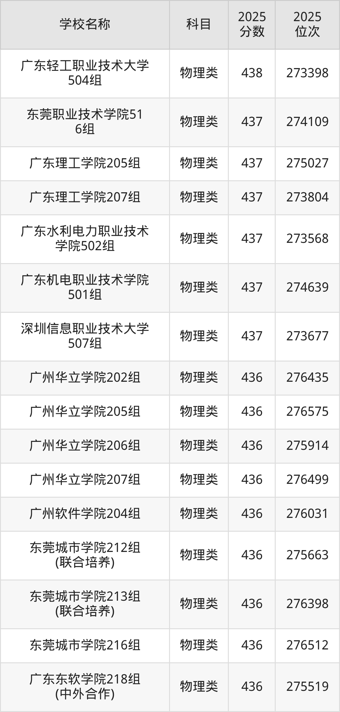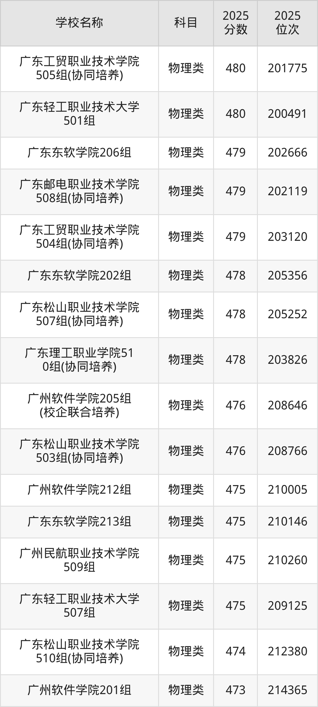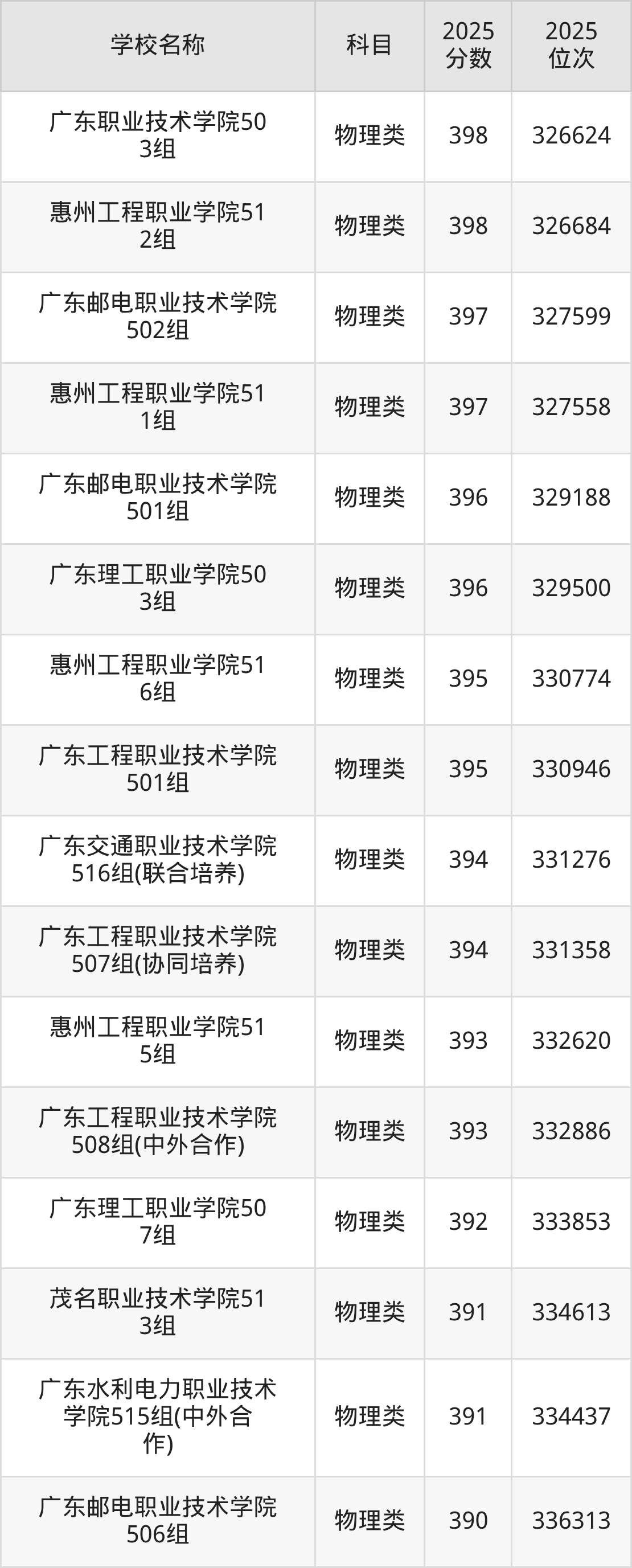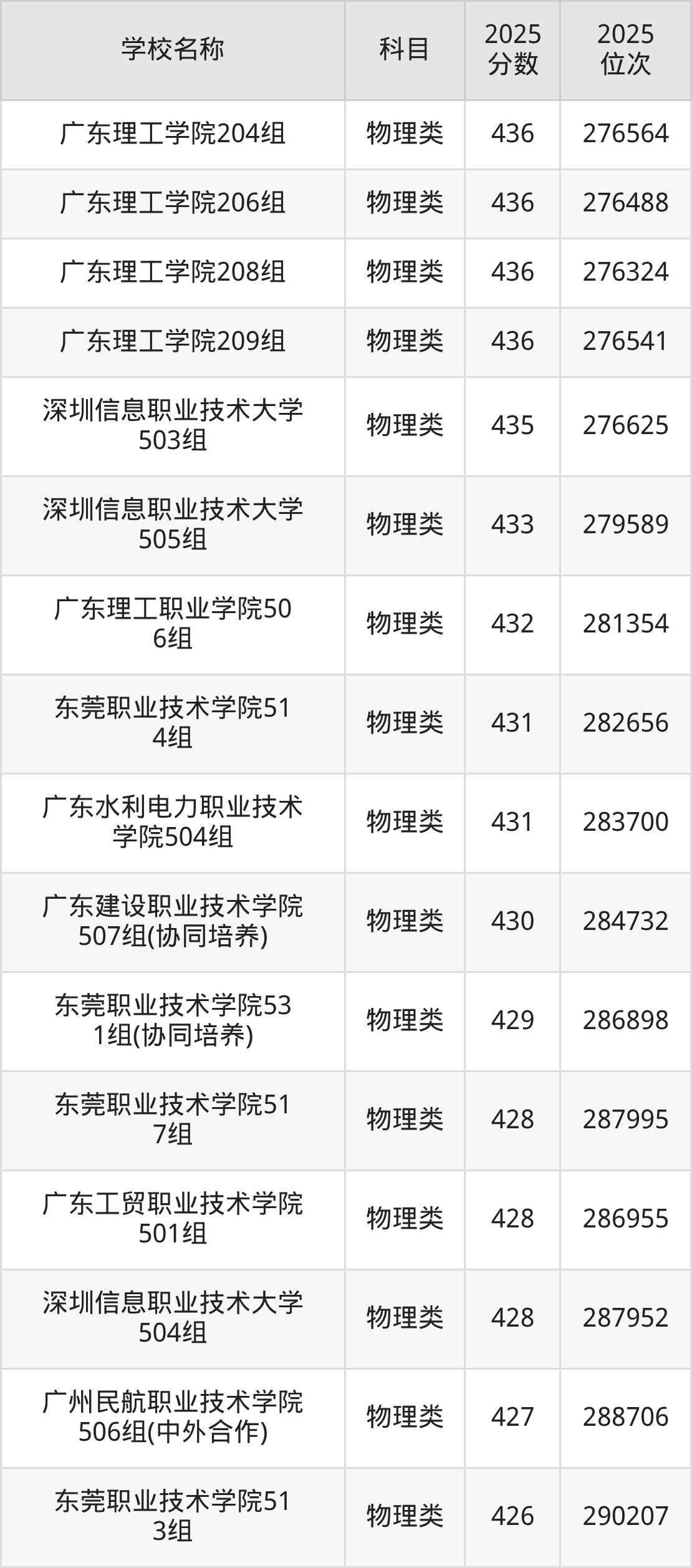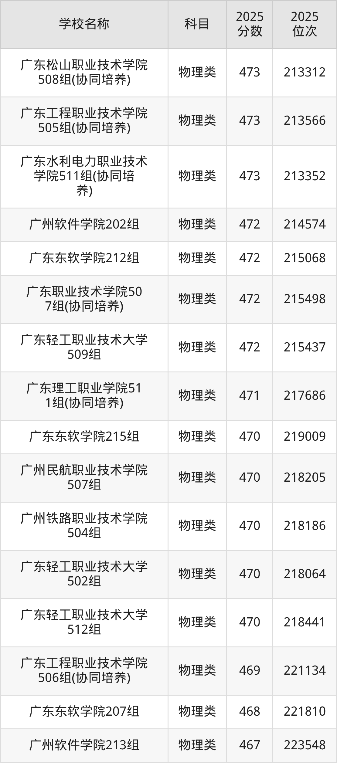 下文为2025年广东省理工类大学在广东物理类录取分数线和位次排名表,供大家参考: