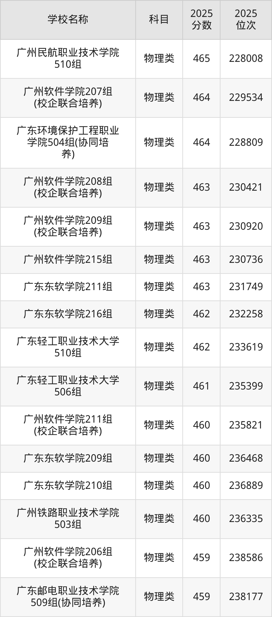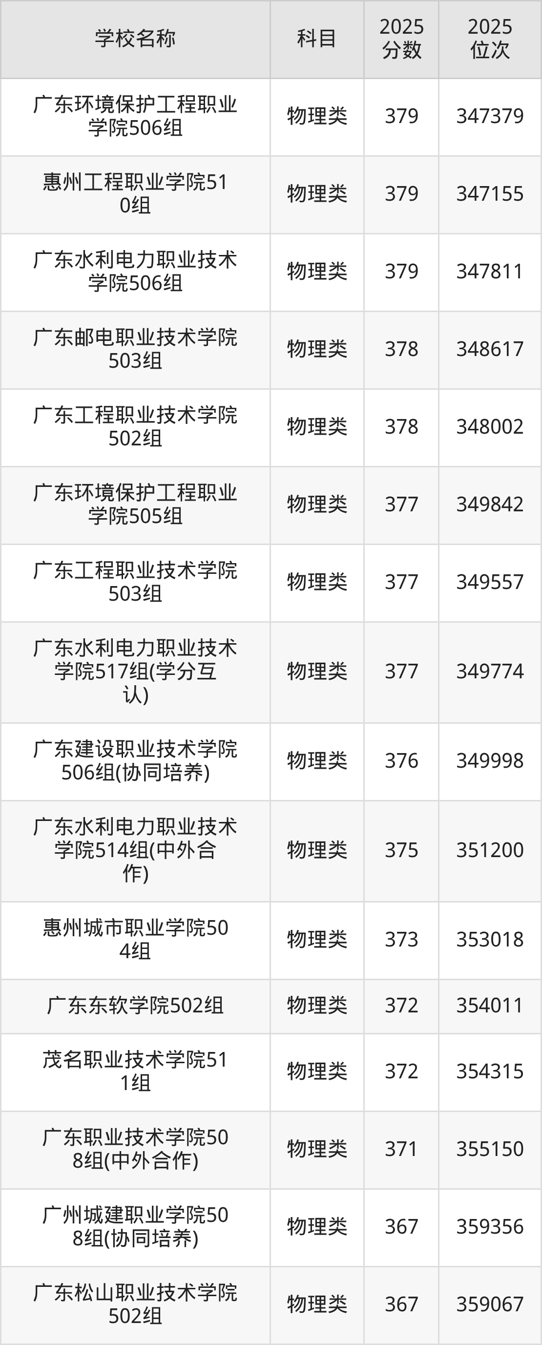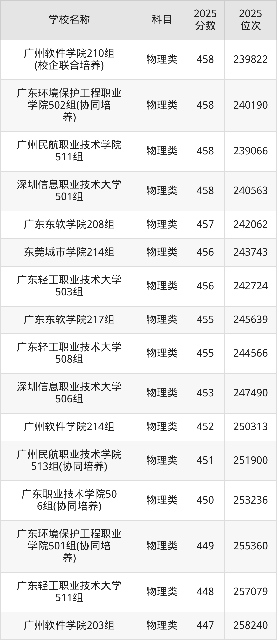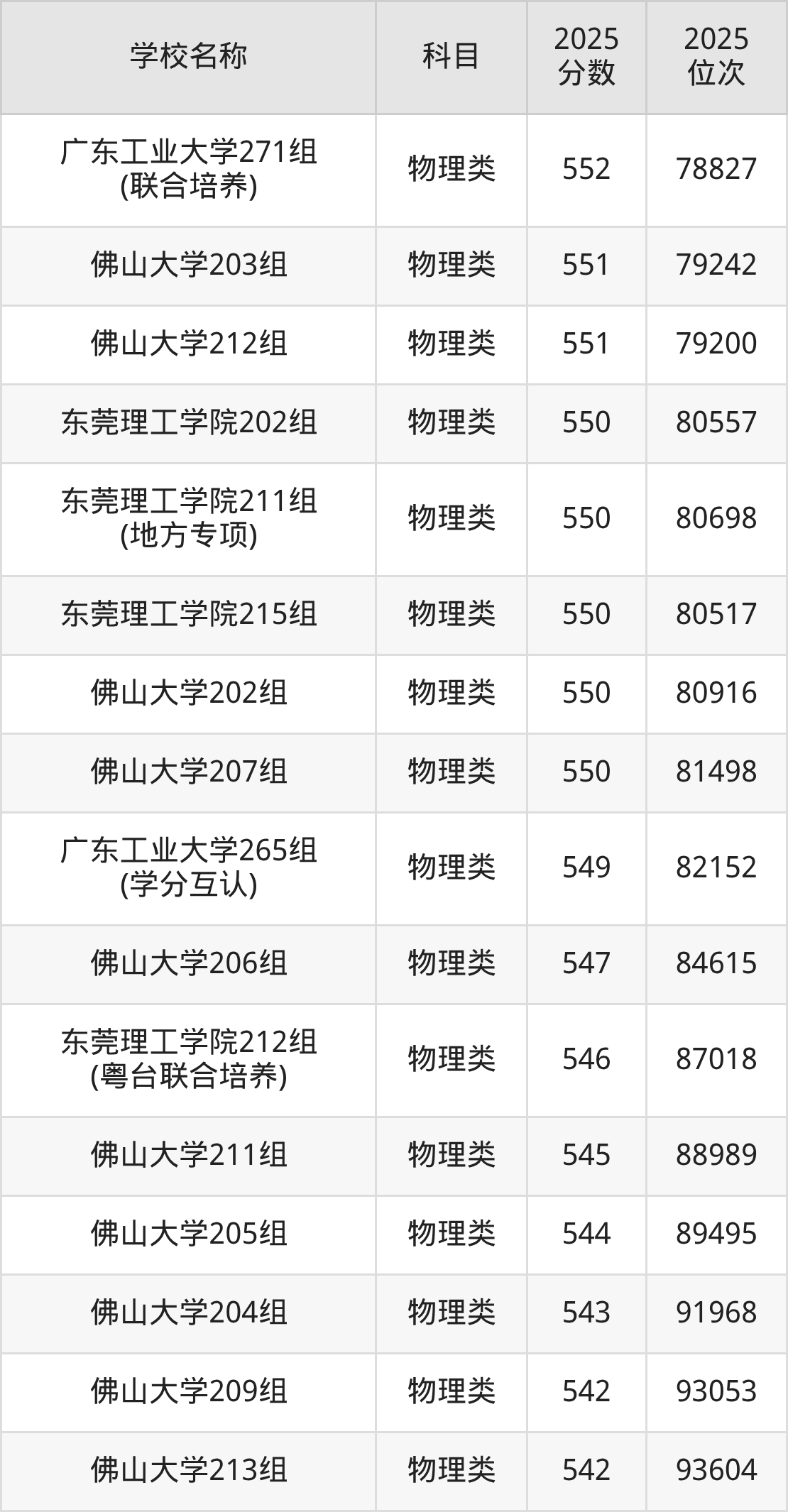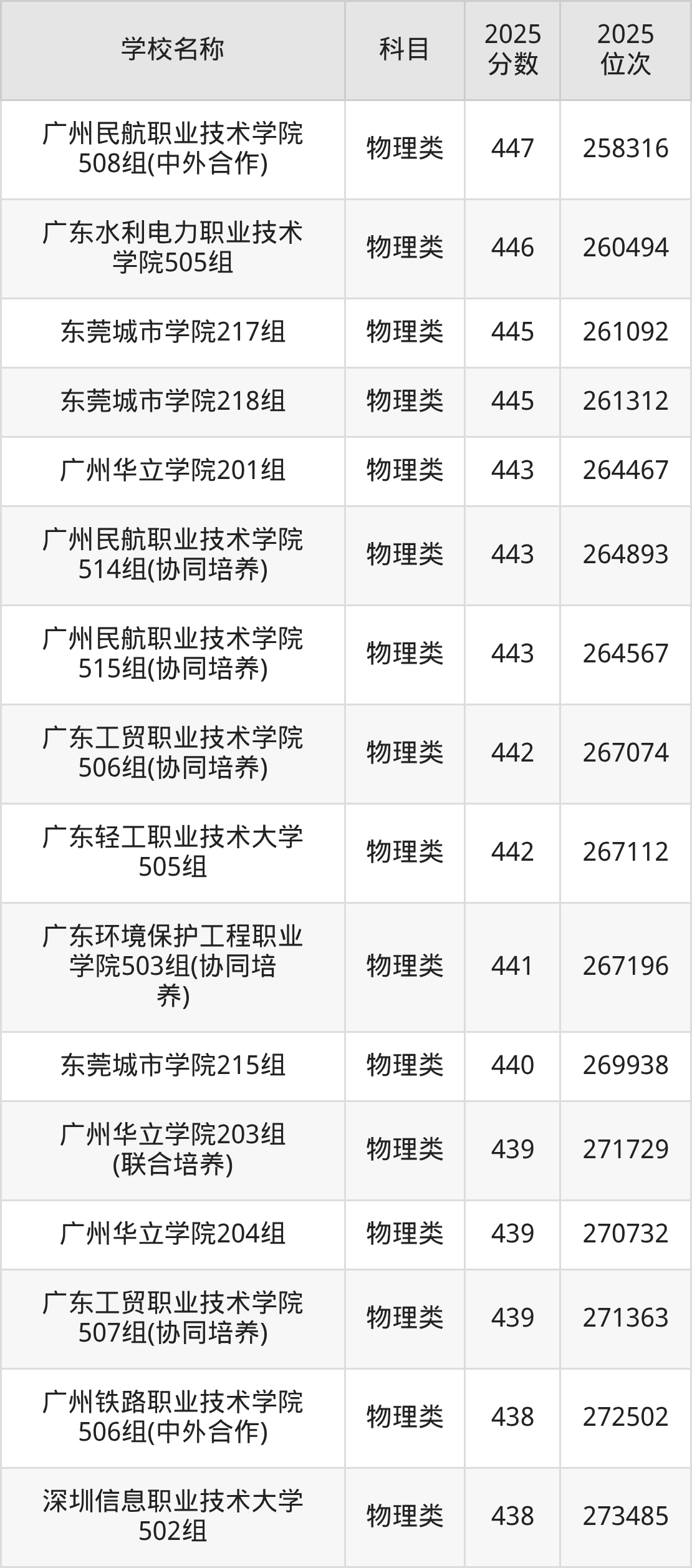 下文为2025年广东省理工类大学在广东物理类录取分数线和位次排名表,供大家参考: