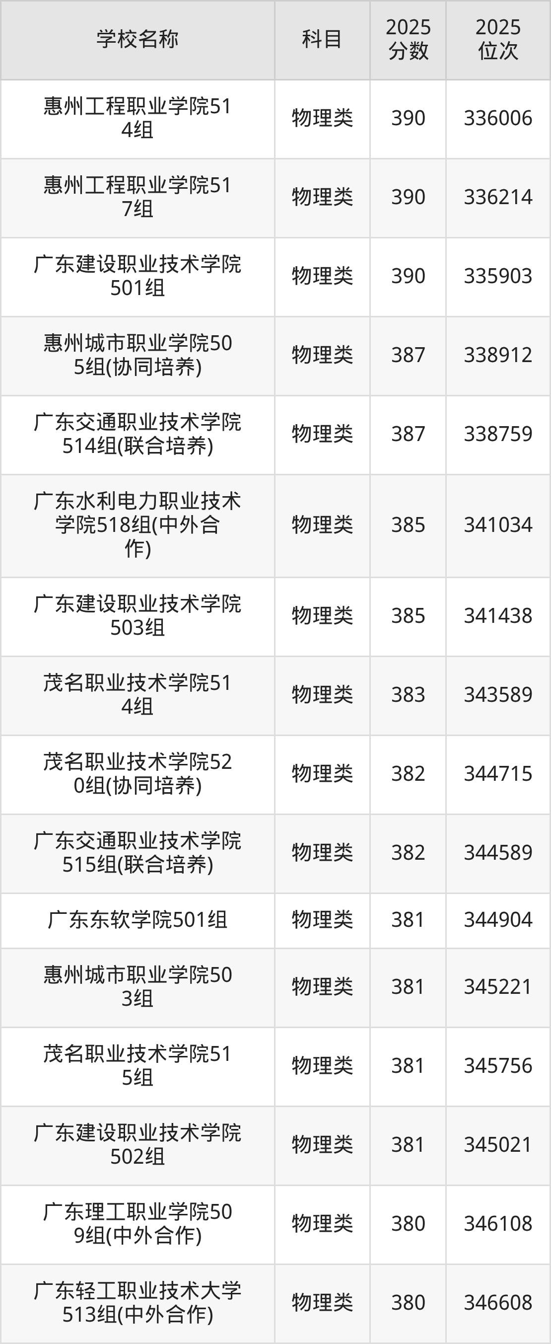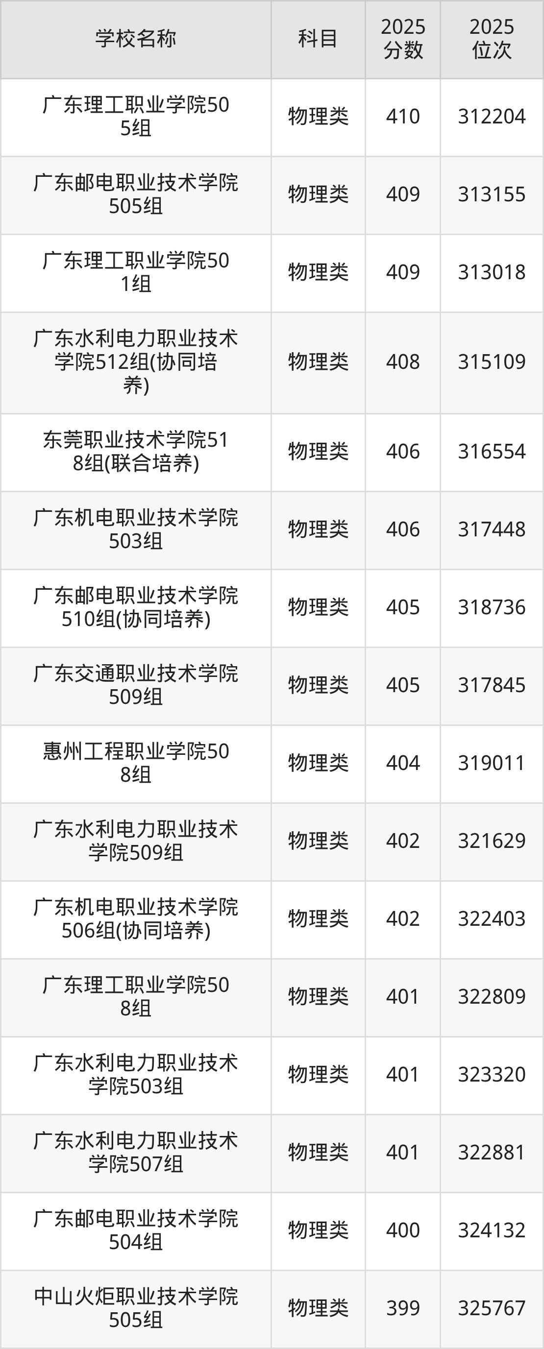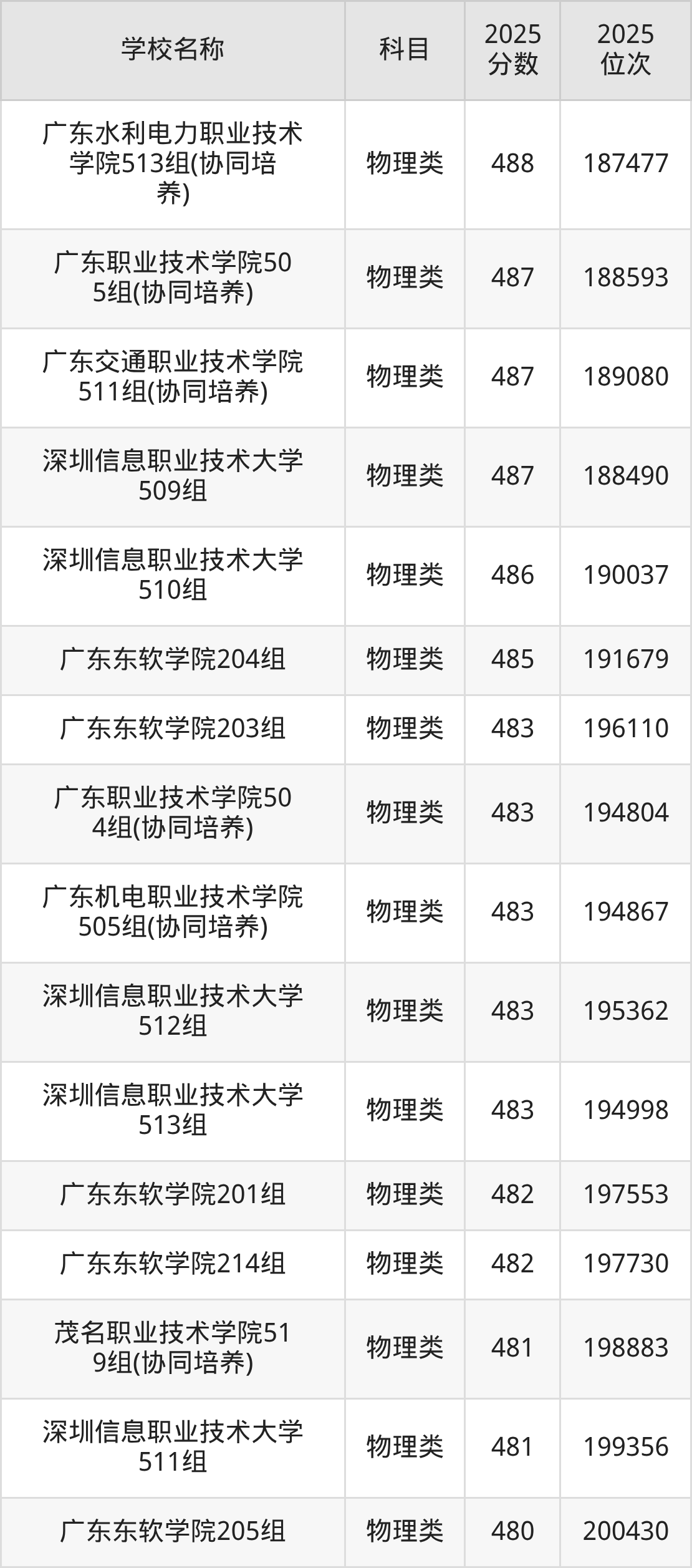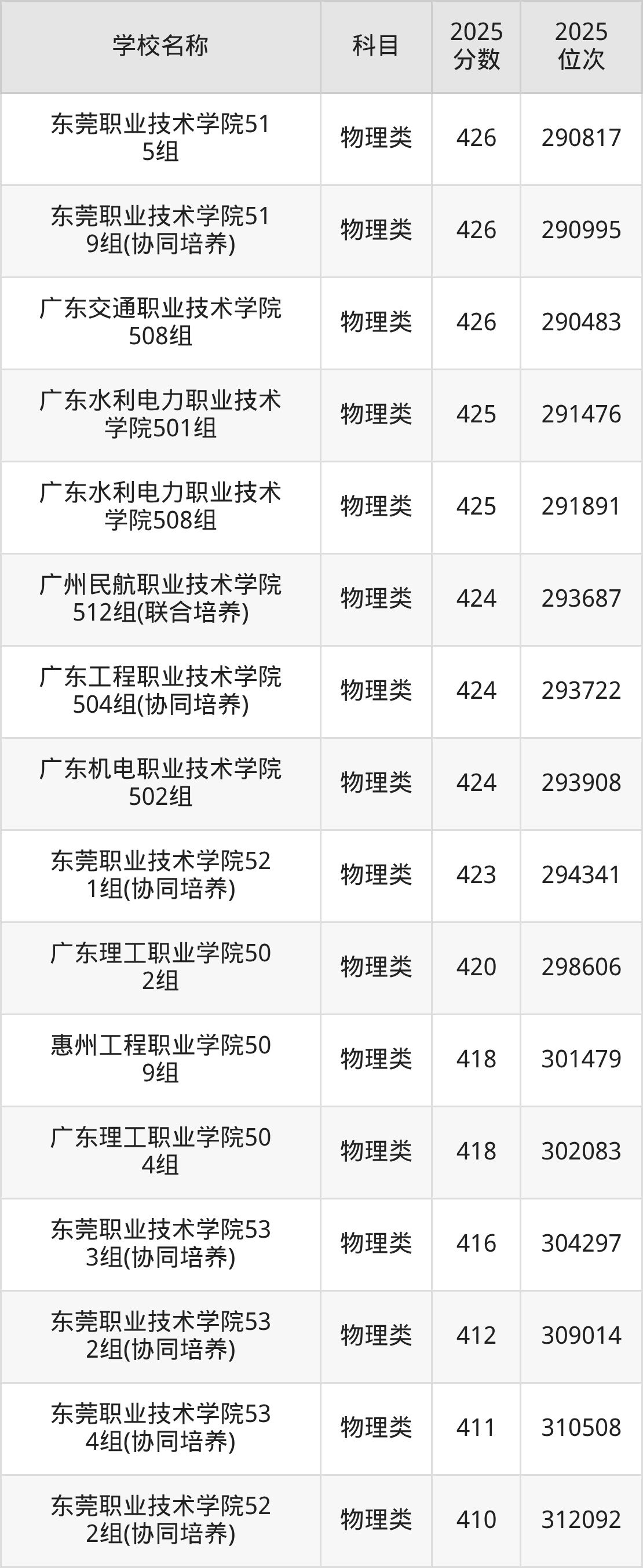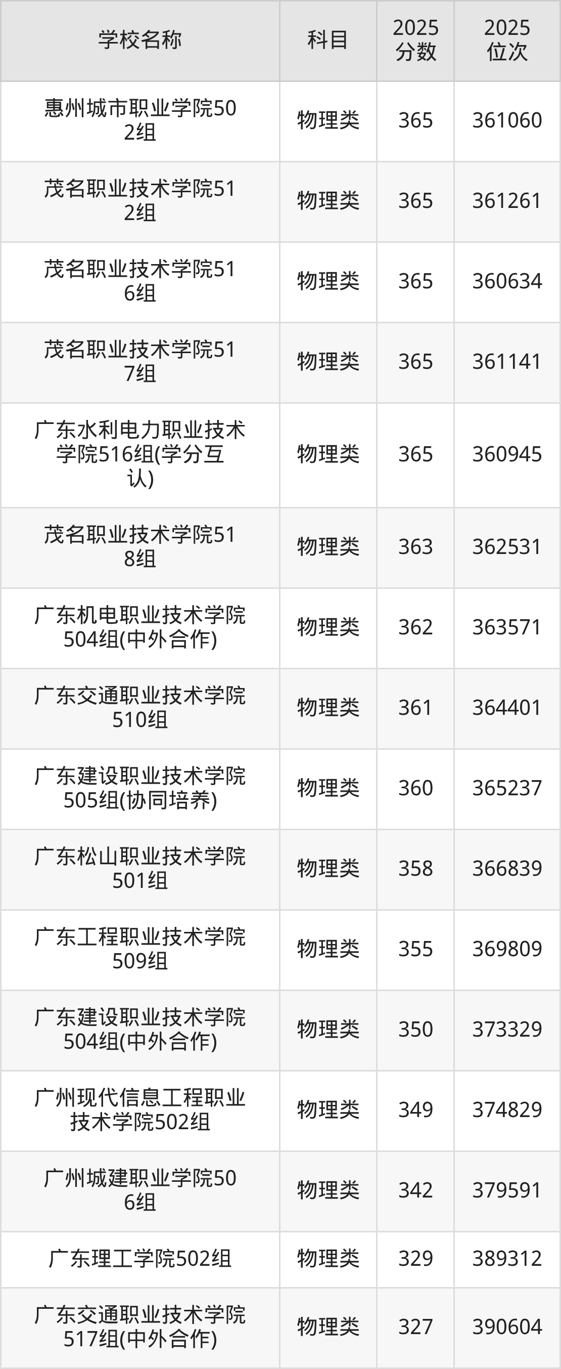 下文为2025年广东省理工类大学在广东物理类录取分数线和位次排名表,供大家参考: