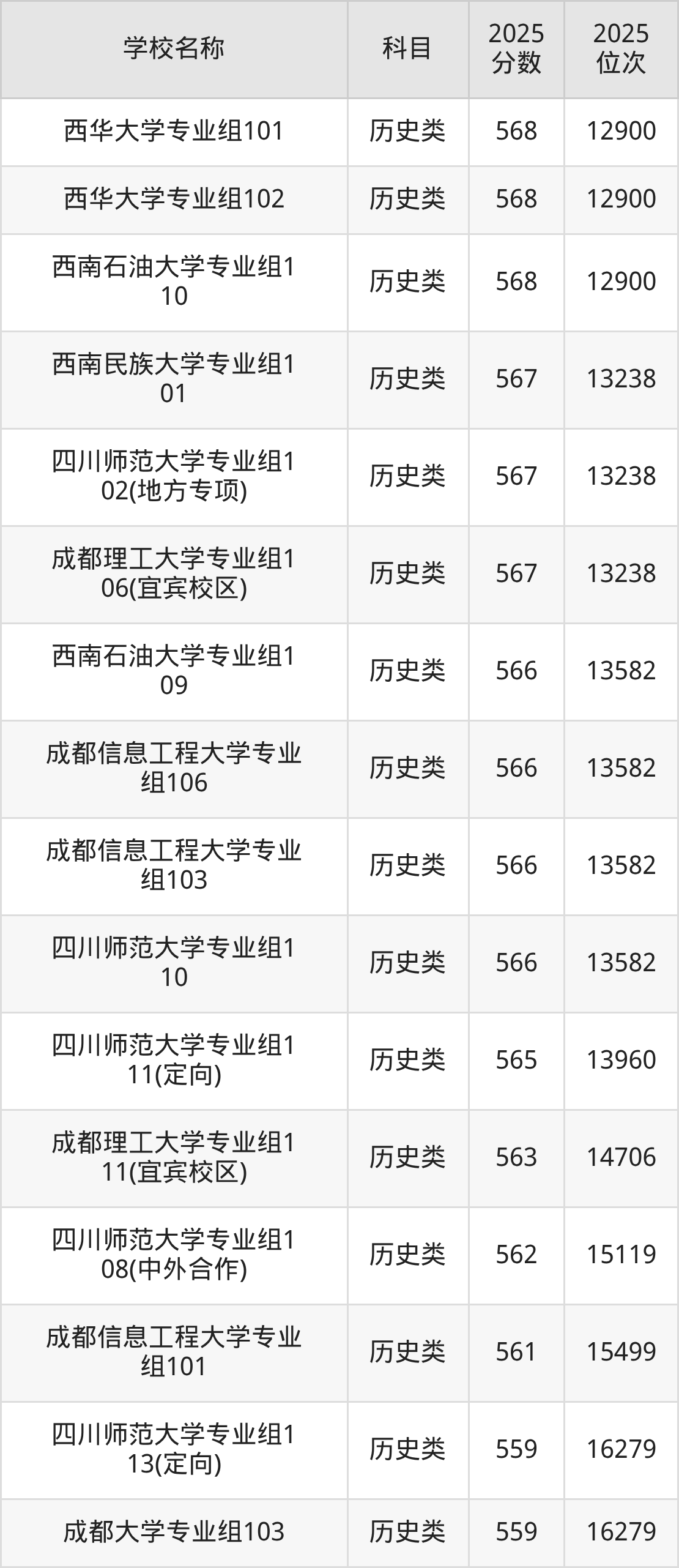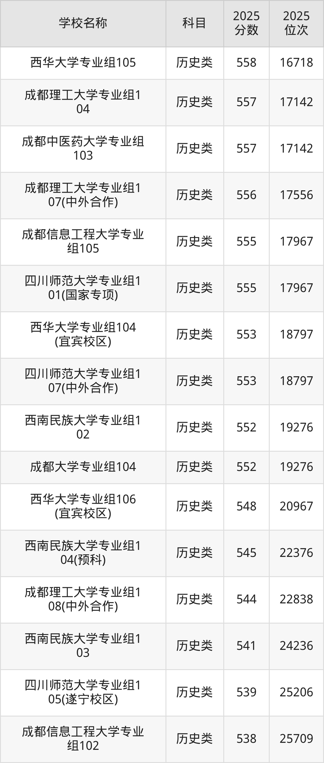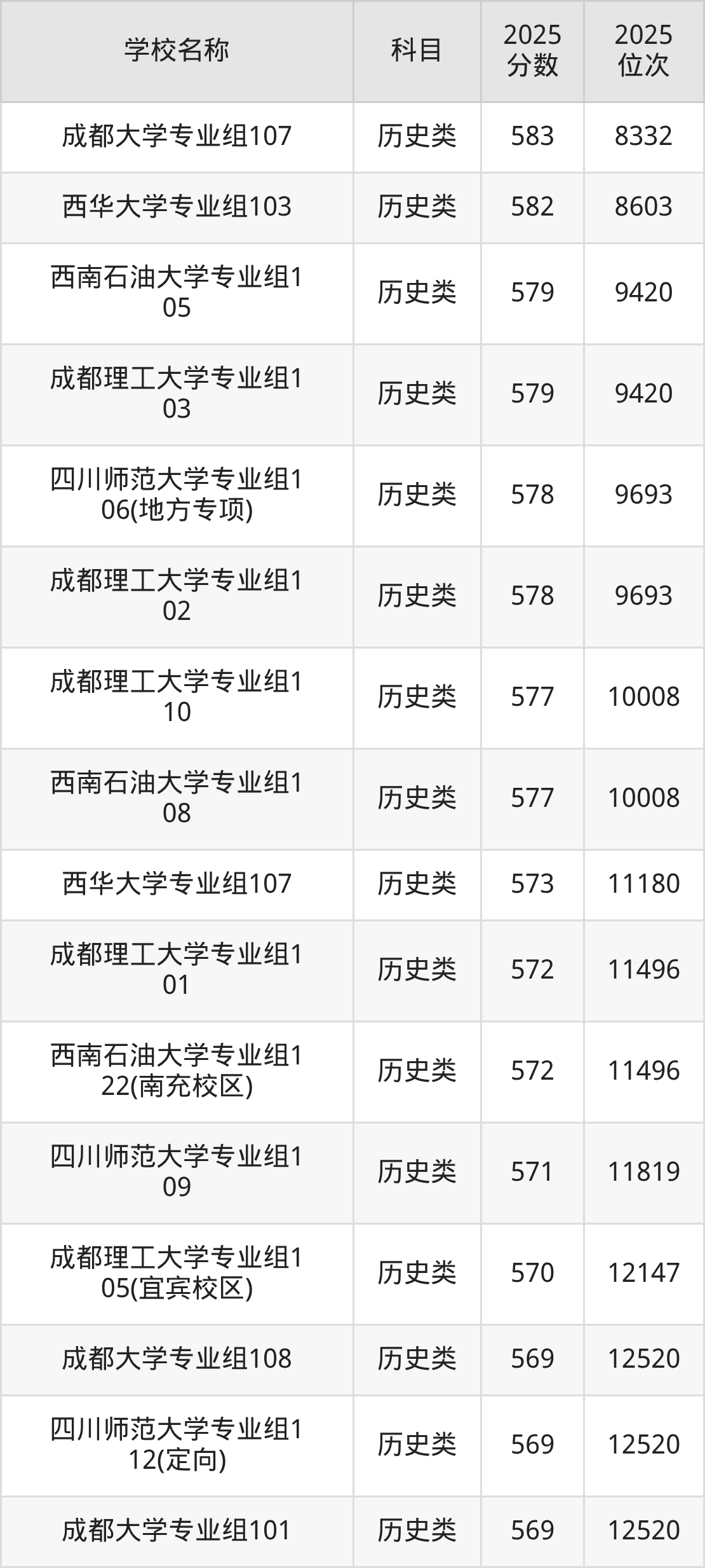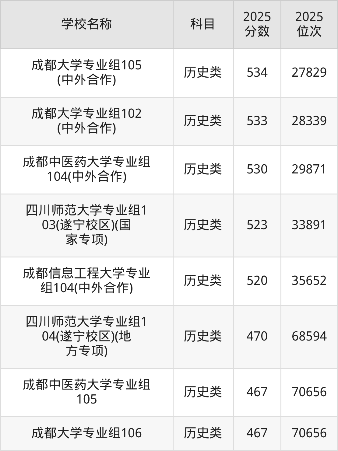 下文为2025年成都市一本大学在四川历史类录取分数线和位次排名表,供大家参考: