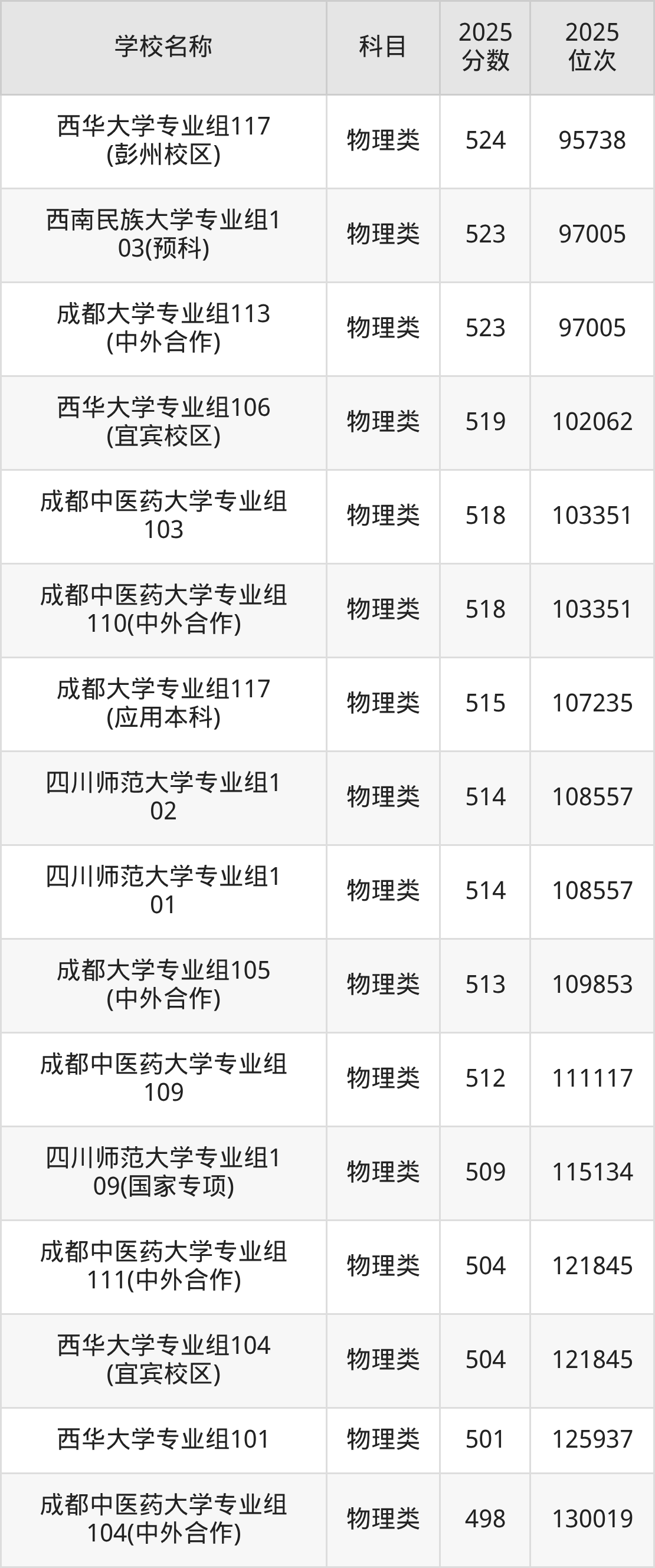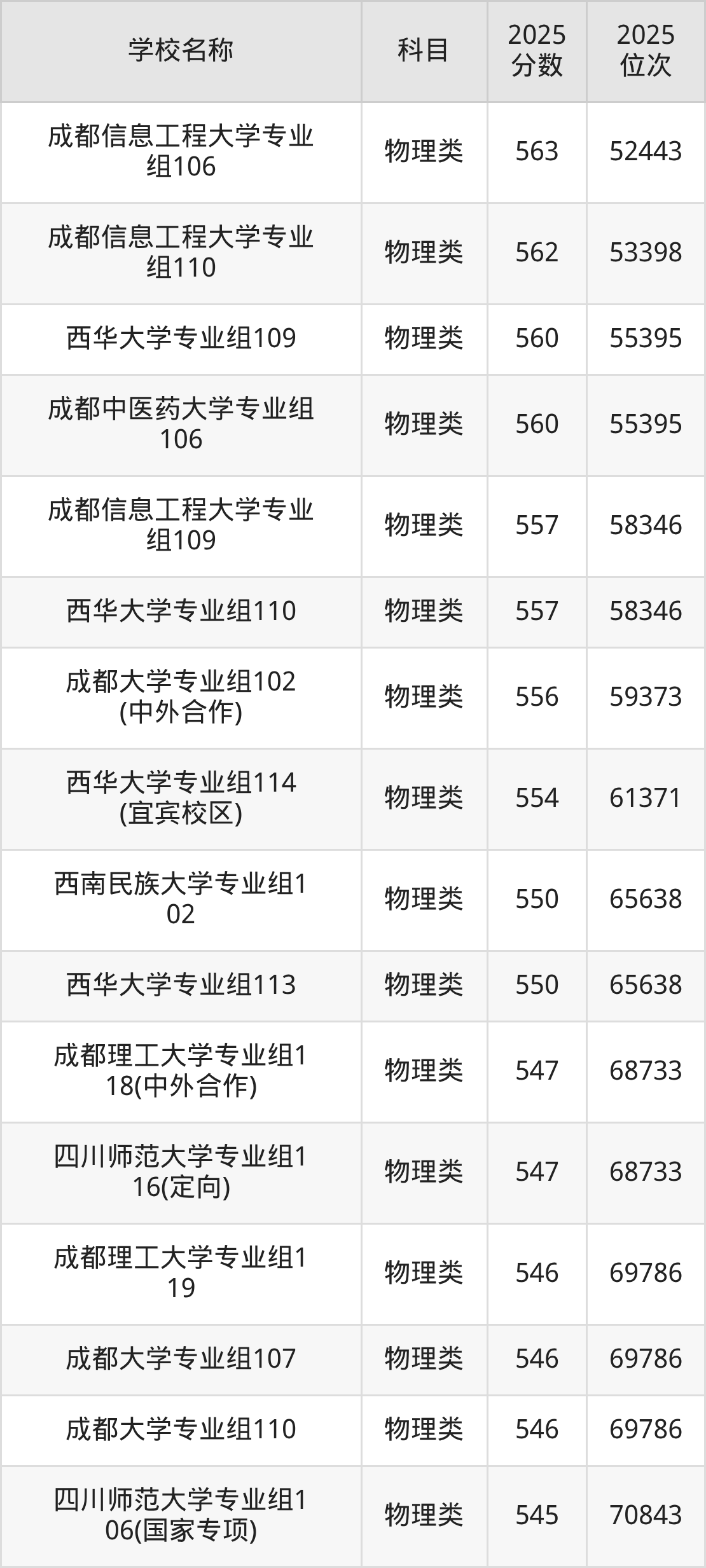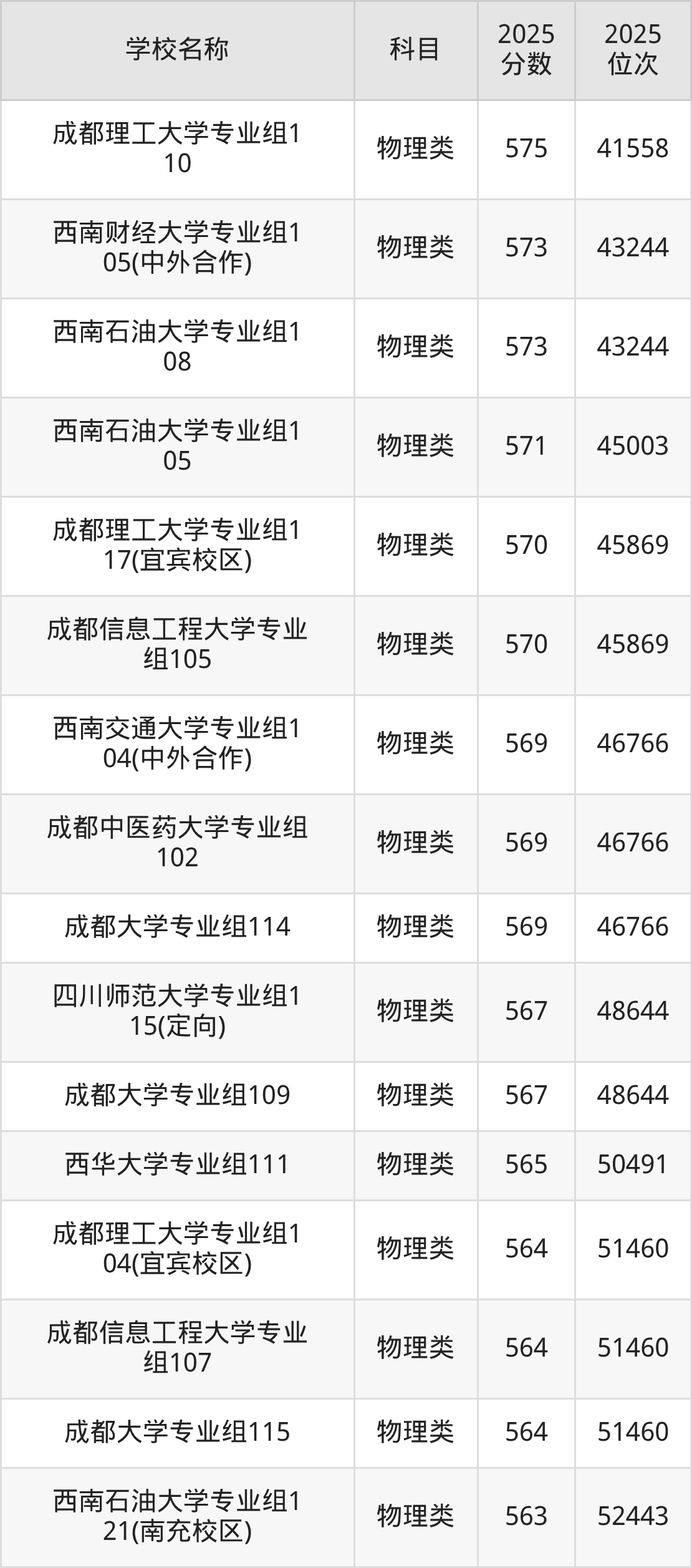 下文为2025年成都市一本大学在四川物理类录取分数线和位次排名表,供大家参考: