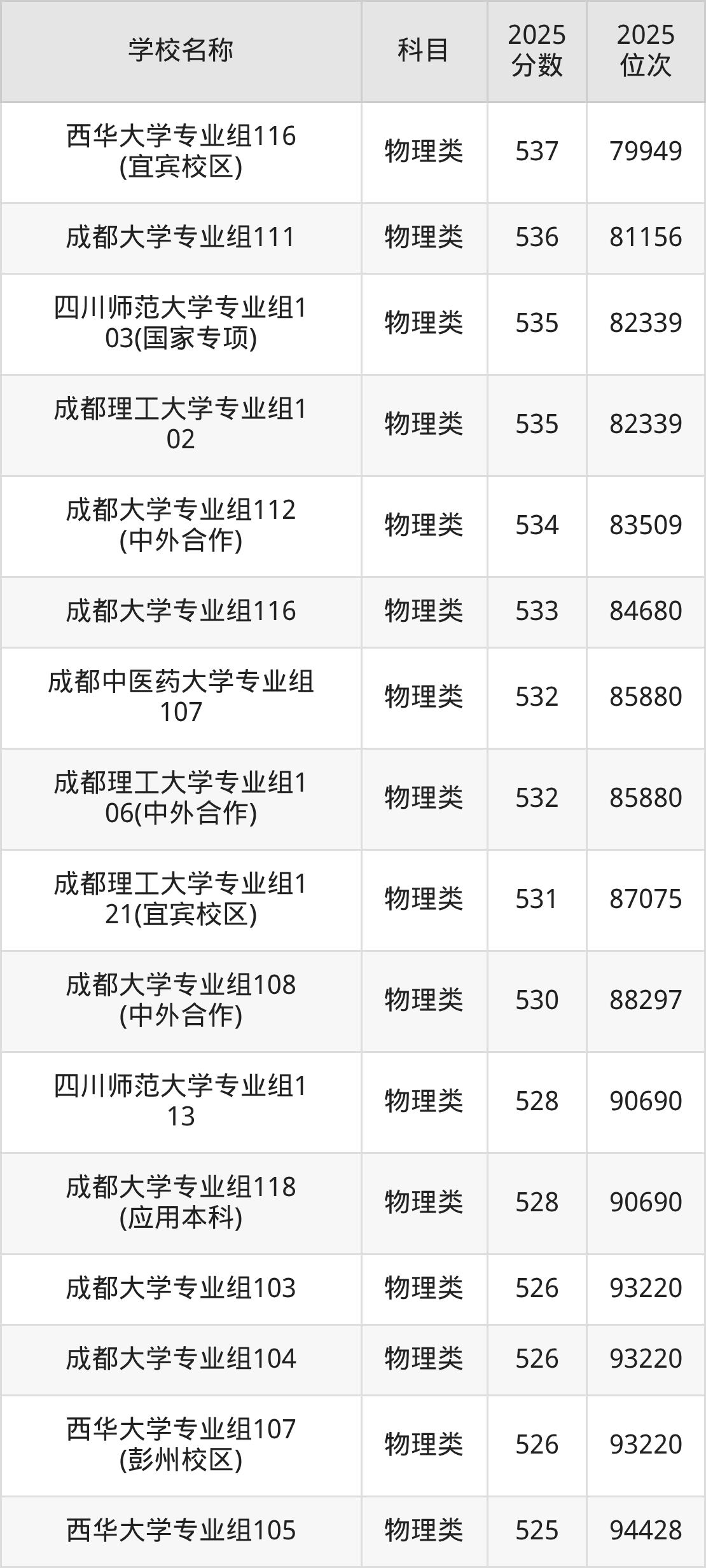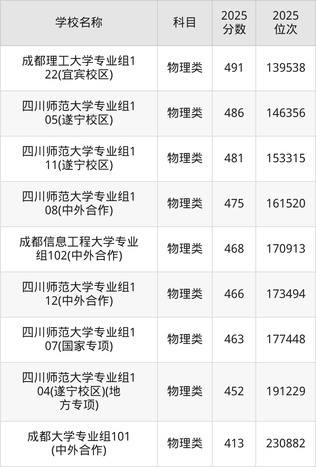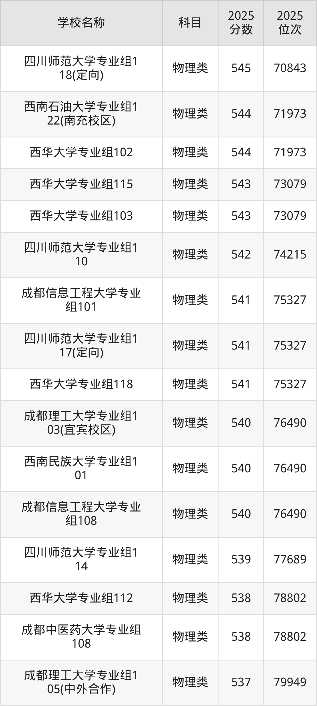 下文为2025年成都市一本大学在四川物理类录取分数线和位次排名表,供大家参考: