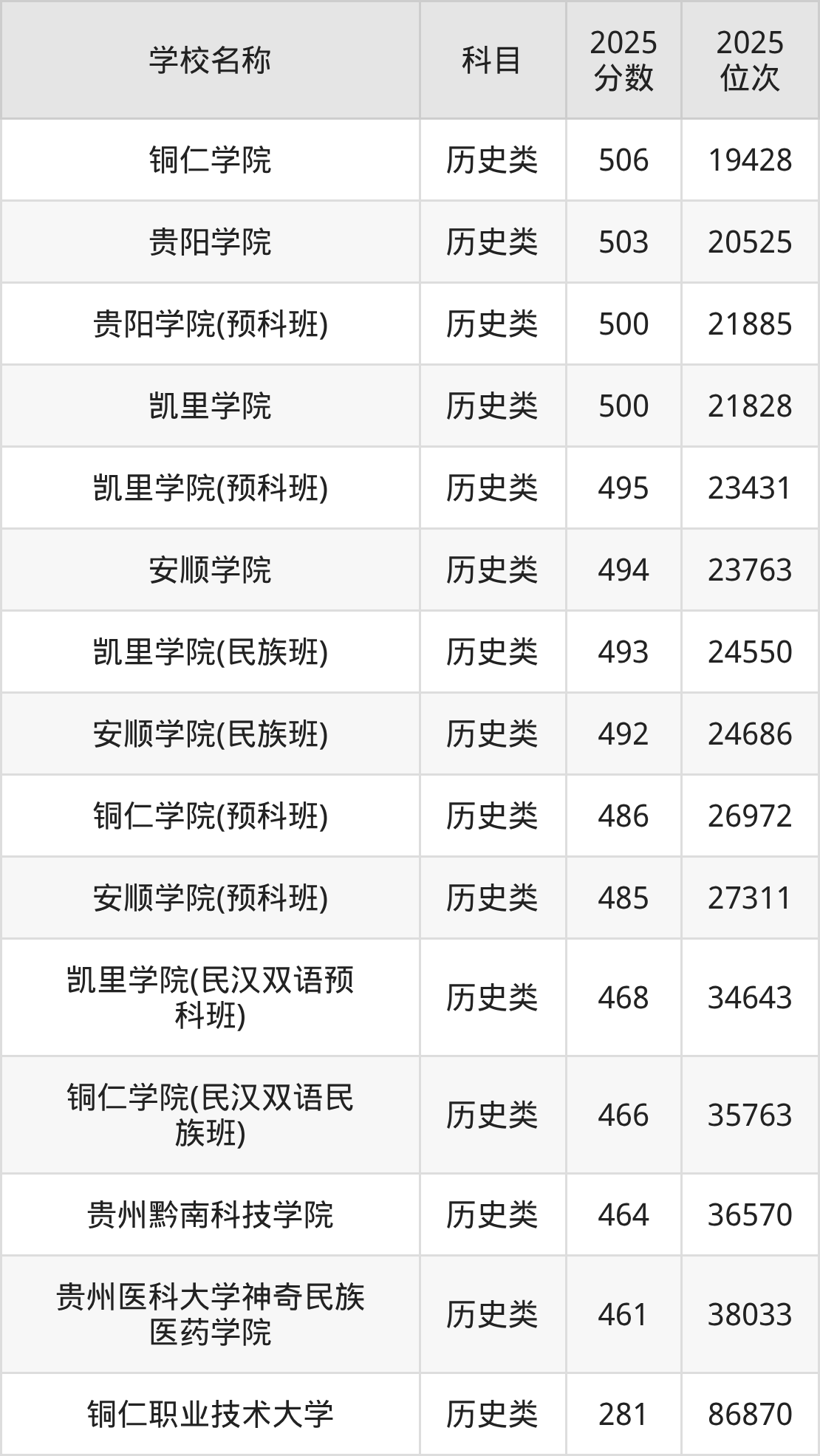 下文为2025年贵州省二本综合大学在贵州历史类录取分数线和位次排名表,供大家参考: