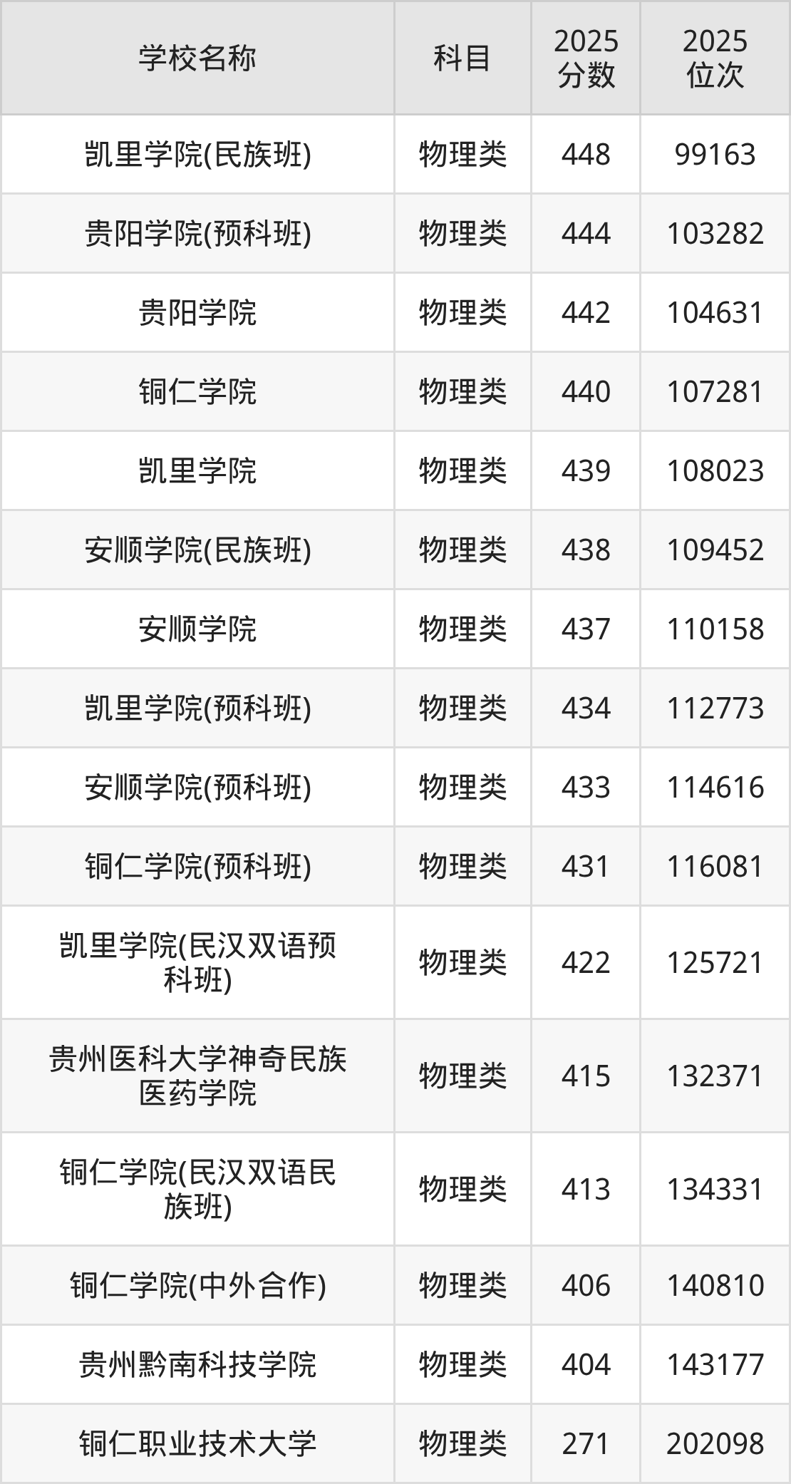 下文为2025年贵州省二本综合大学在贵州物理类录取分数线和位次排名表,供大家参考: