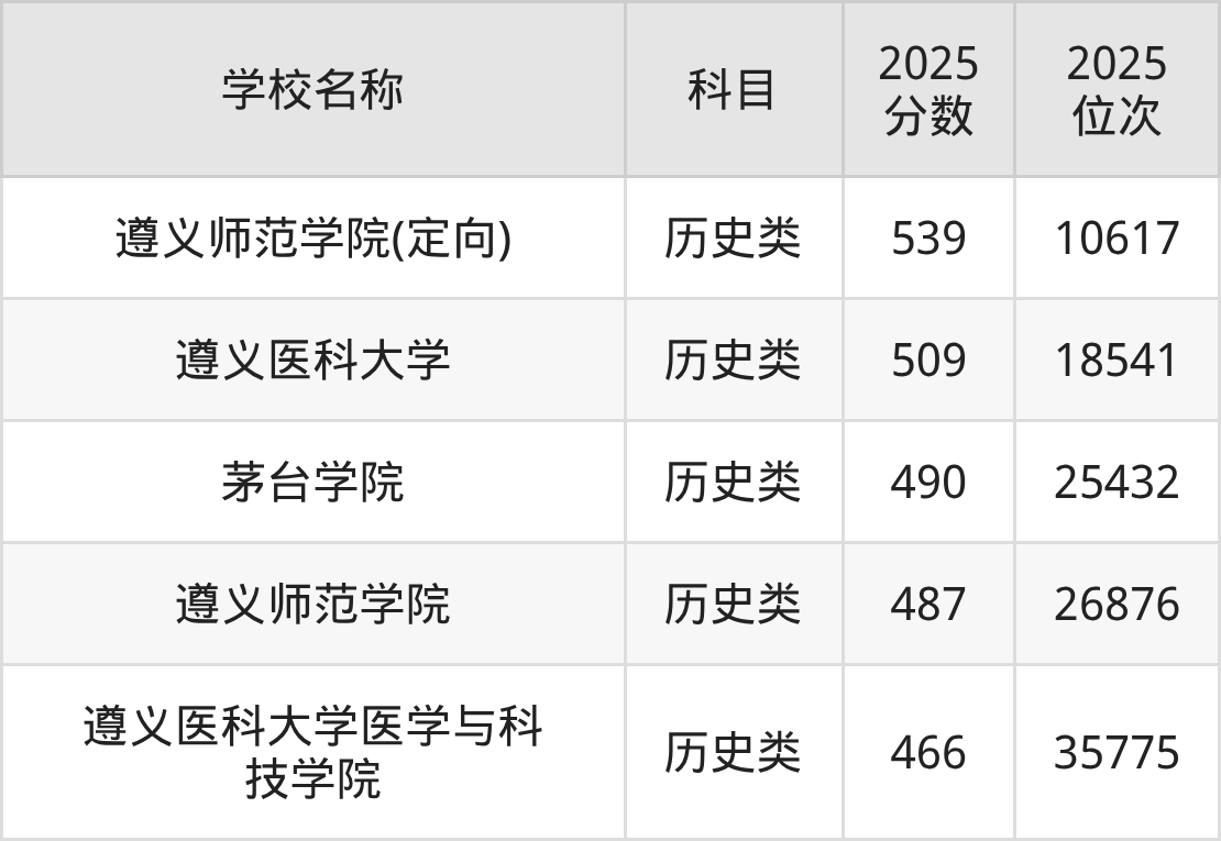 下文为2025年遵义市本科大学在贵州历史类录取分数线和位次排名表,供大家参考: