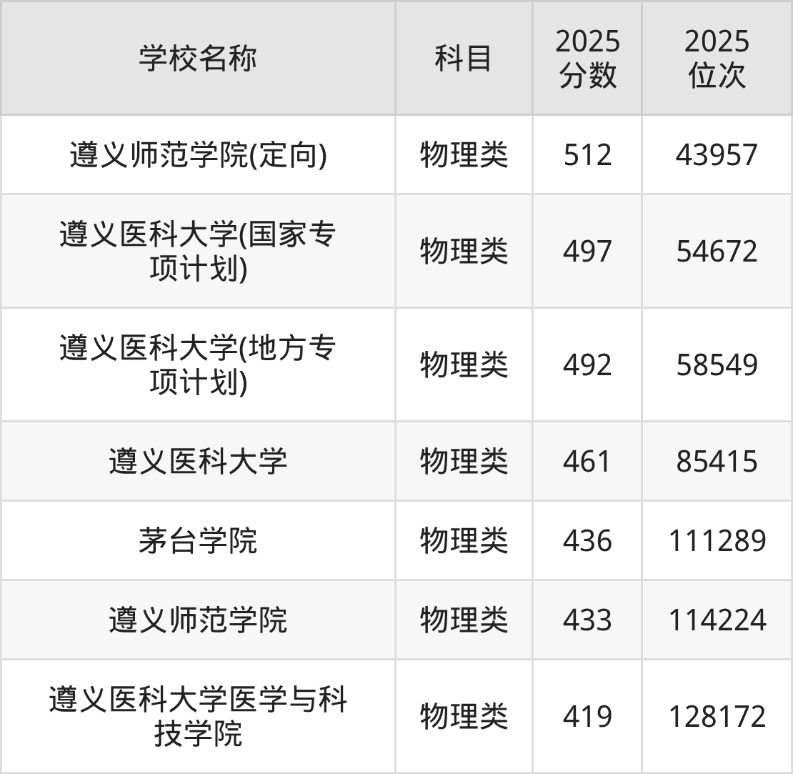 下文为2025年遵义市本科大学在贵州物理类录取分数线和位次排名表,供大家参考: