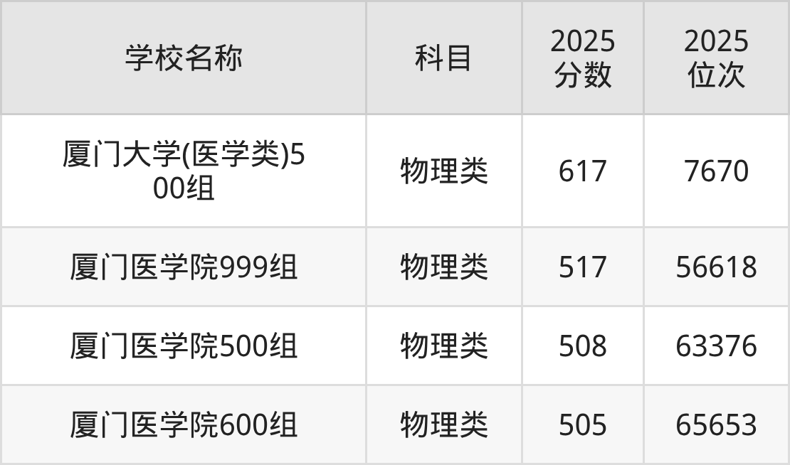 下文为2025年厦门市医科大学在福建物理类录取分数线和位次排名表,供大家参考: