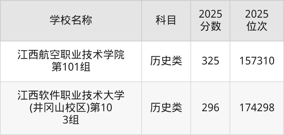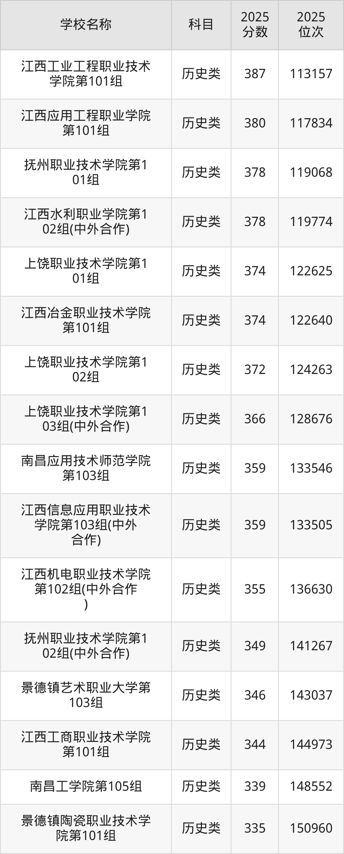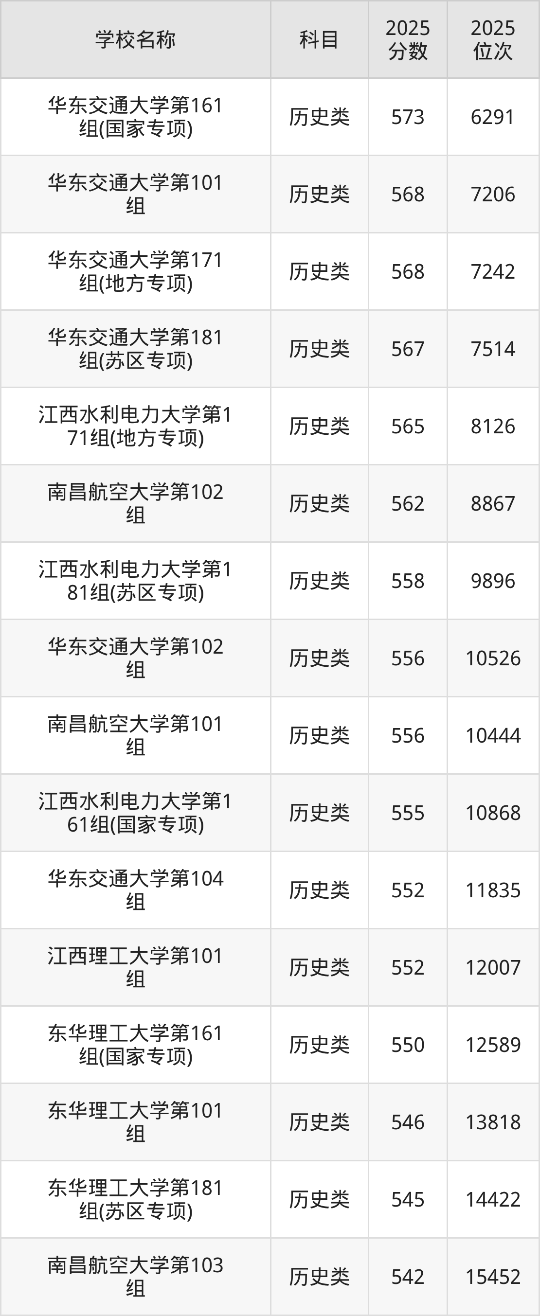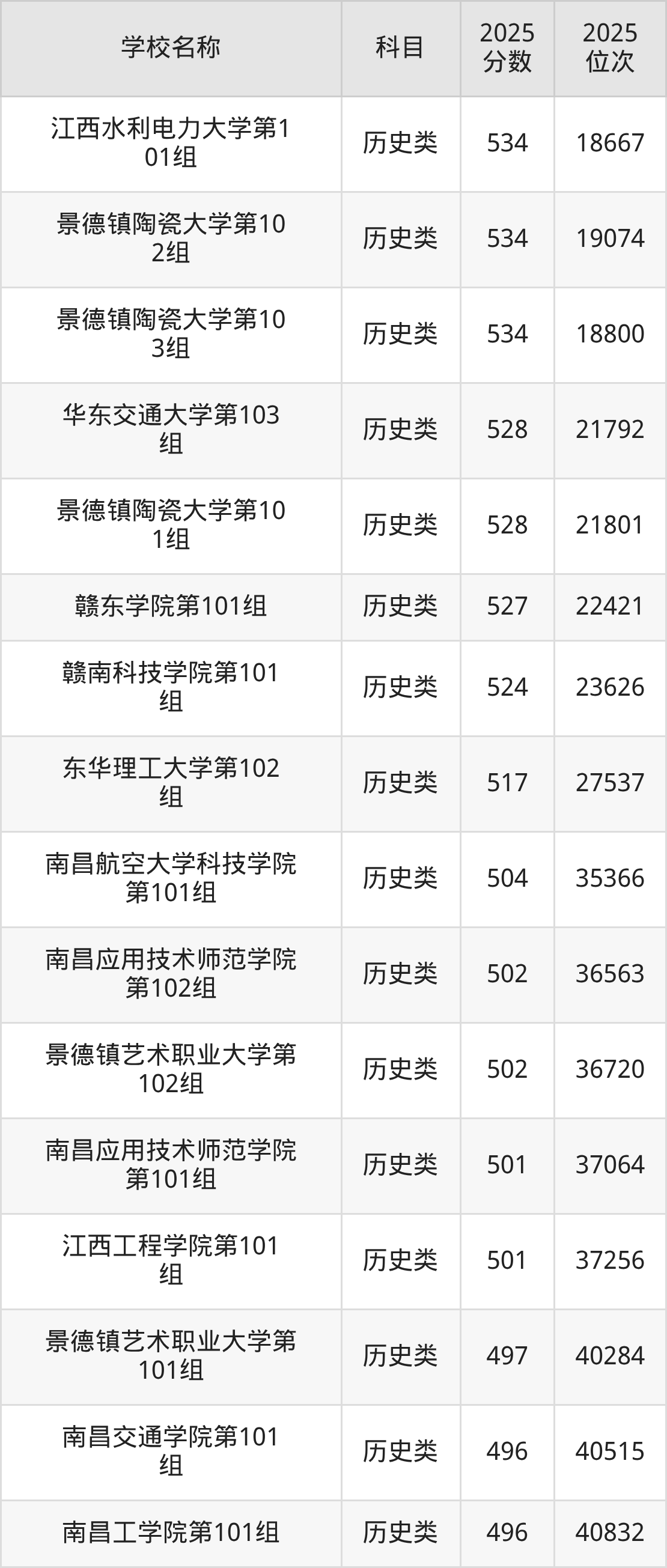 下文为2025年江西省理工类大学在江西历史类录取分数线和位次排名表,供大家参考: