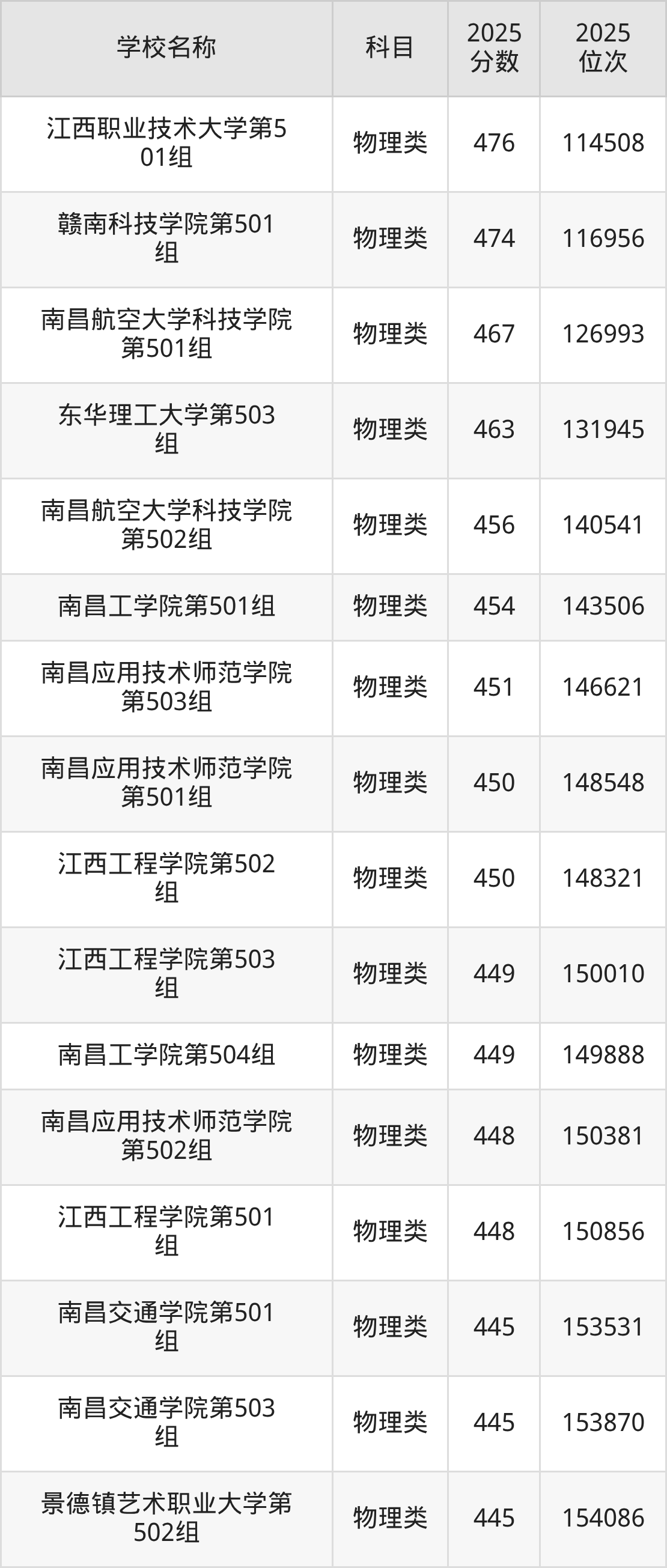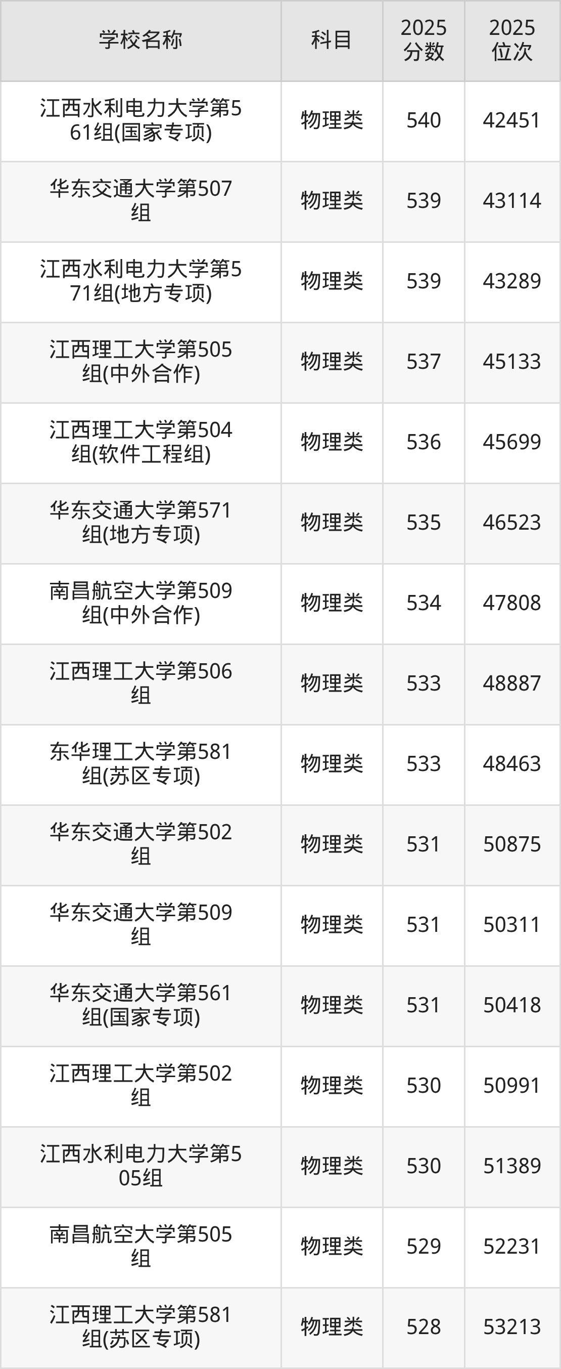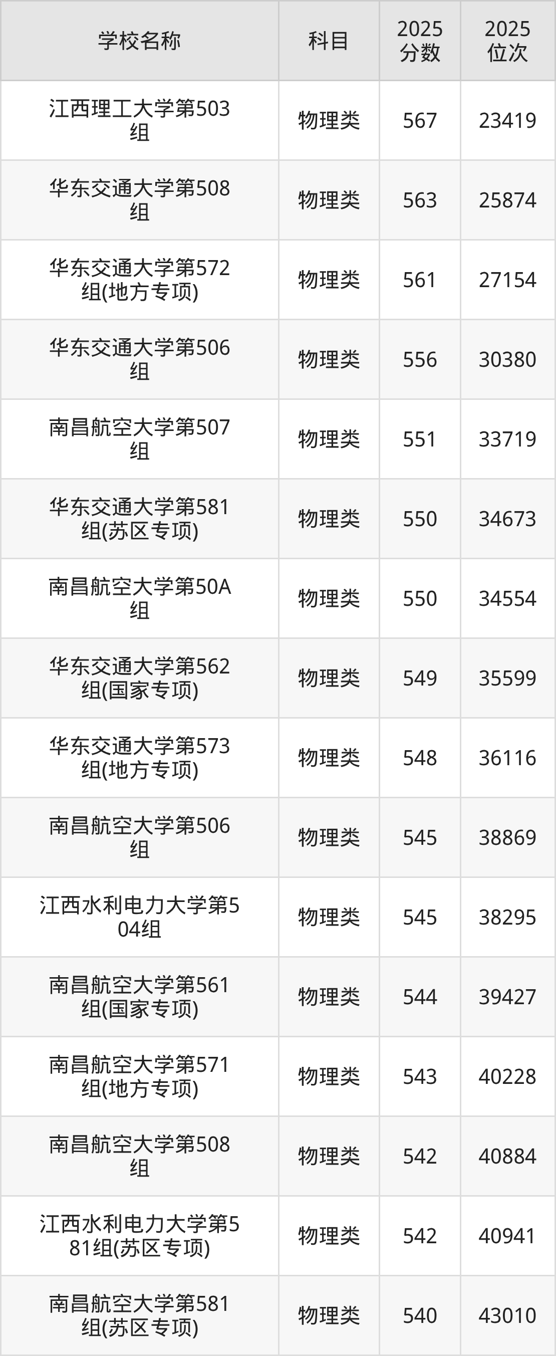 下文为2025年江西省理工类大学在江西物理类录取分数线和位次排名表,供大家参考: