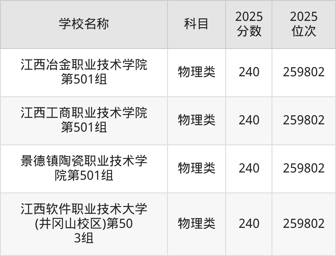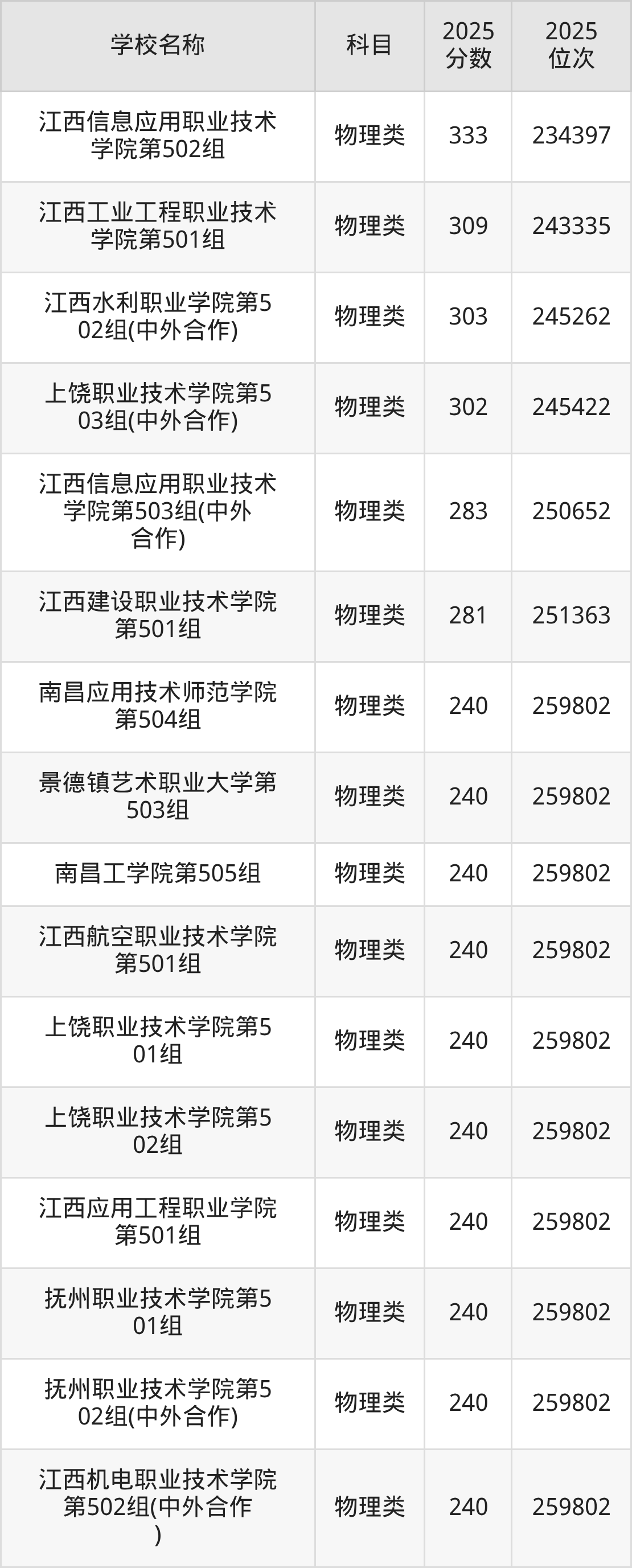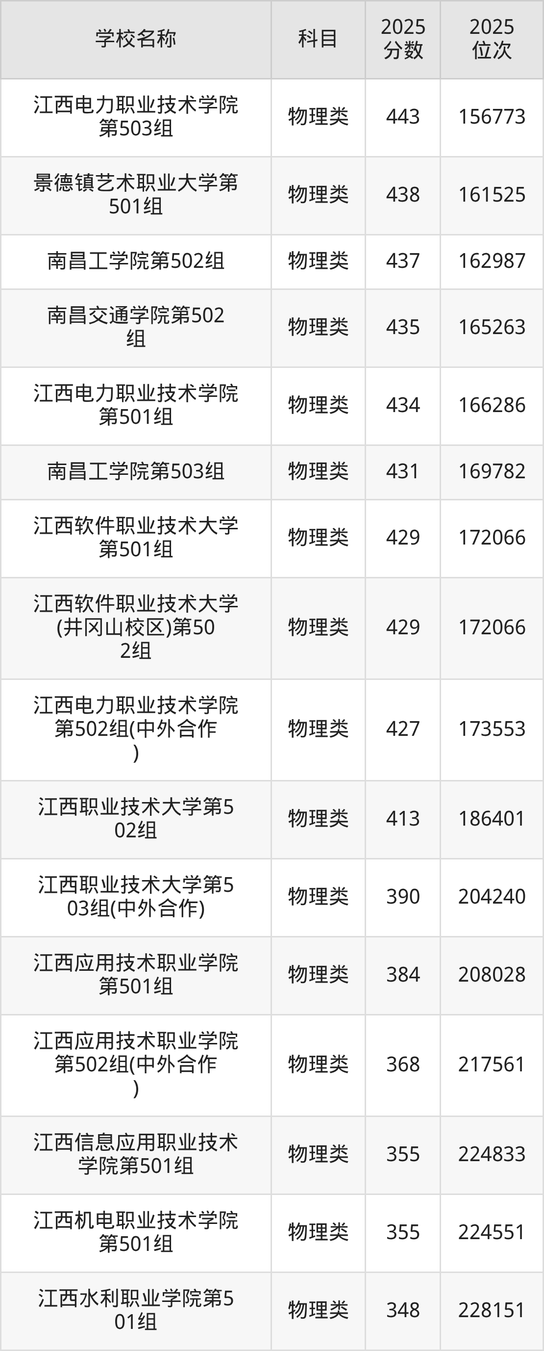下文为2025年江西省理工类大学在江西物理类录取分数线和位次排名表,供大家参考:
