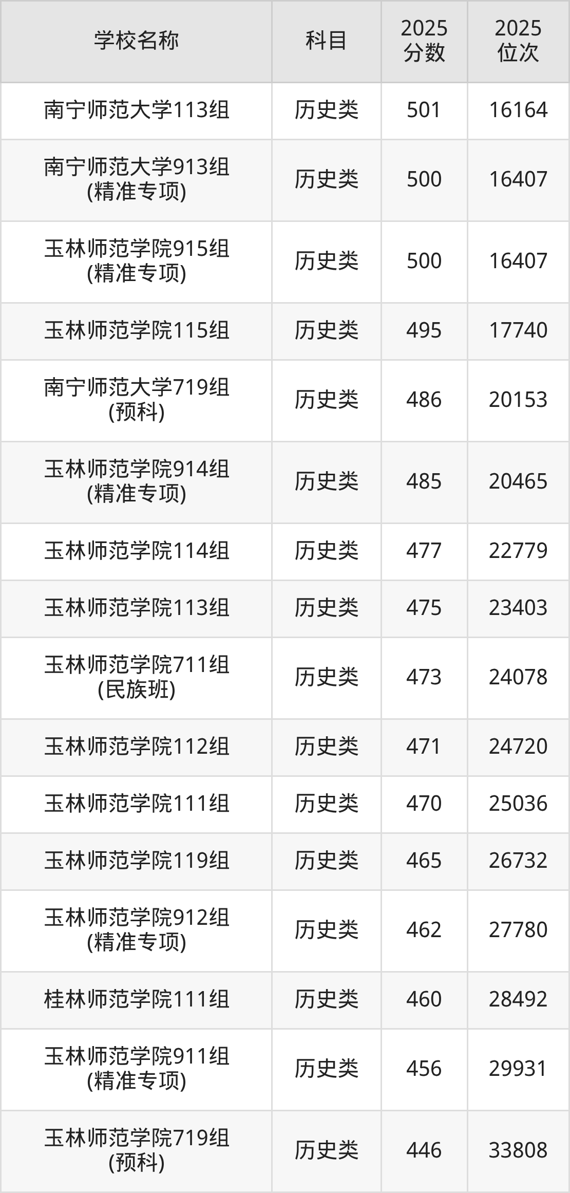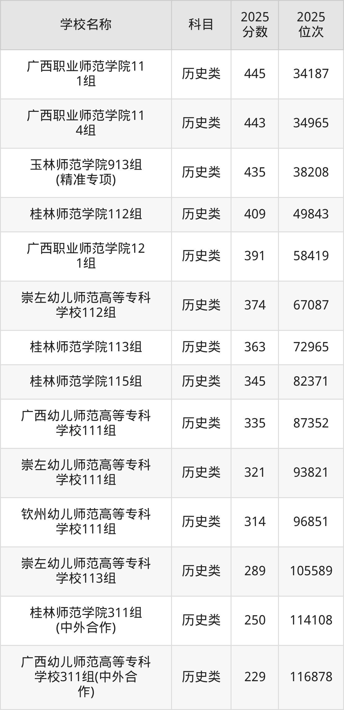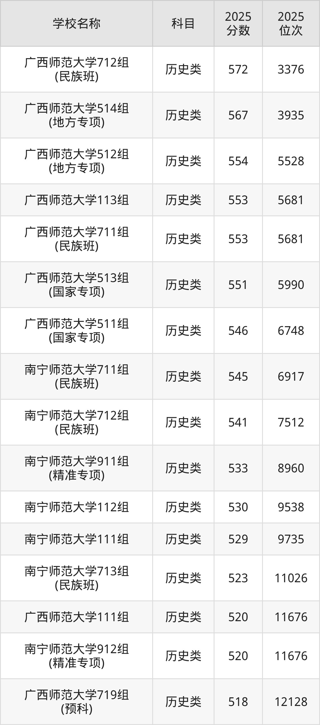 下文为2025年广西壮族自治区师范类大学在广西历史类录取分数线和位次排名表,供大家参考: