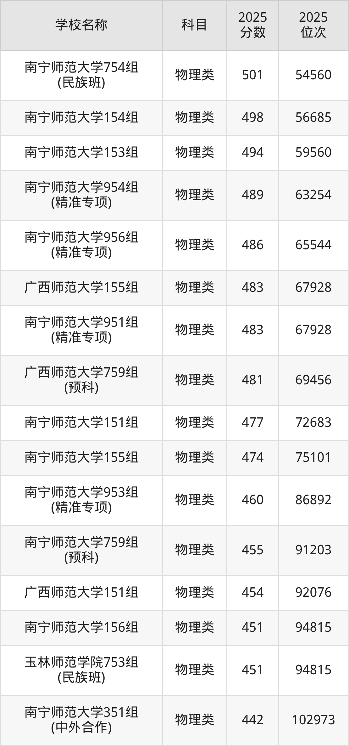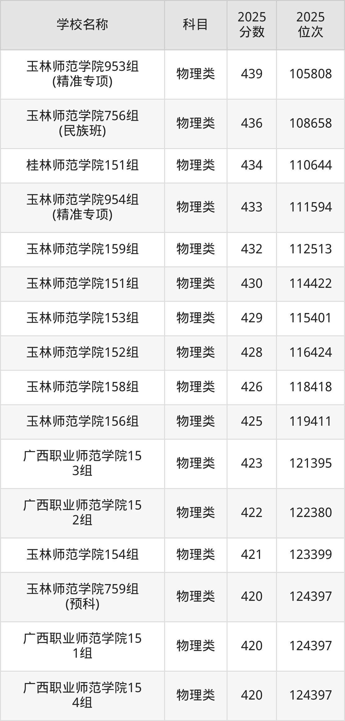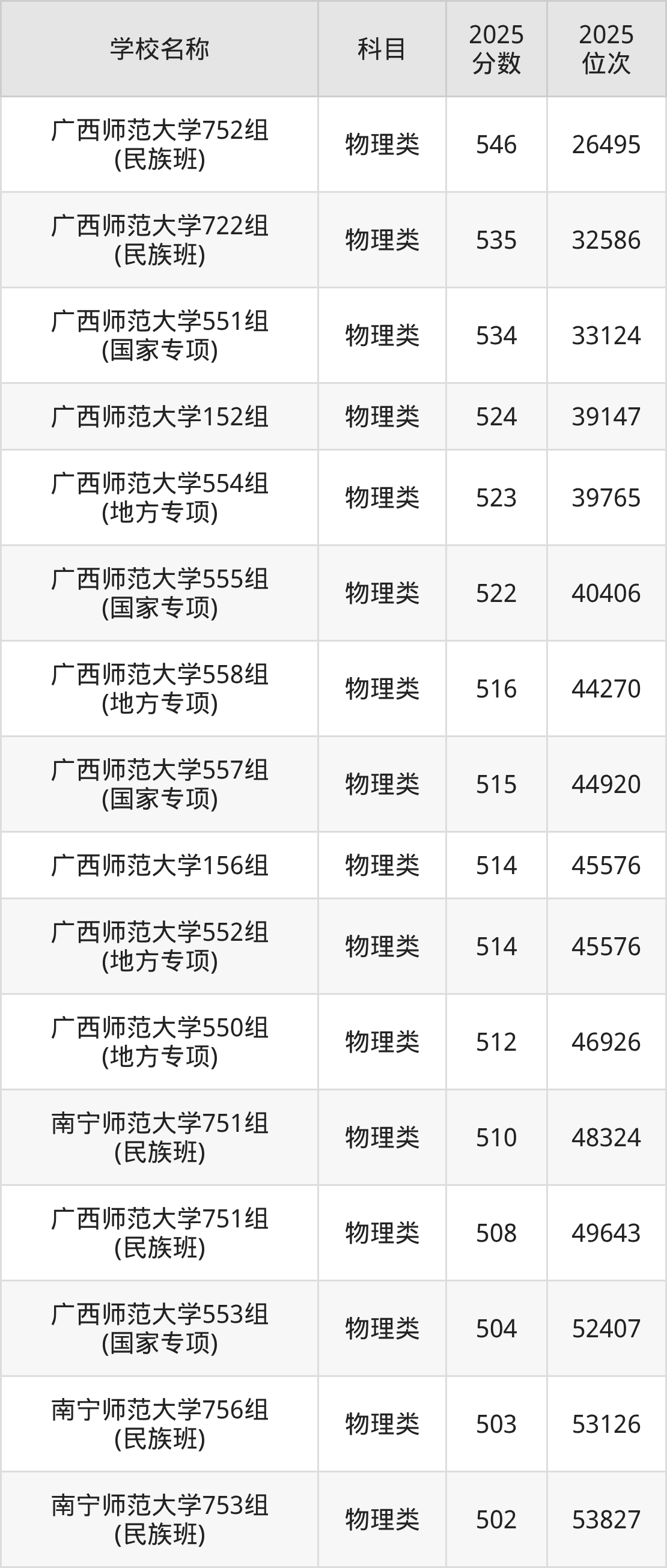 下文为2025年广西壮族自治区师范类大学在广西物理类录取分数线和位次排名表,供大家参考:
