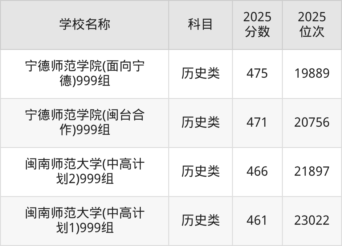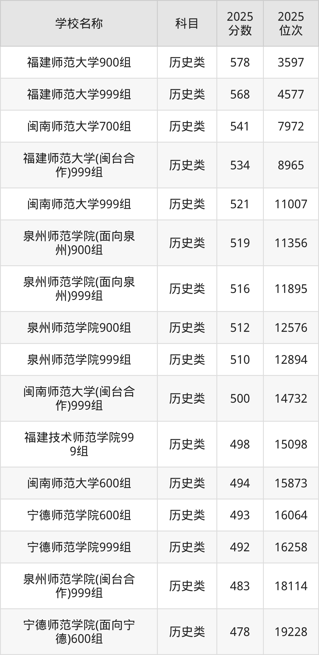 下文为2025年福建省师范类大学在福建历史类录取分数线和位次排名表,供大家参考: